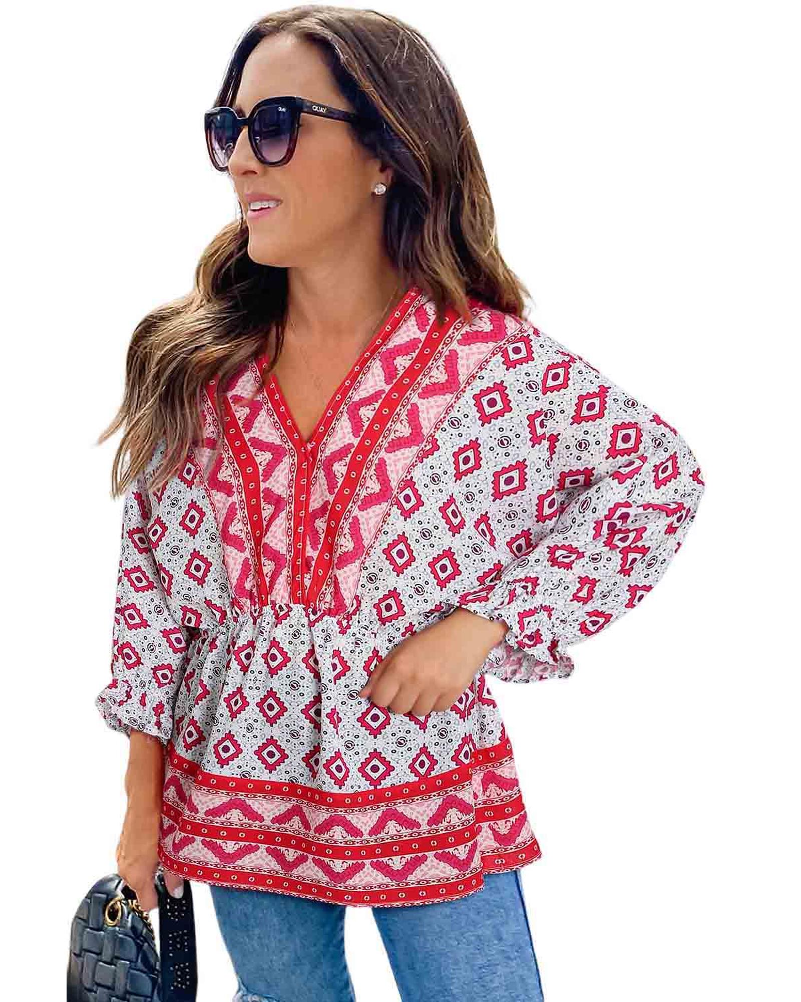 This blouse features a striking geometric print and a flattering shirred waist design, creating a stylish and elegant silhouette. The V-neckline adds a touch of sophistication, making it suitable for various occasions. Crafted from lightweight fabric, it offers comfort for all-day wear and is a versatile addition to any wardrobe.
