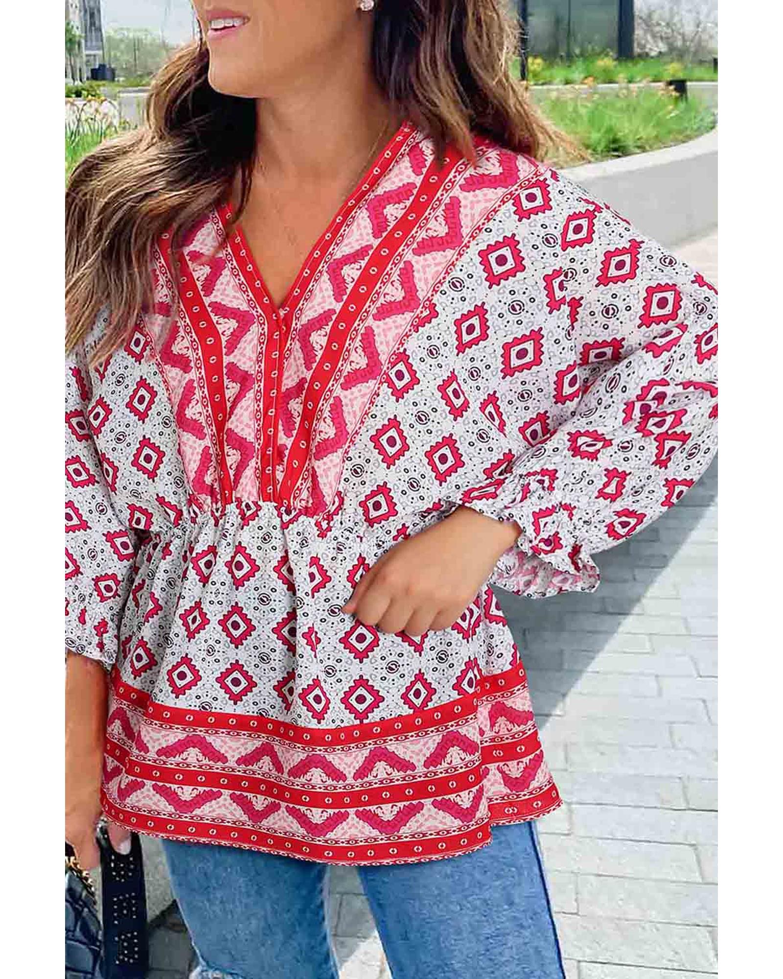 Red Geometric Print 3/4 Sleeve V-Neck Shirred Waist Flared Blouse – L