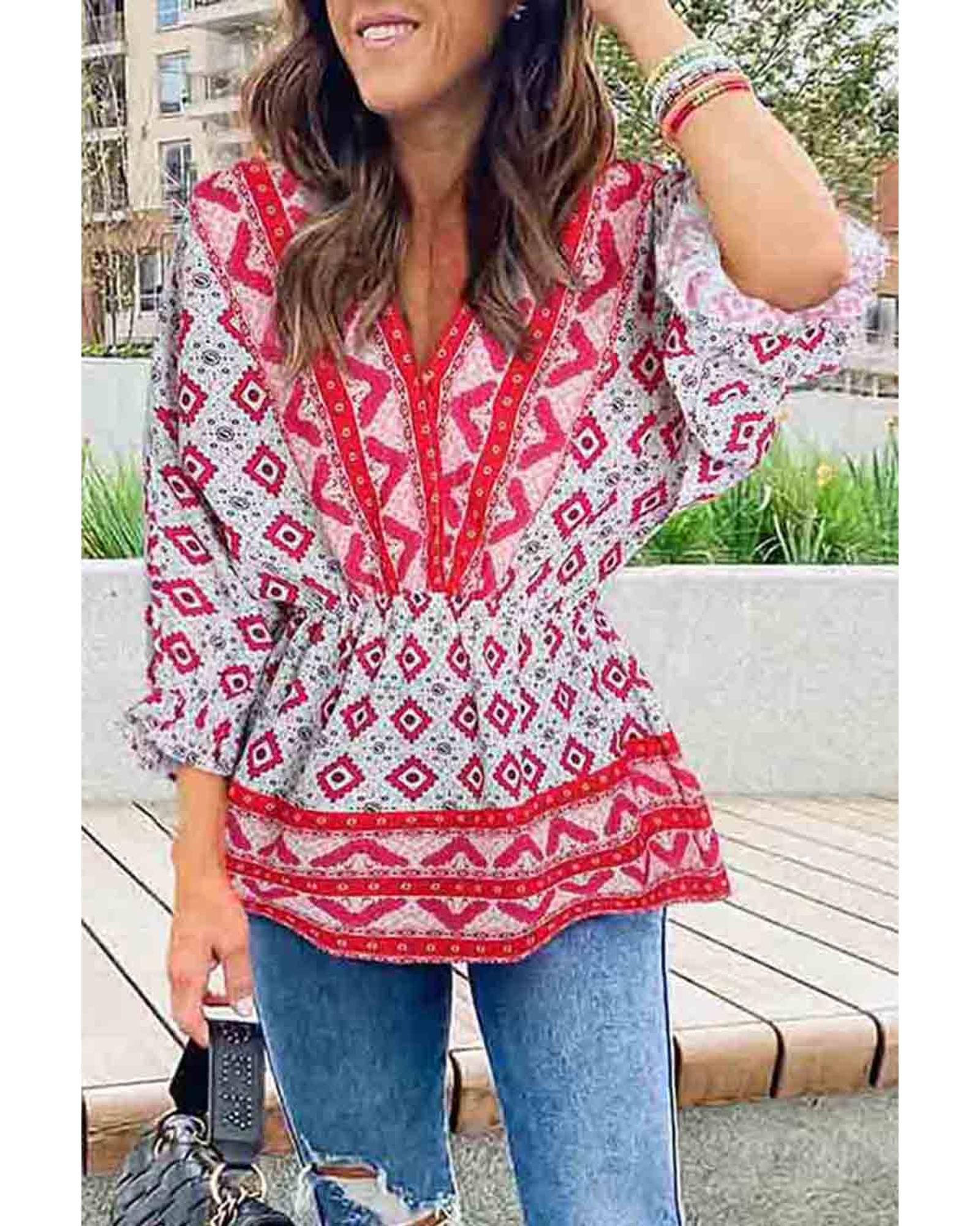 Red Geometric Print 3/4 Sleeve V-Neck Shirred Waist Flared Blouse – XL