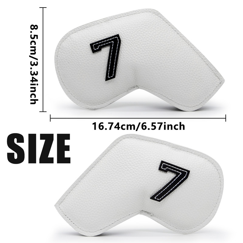 This set of golf iron head covers offers a stylish and protective solution for your golf clubs. Made from durable waterproof PU leather, these covers safeguard your clubs from scratches, impacts, and the elements. The embroidered numbers on each cover allow for quick and easy club identification, combining practicality with an elegant appearance.