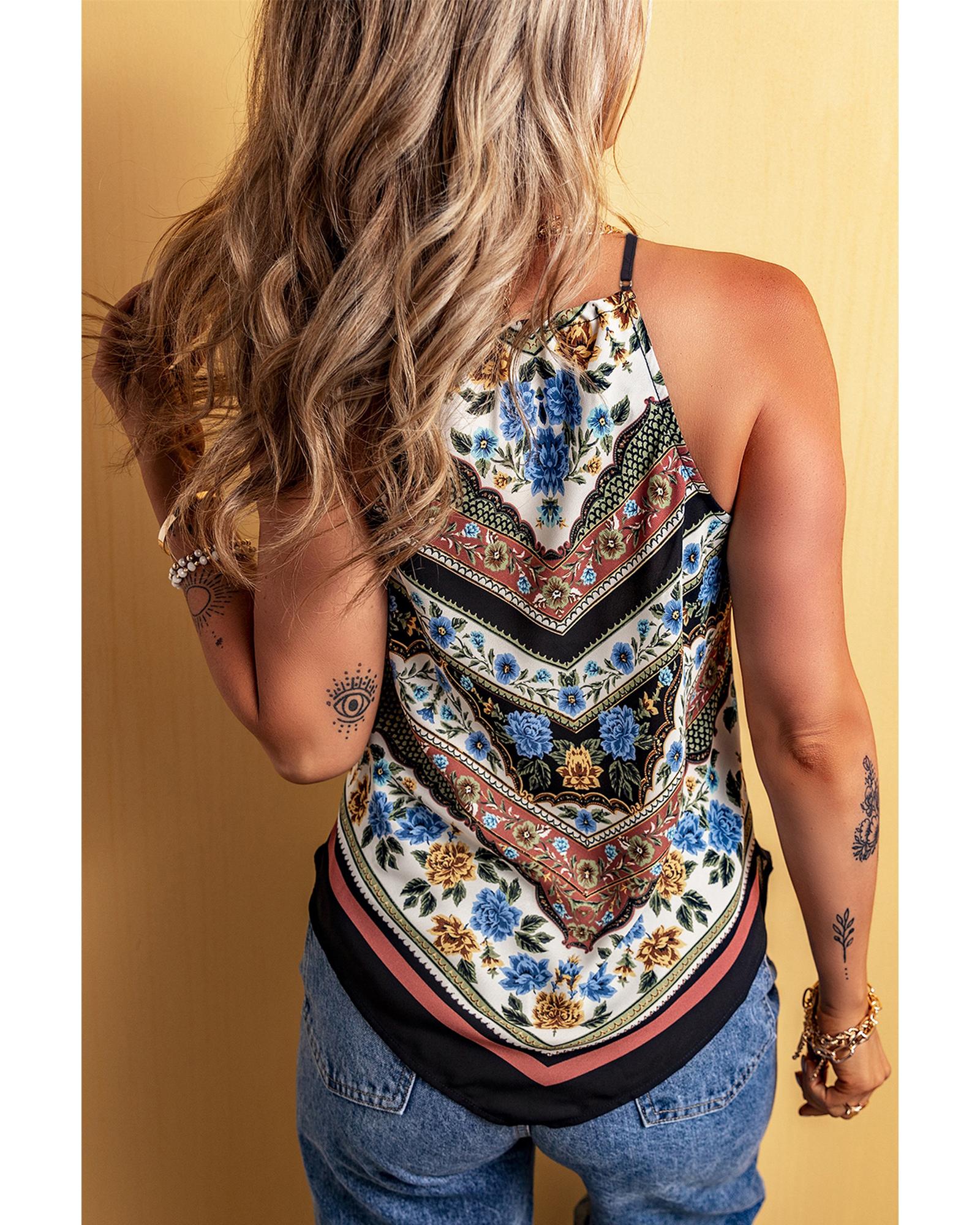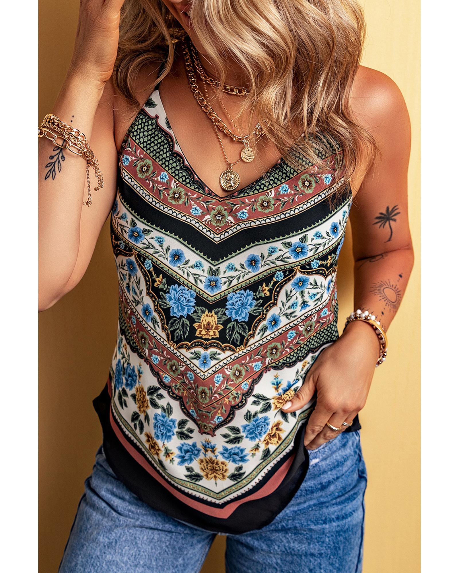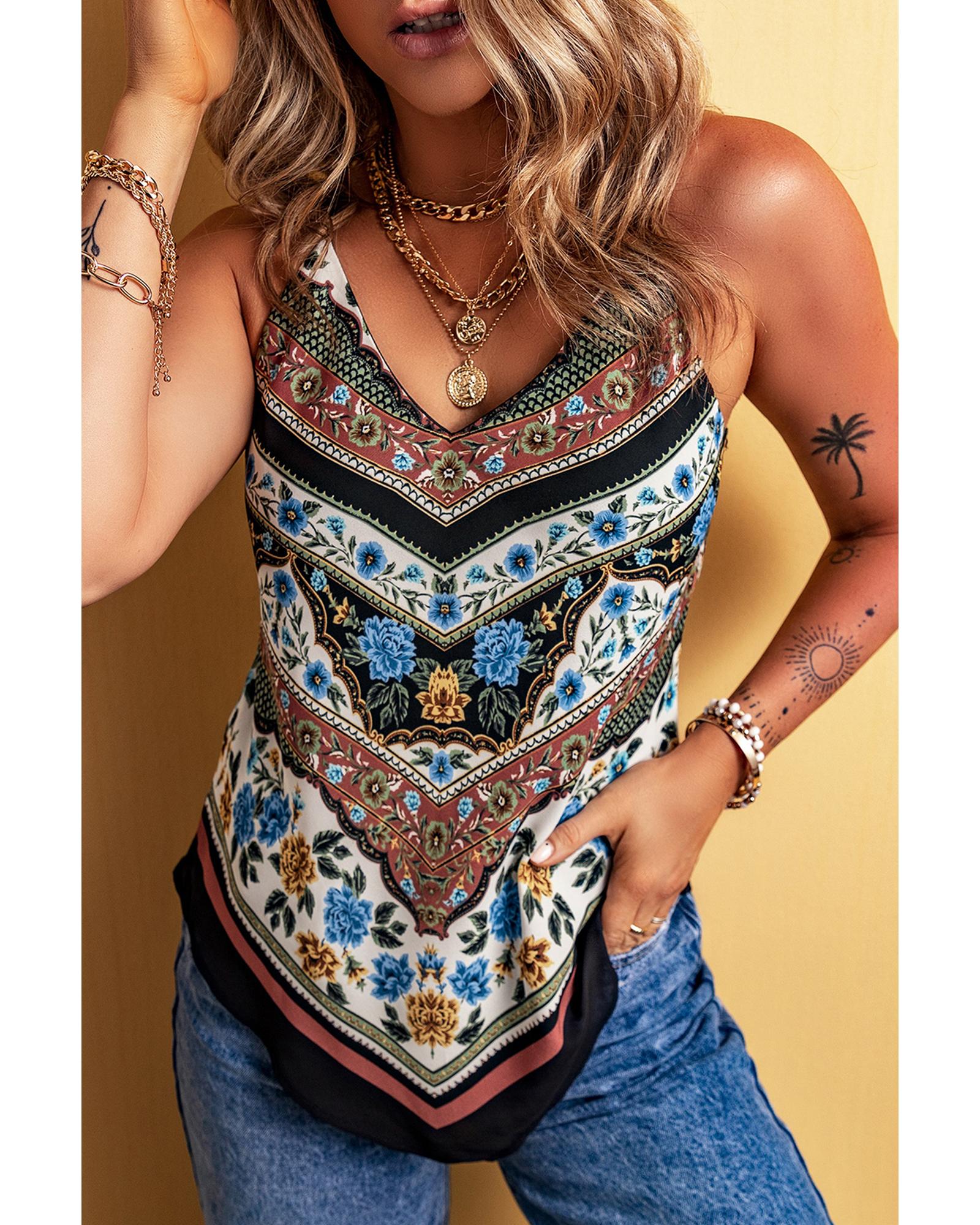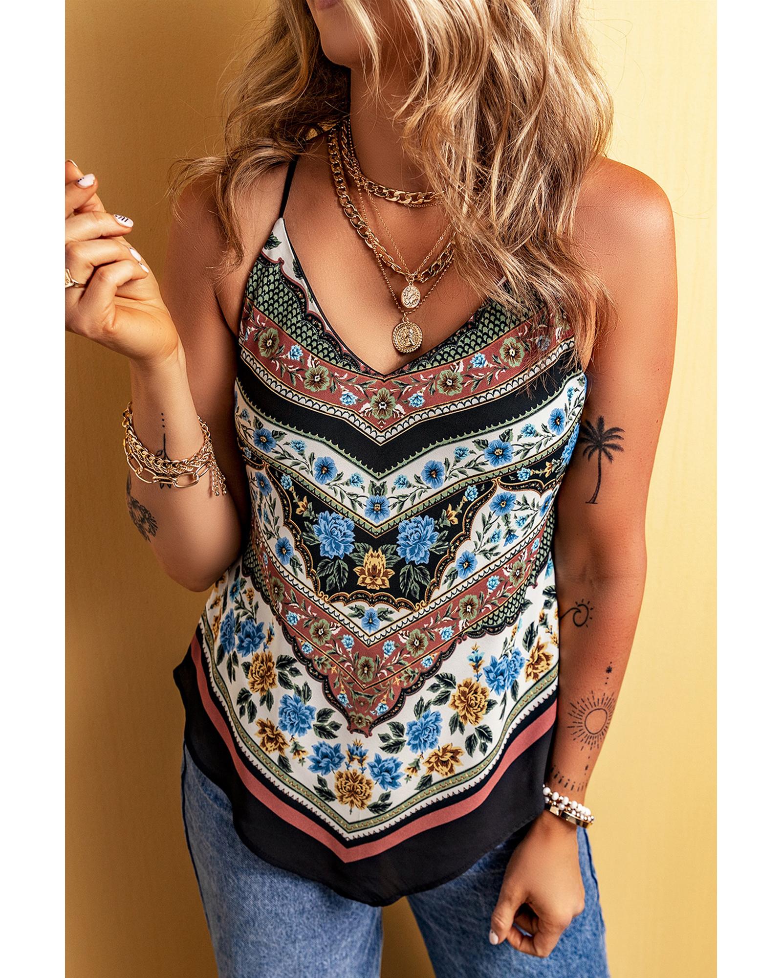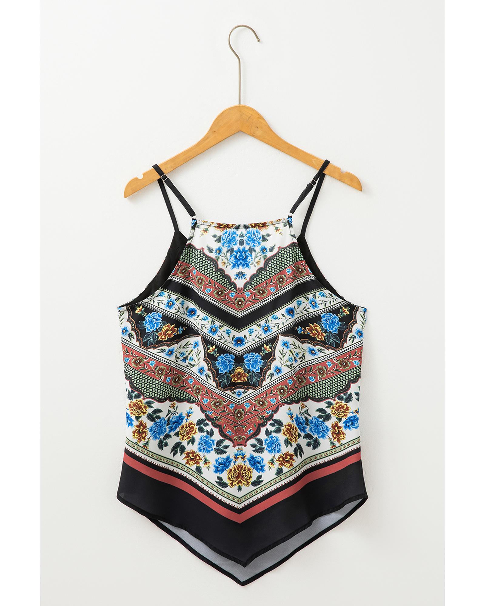 This tank top features a vibrant red mixed floral chevron pattern with a stylish dip hem design. It is crafted from soft, lightweight fabric, providing a comfortable fit for everyday wear. The spaghetti straps and V-neckline add a touch of elegance, while the slim fit silhouette enhances the overall look.