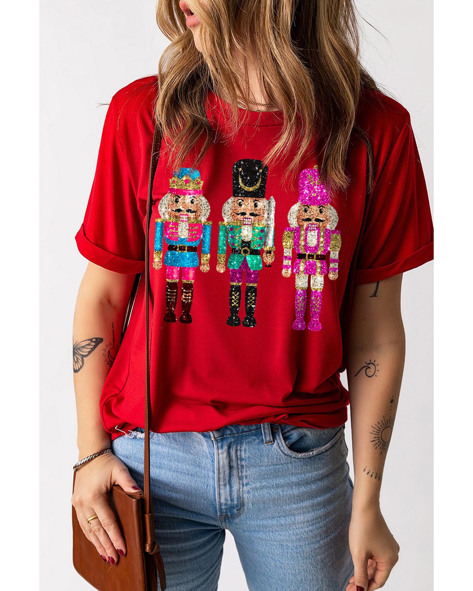This printed crewneck T-shirt features a festive nutcracker design, making it a perfect choice for holiday celebrations. Its trendy fitted style offers a comfortable and stylish look suitable for casual wear. The shirt is versatile and easy to pair with jeans or shorts for a relaxed outfit.