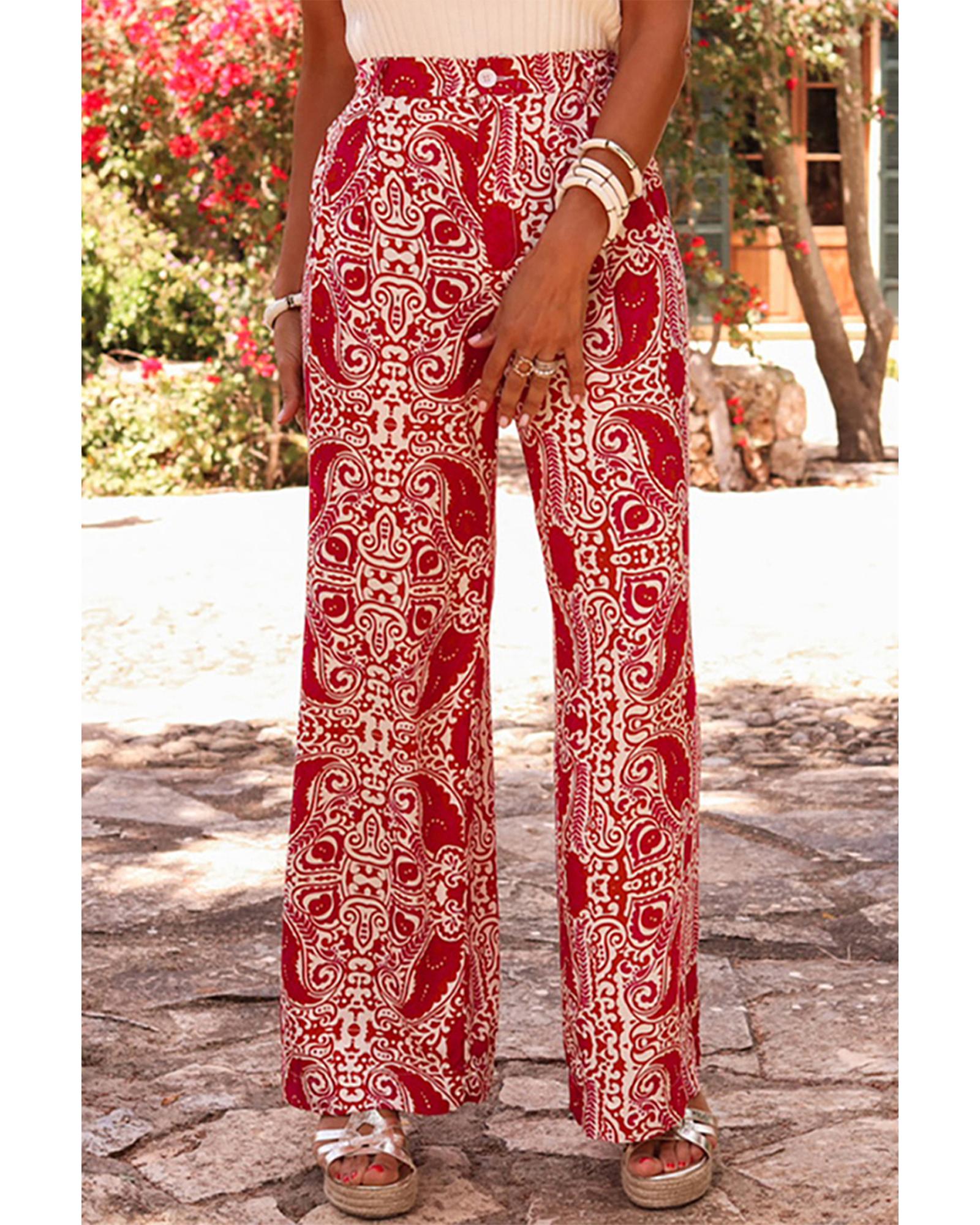 Red Paisley Printed Buttoned High Waist Straight Leg Pants – S