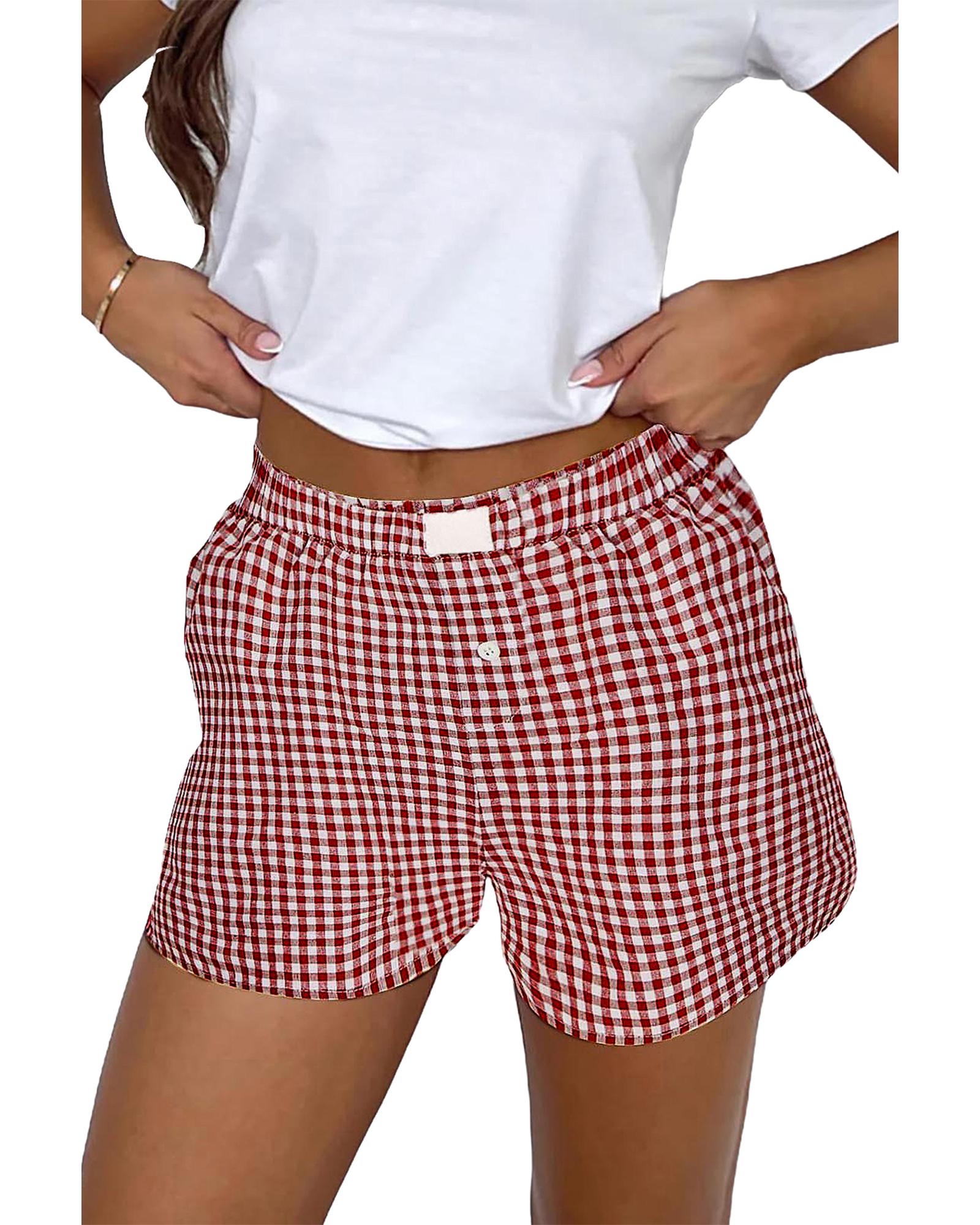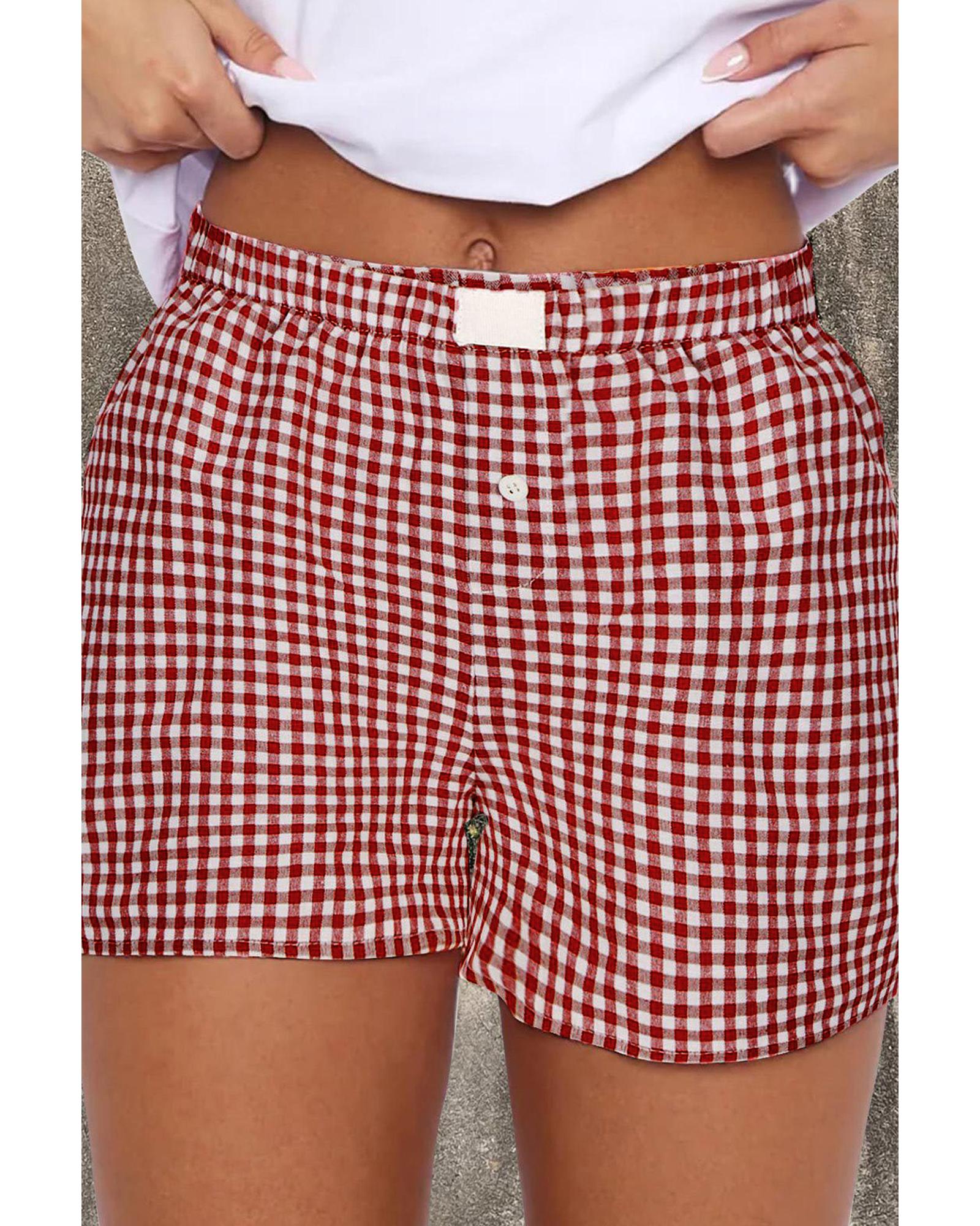 This pair of high waist shorts features a stylish red plaid gingham print, designed for a trendy and fitted look. Made from lightweight polyester fabric, they offer comfort and a fashionable appearance suitable for various casual outfits.