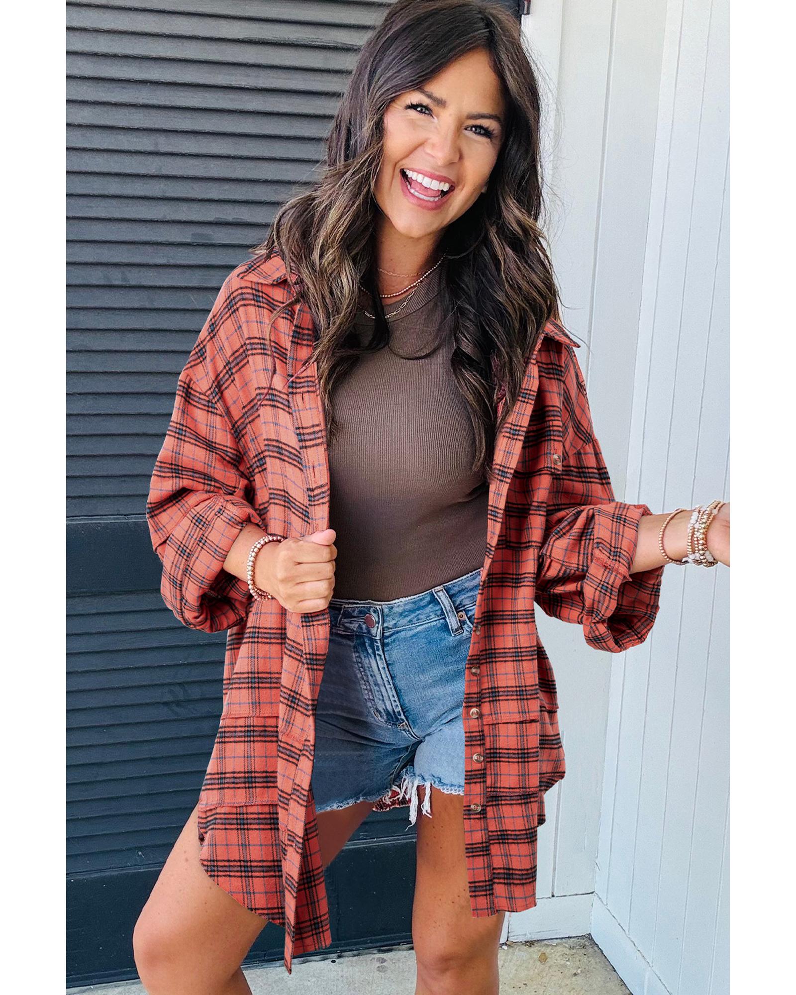 This long sleeve shirt features a classic plaid pattern combined with a relaxed fit and stylish distressed hem. Its oversized design with side slits and a rounded hemline offers a trendy and comfortable look suitable for various casual occasions.