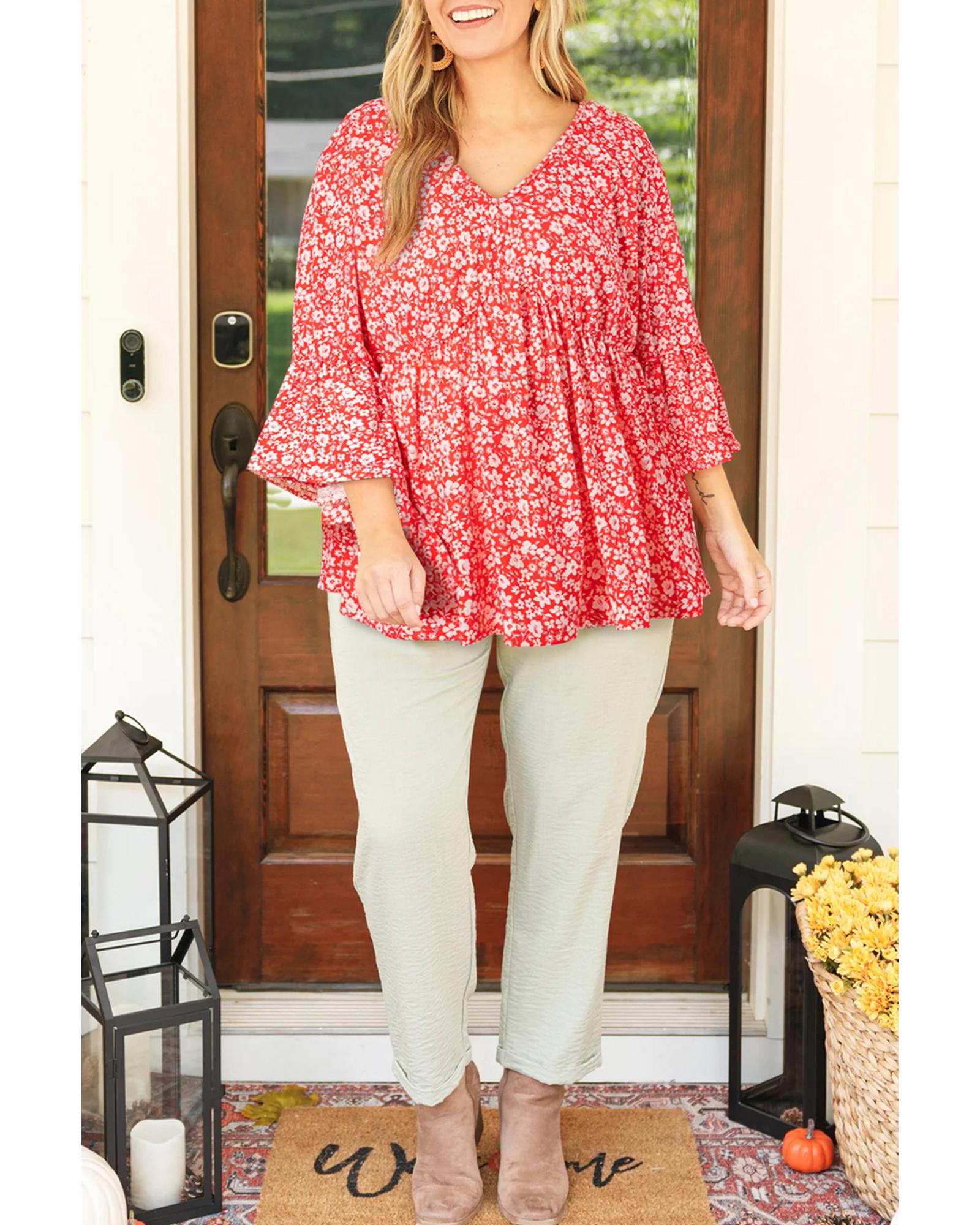 This plus size floral blouse features a trendy fitted design with an elegant babydoll silhouette. It is detailed with a subtle floral pattern and a V neckline that adds a touch of allure. The flared bracelet sleeves contribute to a graceful appearance, while the flowy fit ensures both comfort and style. Suitable for various occasions, this blouse combines fashion and ease of wear.