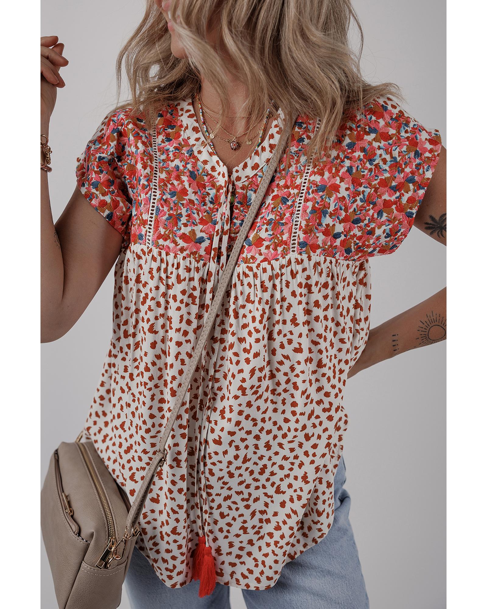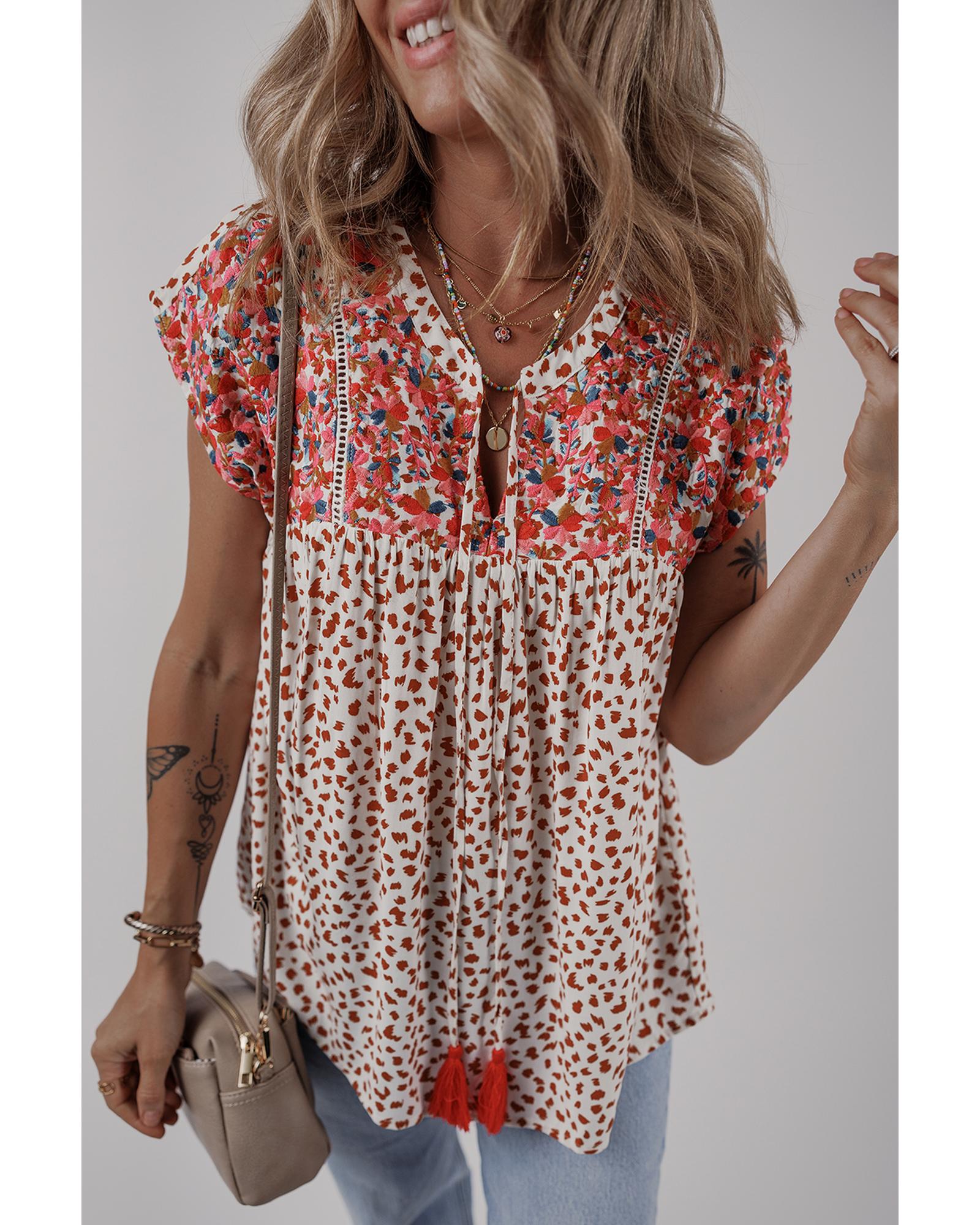 This blouse features a vibrant red print with intricate embroidery details, offering a stylish and comfortable option for warm weather. Its design includes a chic tie neckline and a relaxed fit, making it suitable for various casual occasions.