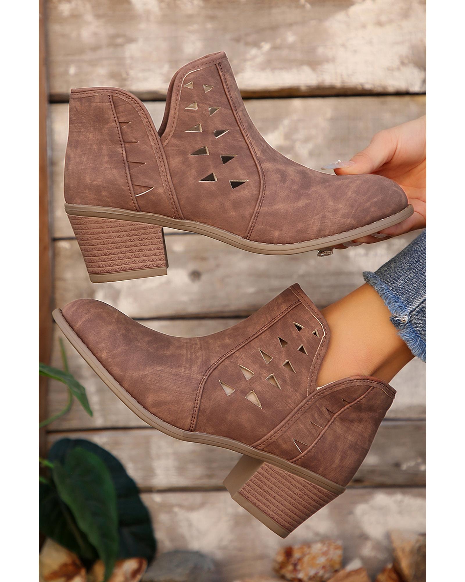 These red sandalwood cut-out suede ankle boots feature a pointed toe design and a heeled construction, offering a stylish and sophisticated look suitable for both day and night wear. Crafted from luxurious suede material, they add a touch of elegance to any outfit. The boots are designed with a trendy fitted silhouette that enhances your overall style.