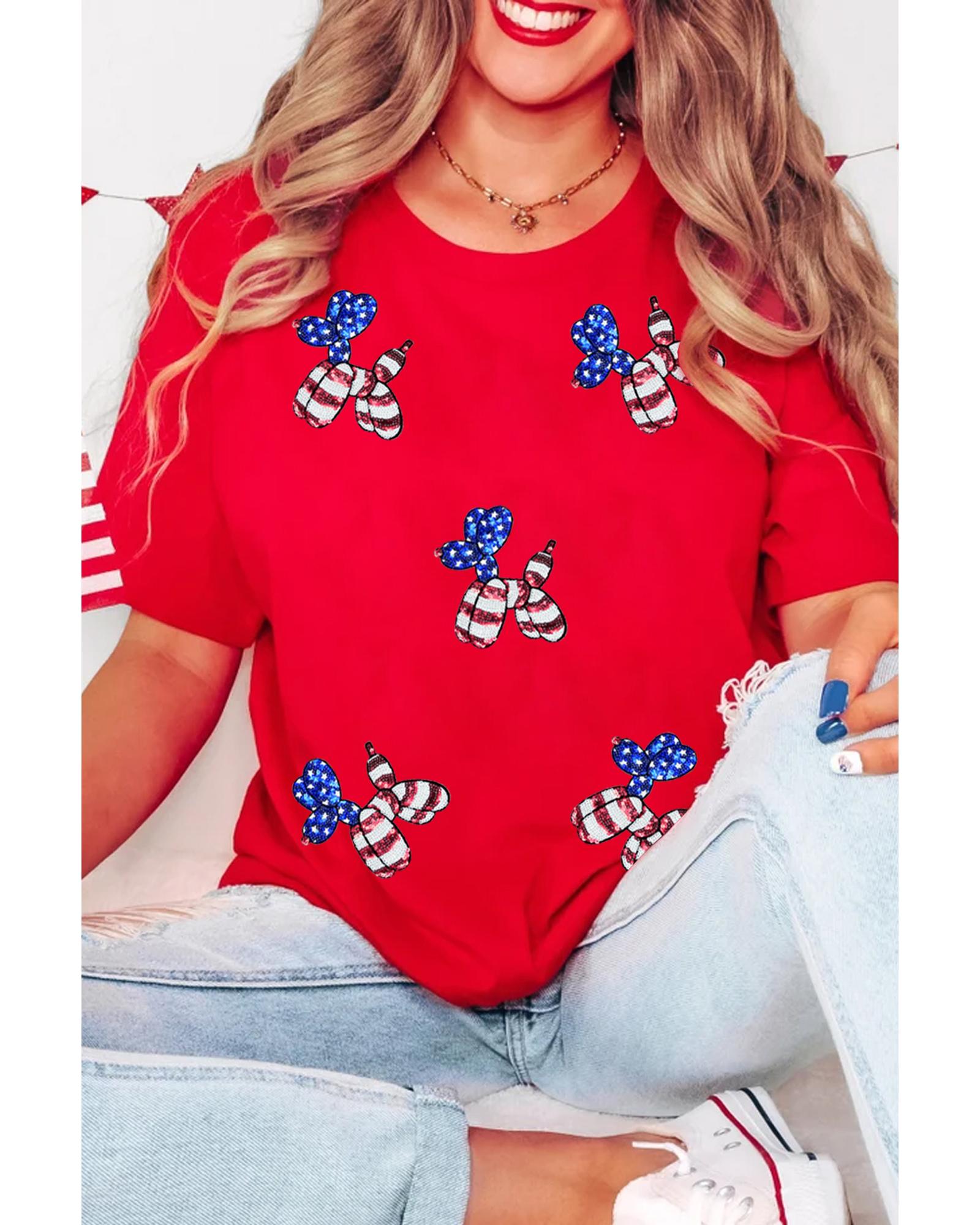 This patriotic crewneck tee features a sequin balloon puppy graphic complemented by a stars and stripes design. It is designed for casual wear, offering a relaxed fit suitable for various occasions, including Independence Day or everyday use.