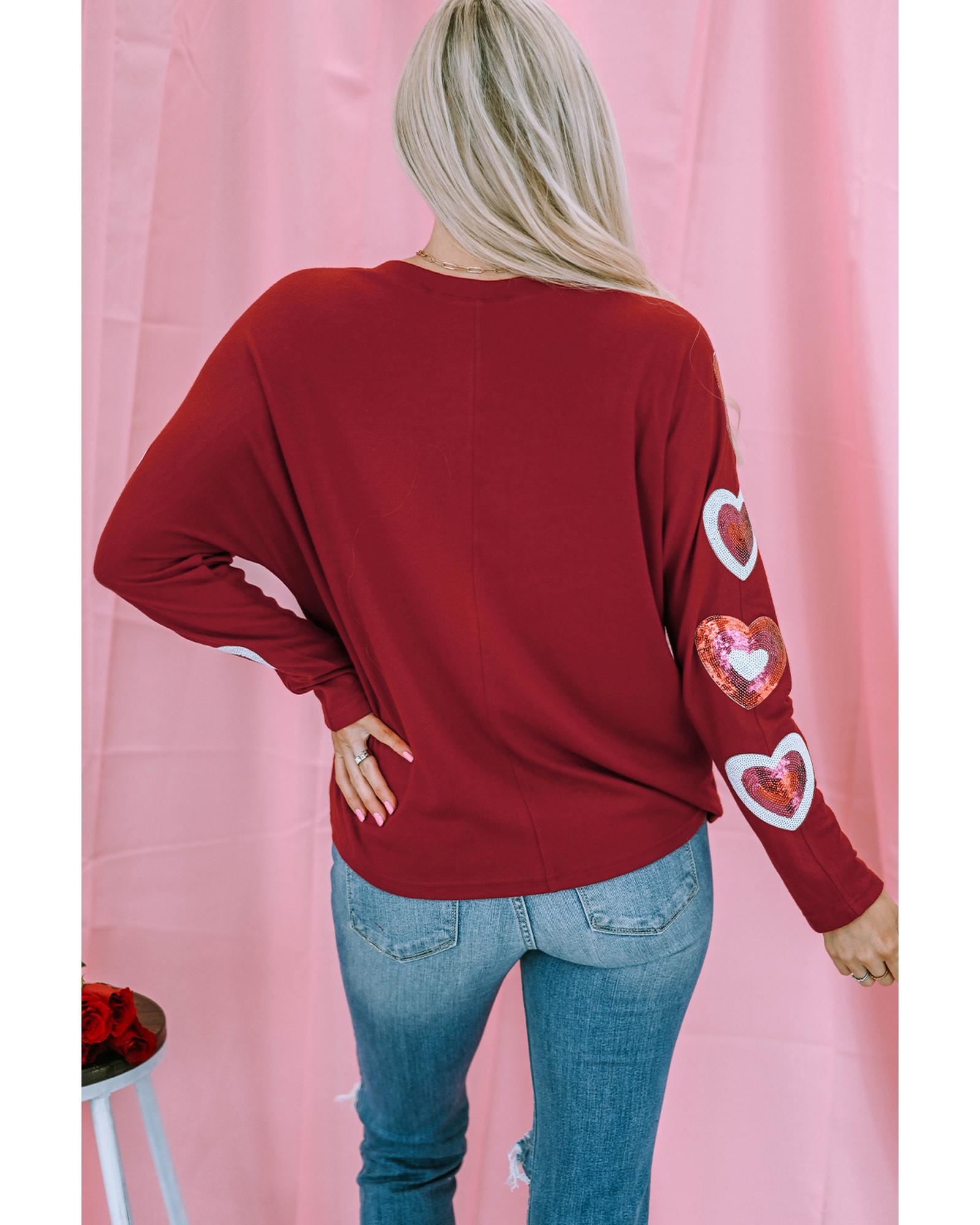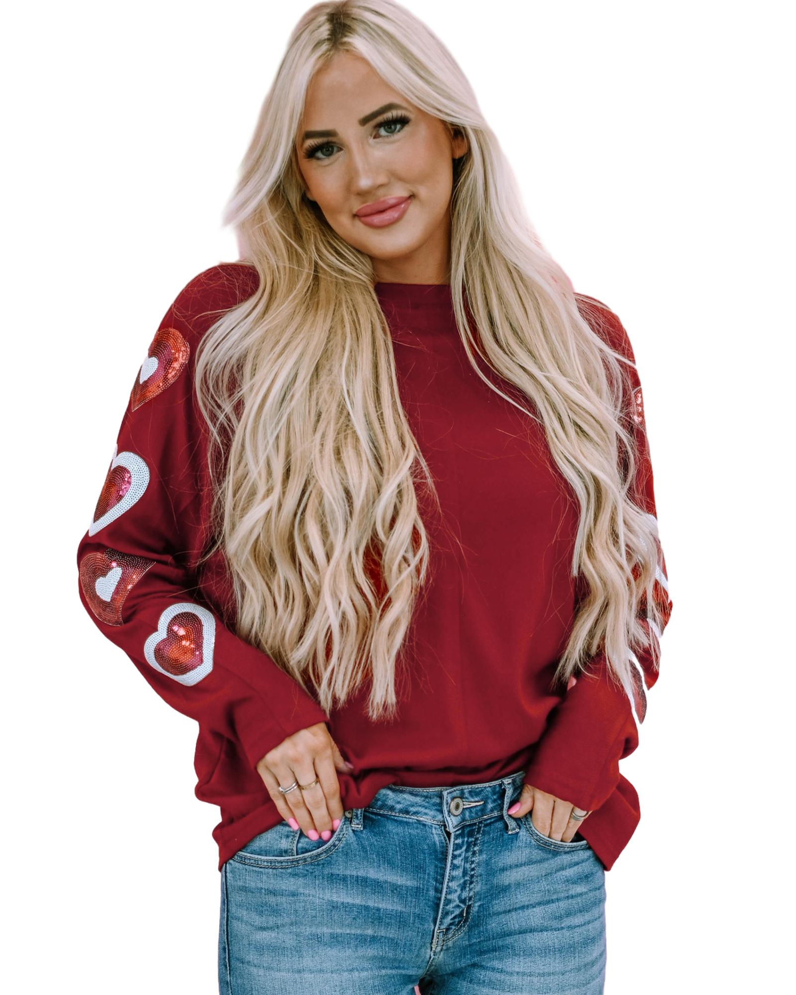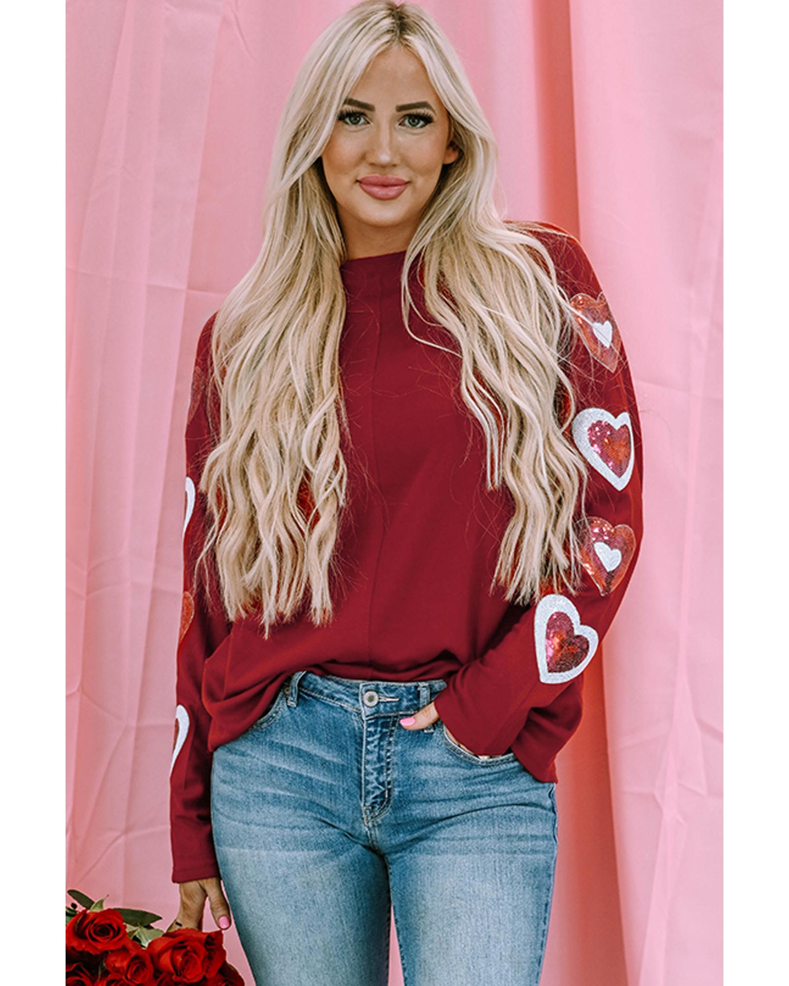 This fashionable top features a trendy fitted design with eye-catching red sequined heart printed sleeves, making it perfect for special occasions or stylish everyday wear. The shiny heart prints add a playful and romantic touch to the overall look. Available in a range of sizes from S to 2XL, it offers a comfortable fit for various body types.