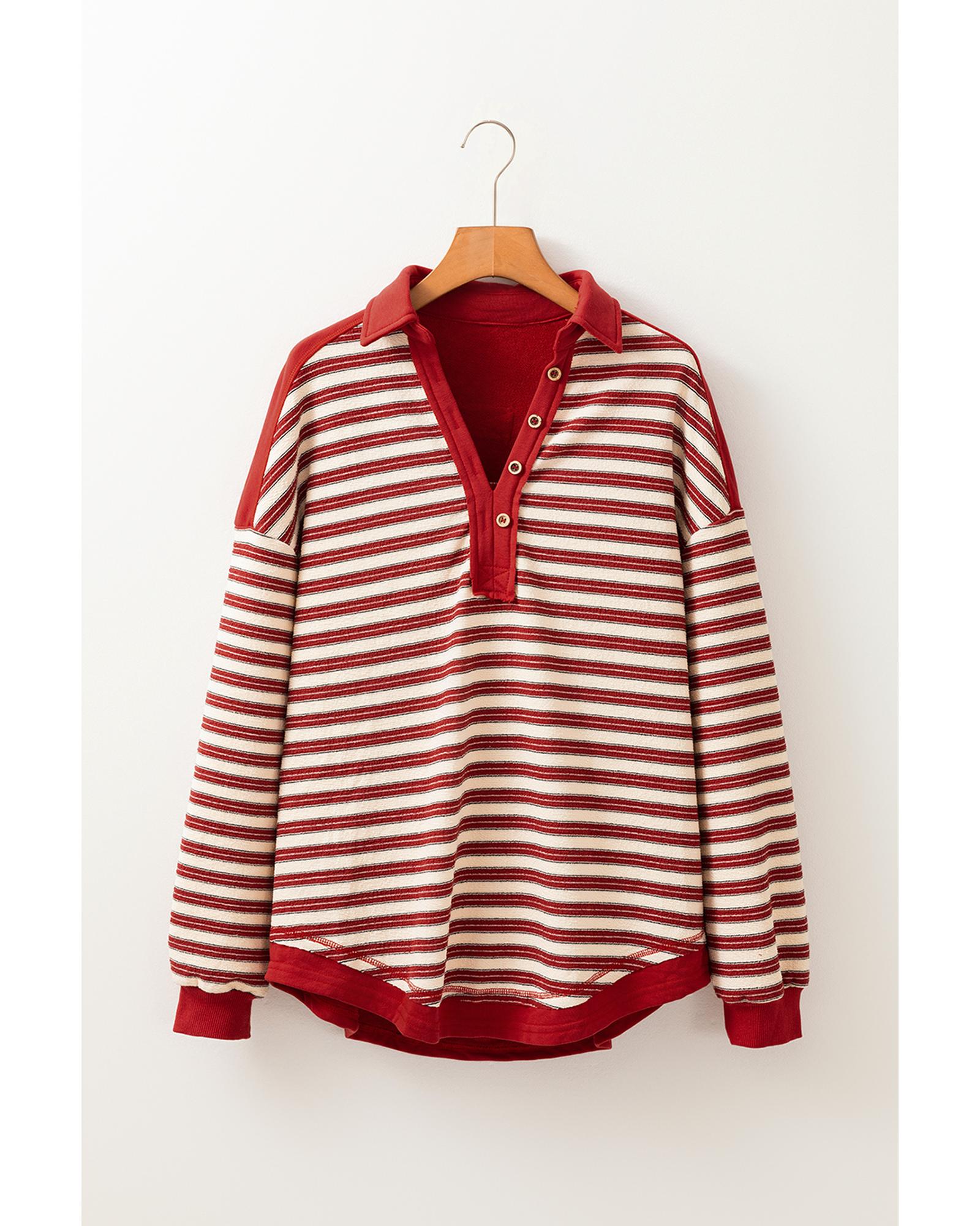 This stylish drop shoulder top features a classic striped pattern and a V-neck with buttoned detail, offering a relaxed yet fashionable look. Its collared design and versatile style make it suitable for pairing with various bottoms, making it a great addition to your wardrobe.