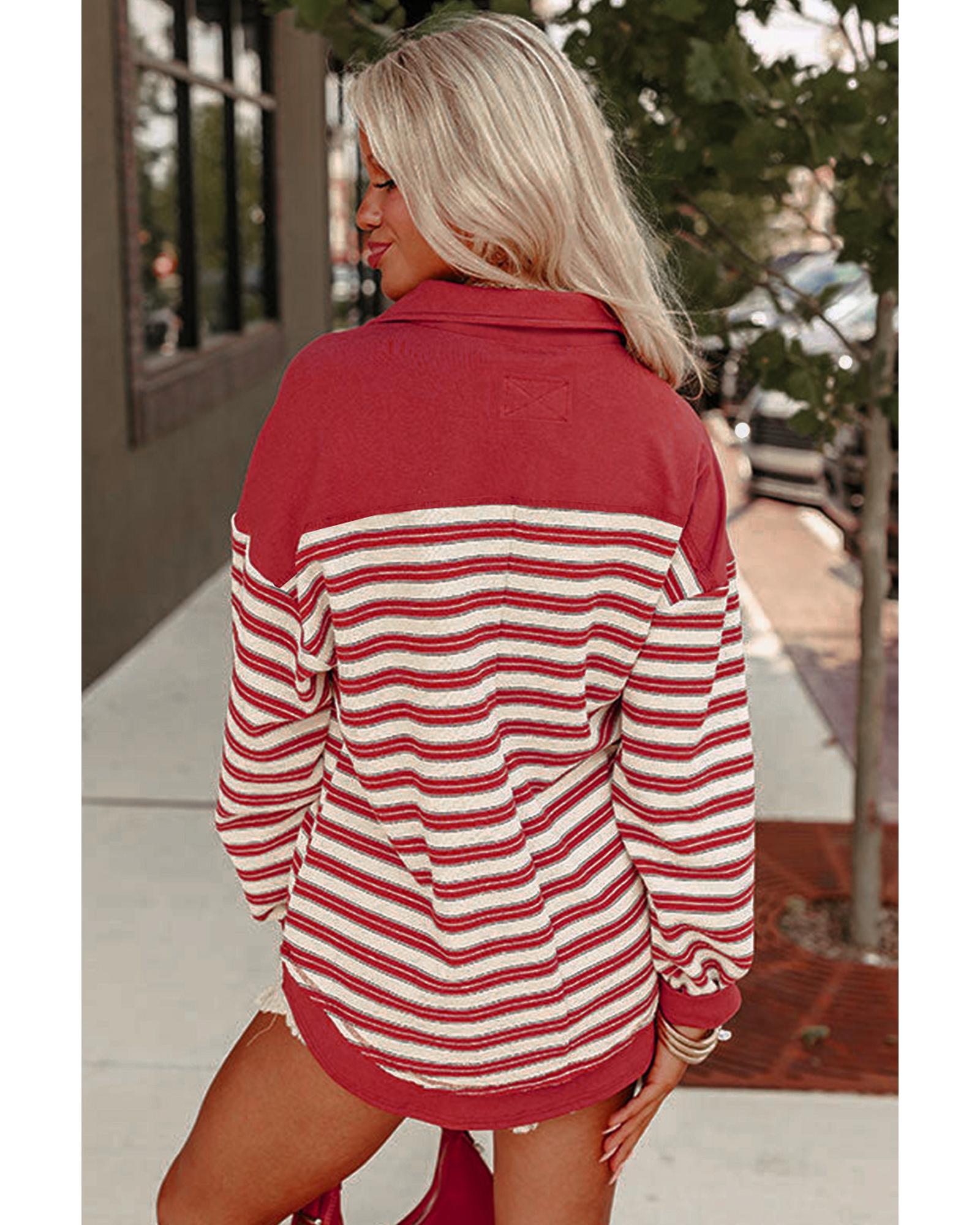 Red Stripe Buttoned V Neck Collared Drop Shoulder Top – XL