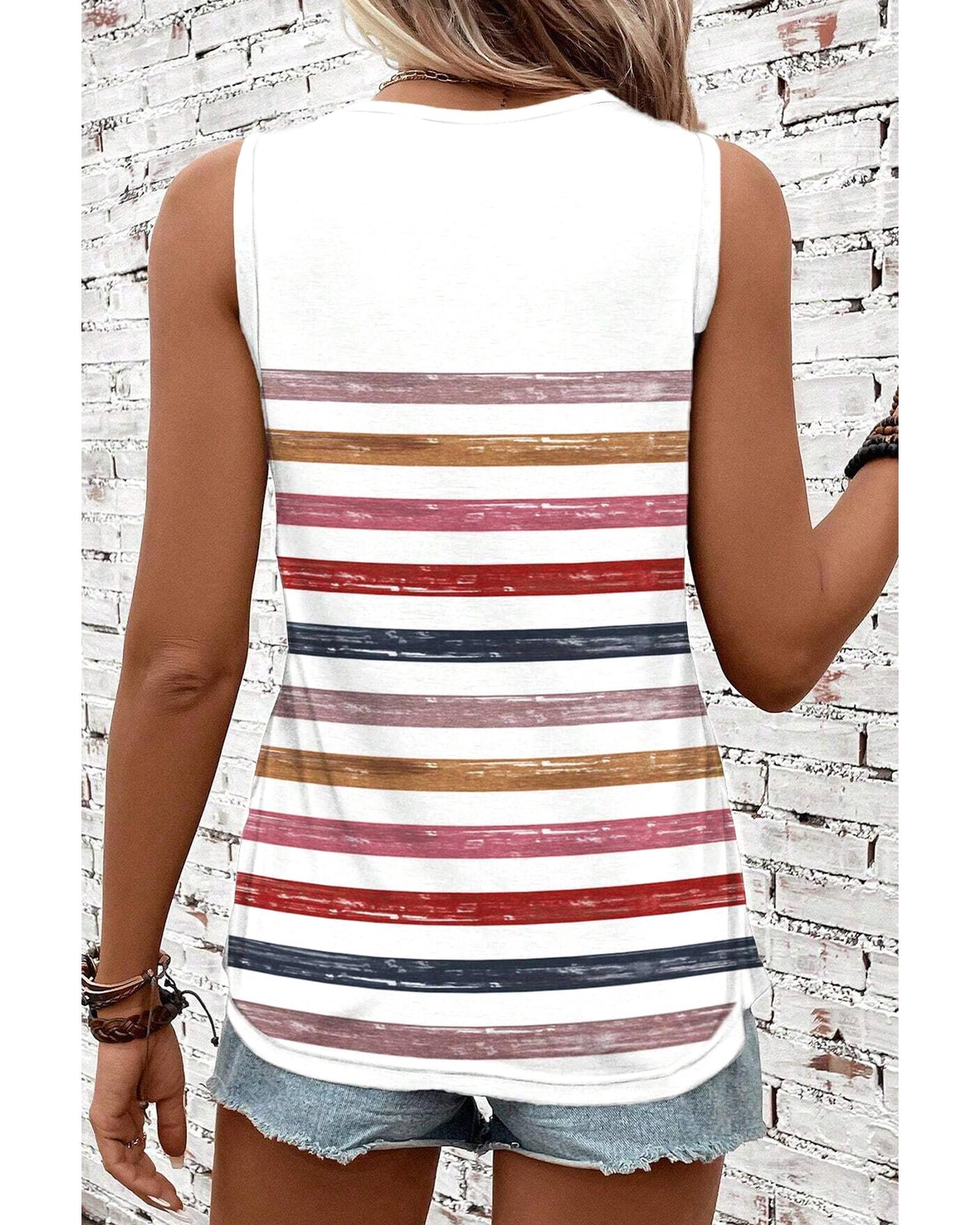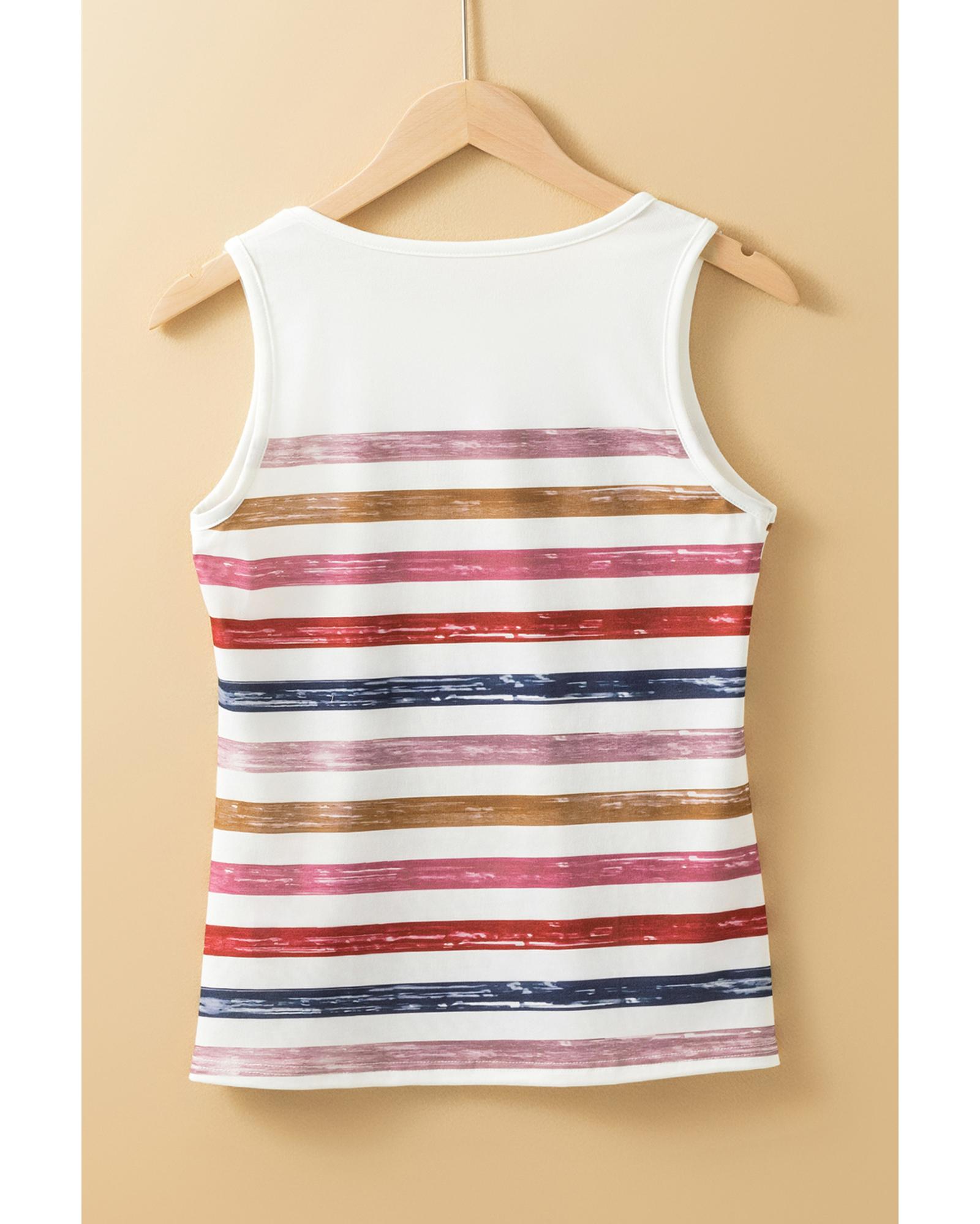 This sleeveless round neck tank top features a vibrant rainbow stripe design, offering a stylish and comfortable option for casual wear. Its classic crew neck and regular fit provide a flattering silhouette, making it suitable for various occasions.