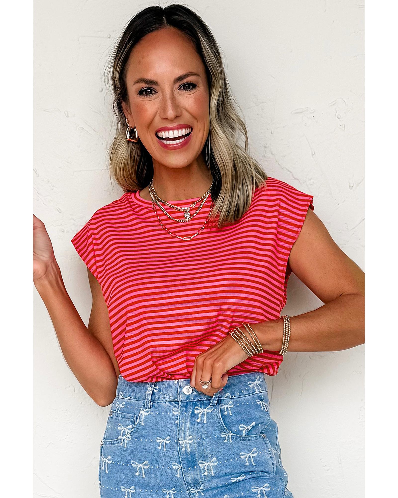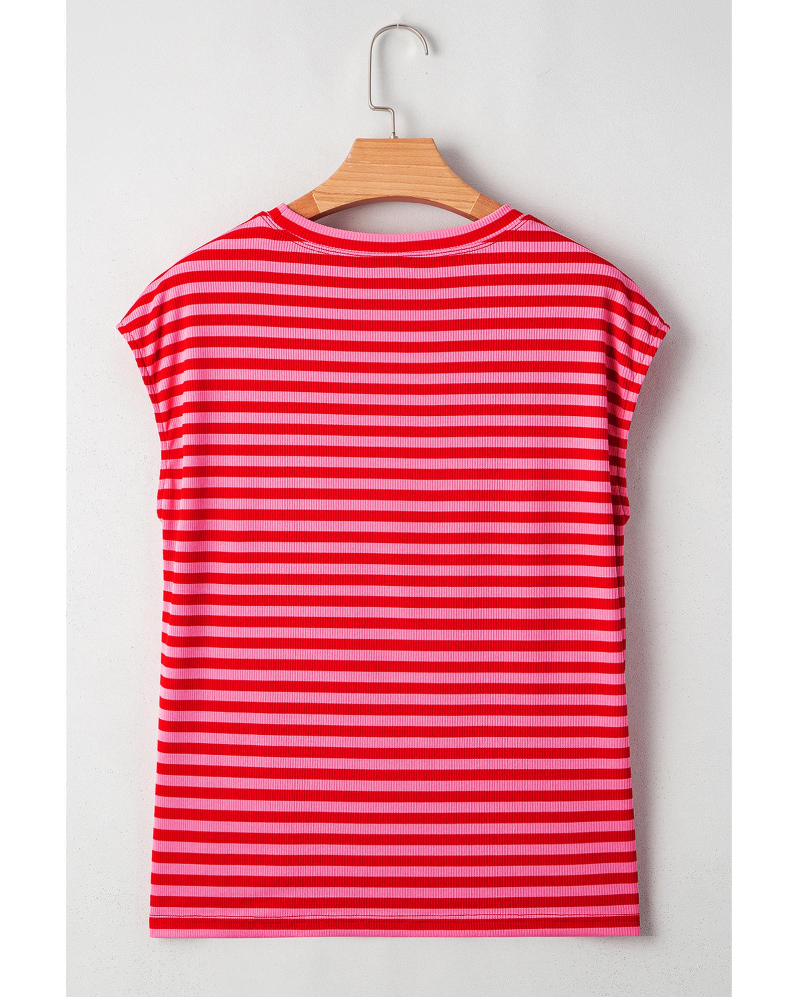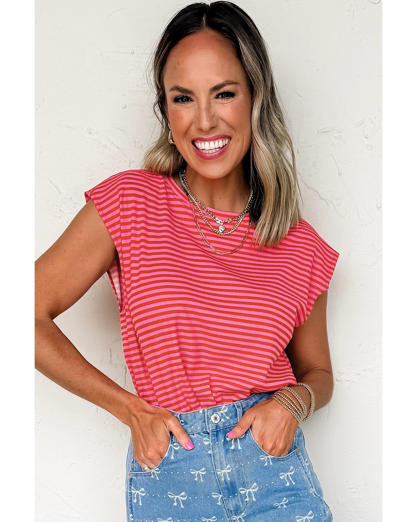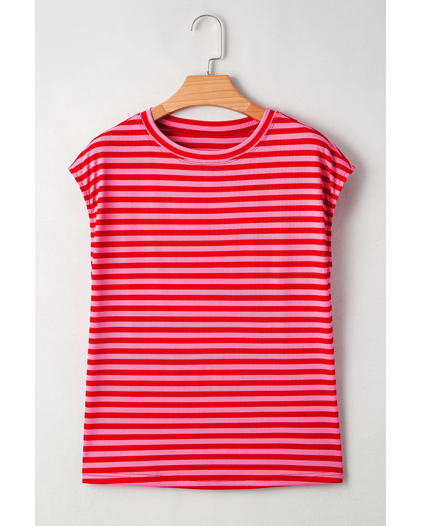 This striped ribbed cap sleeve round neck T-shirt offers a casual and comfortable style suitable for everyday wear. Its relaxed fit and soft fabric make it an ideal choice for a laid-back look.