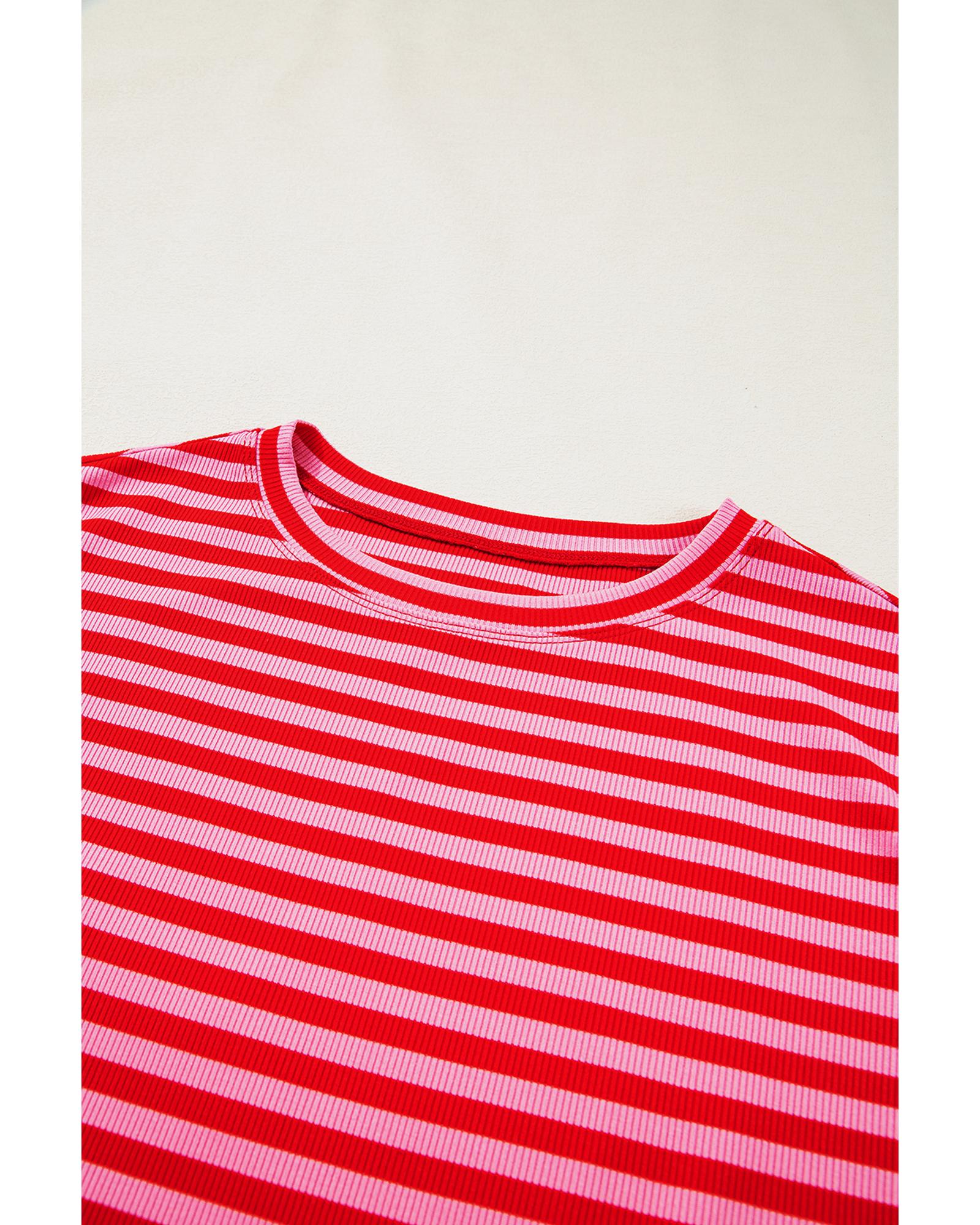 Red Stripe Ribbed Cap Sleeve Round Neck T Shirt – L