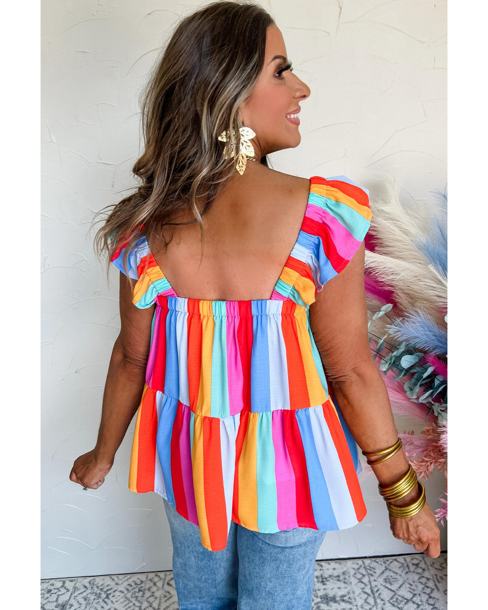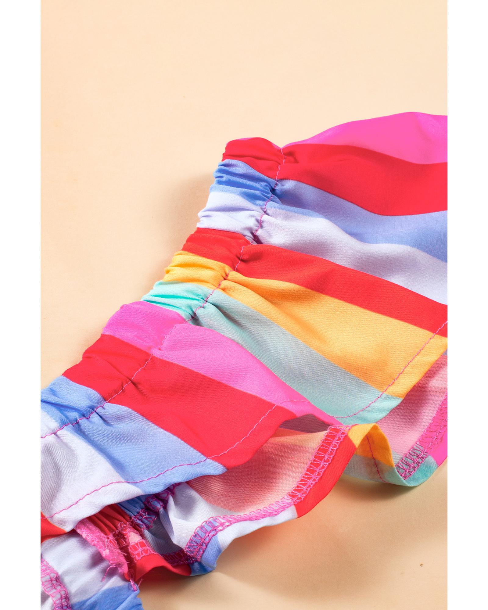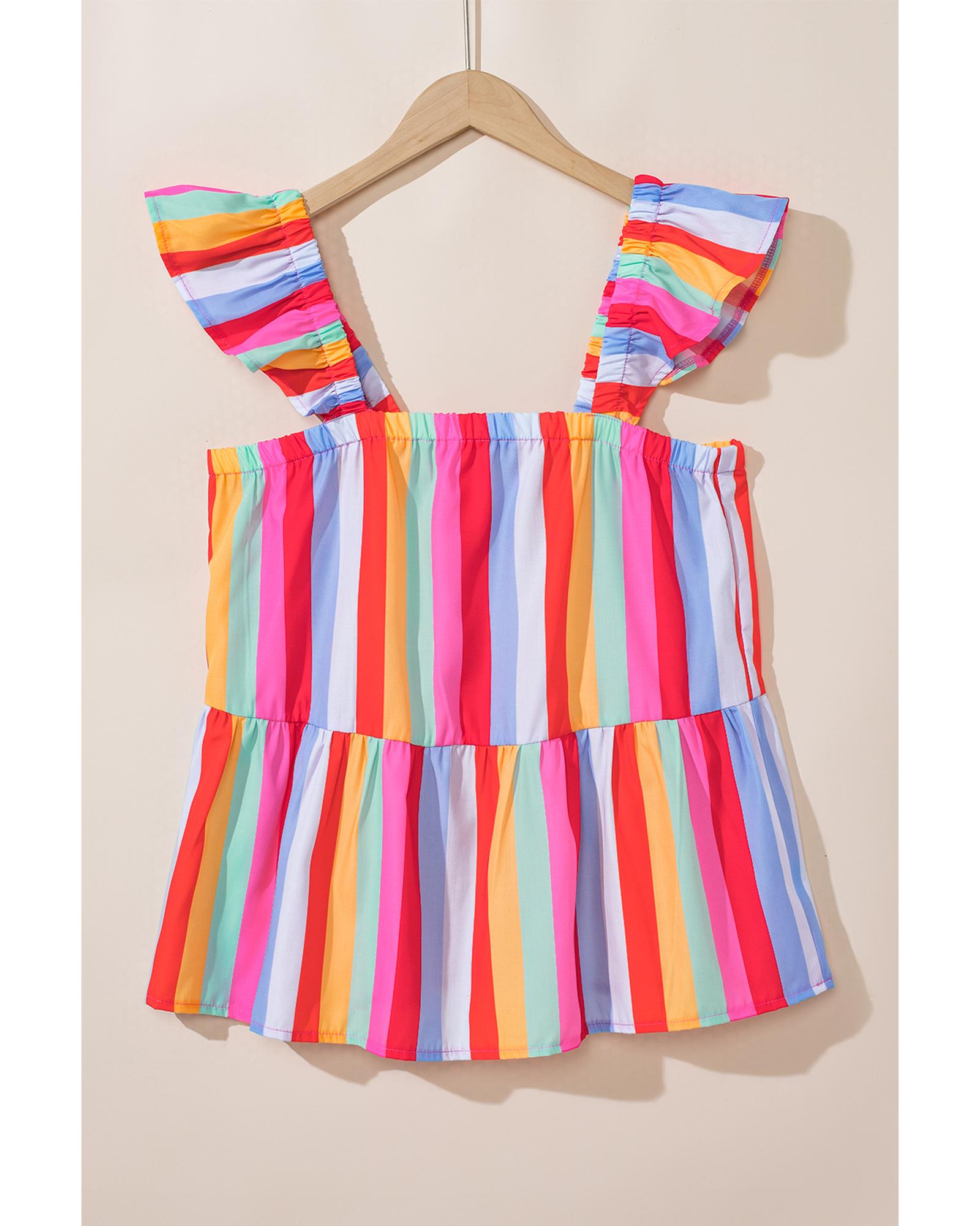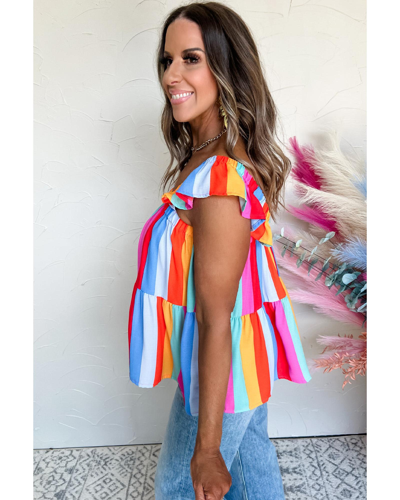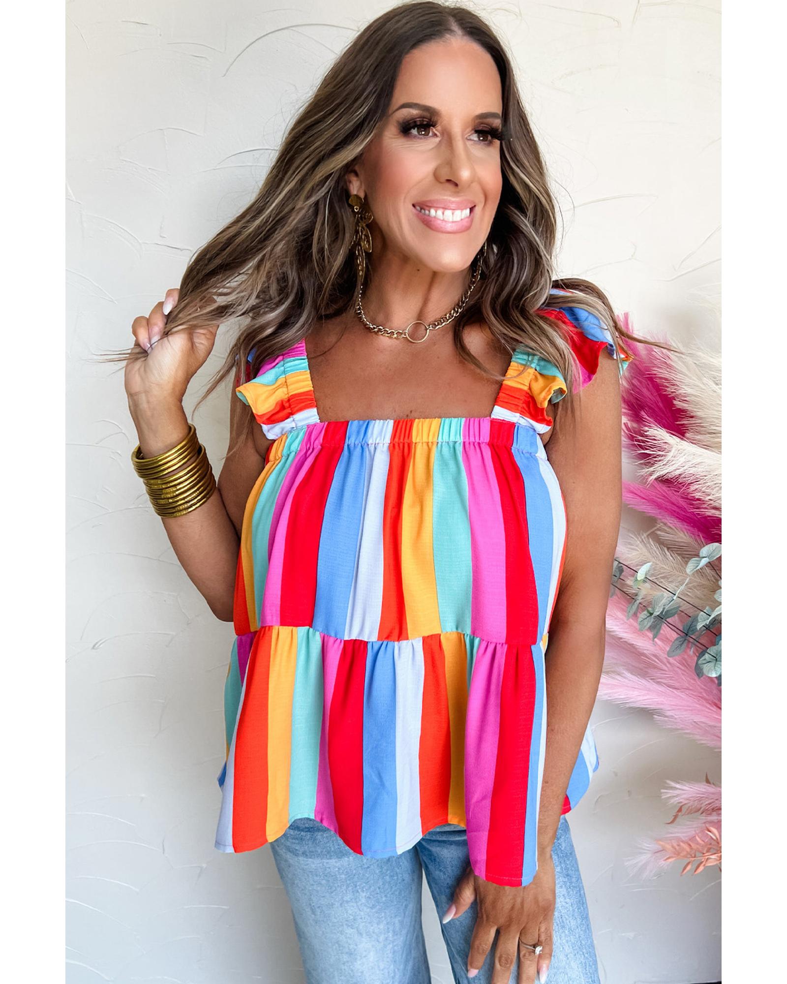 This babydoll tank top features a vibrant stripe pattern and ruffled wide straps, creating a playful and colorful look. Its relaxed fit makes it perfect for casual summer outings, offering both comfort and style.