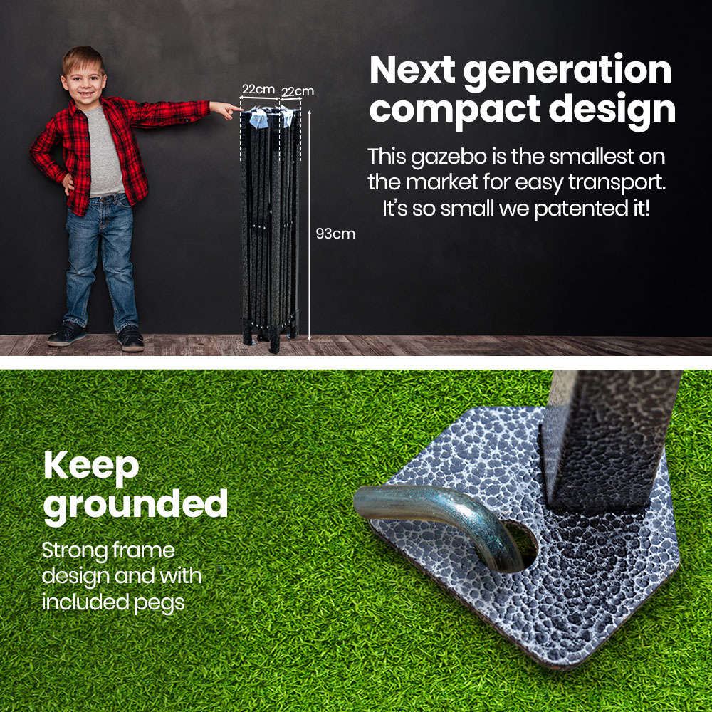 The 3x3m Ultra Compact Folding Gazebo offers a highly portable outdoor shelter solution with an exceptionally small folded size. Weighing only 12kg, it is designed for easy transport and quick setup, making it suitable for camping, beach outings, markets, and outdoor events. Its durable construction and weather-resistant materials provide reliable protection from sun and rain, ensuring comfort and safety during outdoor activities.