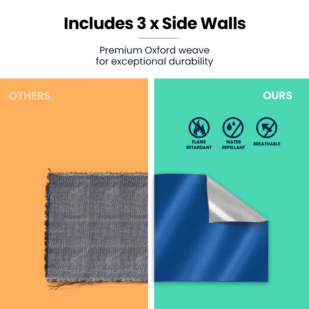 • 3 side walls for privacy and protection from wind and rain