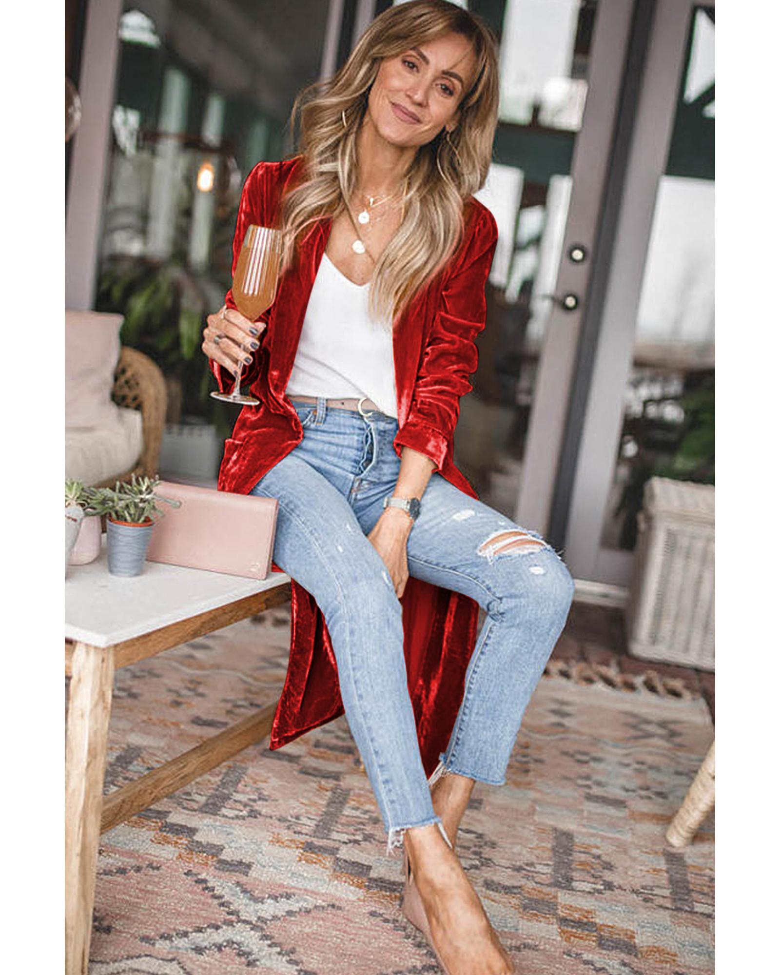 Red Velvet Open Front Pocketed Long Duster – 2XL