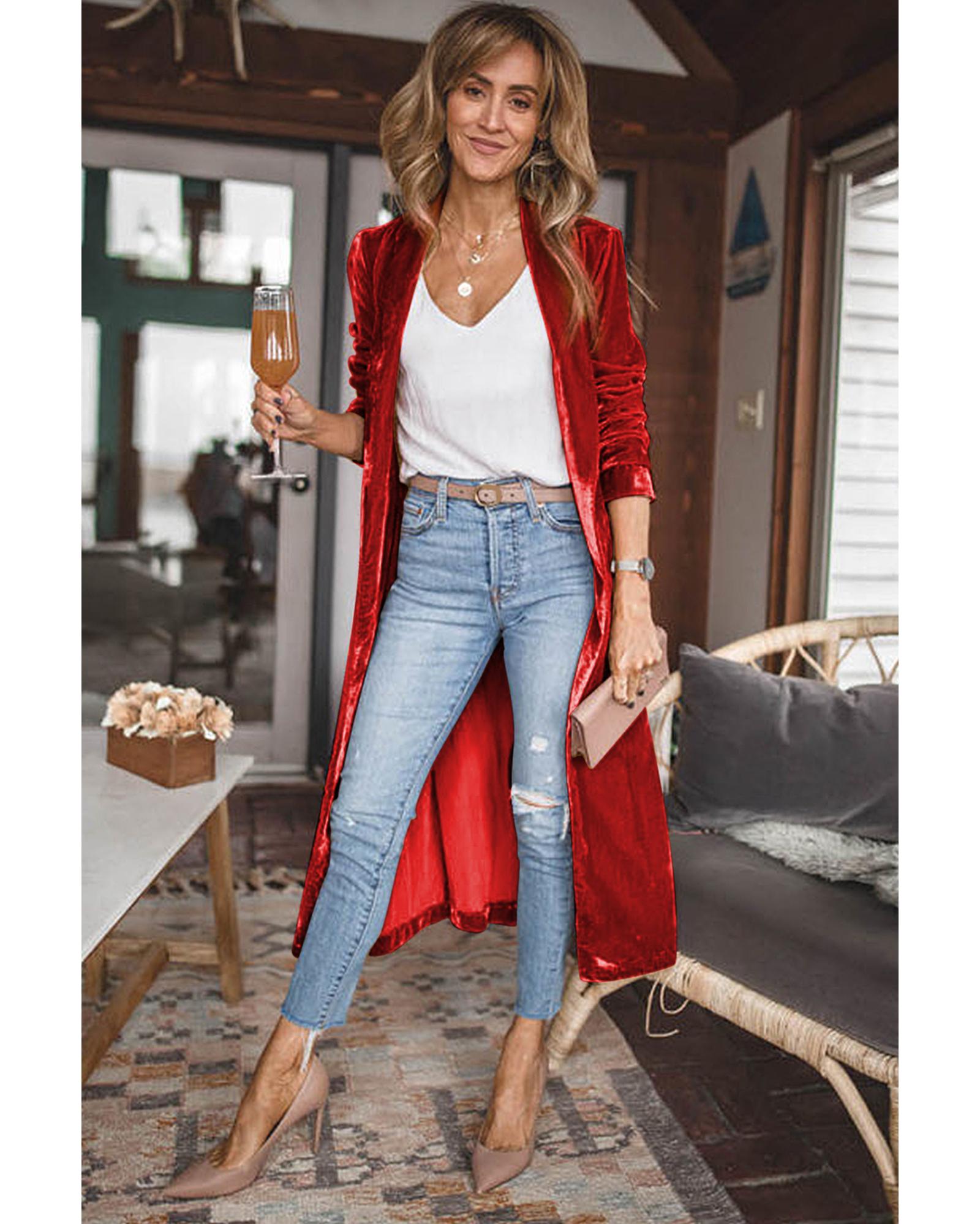 This long duster cardigan features an open front design with convenient side pockets, crafted from soft, lightweight velvet fabric. Its versatile style makes it suitable for cold days in spring and autumn, offering both comfort and fashion. Designed with a trendy fitted look, it is available in various sizes to suit different preferences.