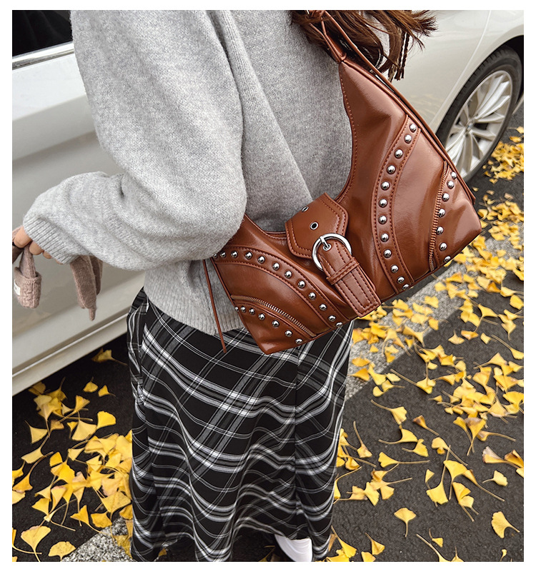 This vintage-style shoulder bag features a studded design crafted from high-quality PU leather, offering a stylish and edgy appearance. It provides versatile carrying options, including single shoulder and crossbody styles, making it suitable for various occasions. The bag is lightweight, ensuring comfortable daily use.