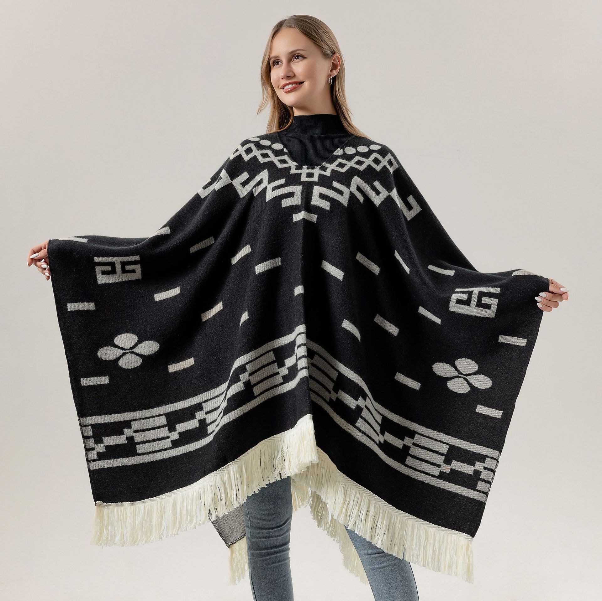 This versatile faux cashmere poncho offers both warmth and style, making it suitable for various occasions. Its elegant geometric pattern and fringe trim add a touch of sophistication, while the multi-functional design allows it to be worn as a poncho, cape, or shawl. Crafted for comfort and style, it is a perfect layering piece for cooler weather.