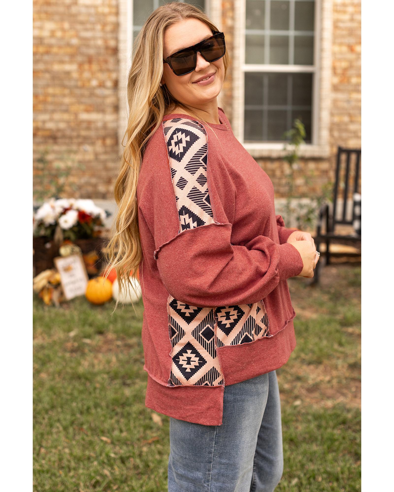 Redwood Burl Aztec Patchwork Drop Shoulder Plus Size High Low Sweatshirt – 2X