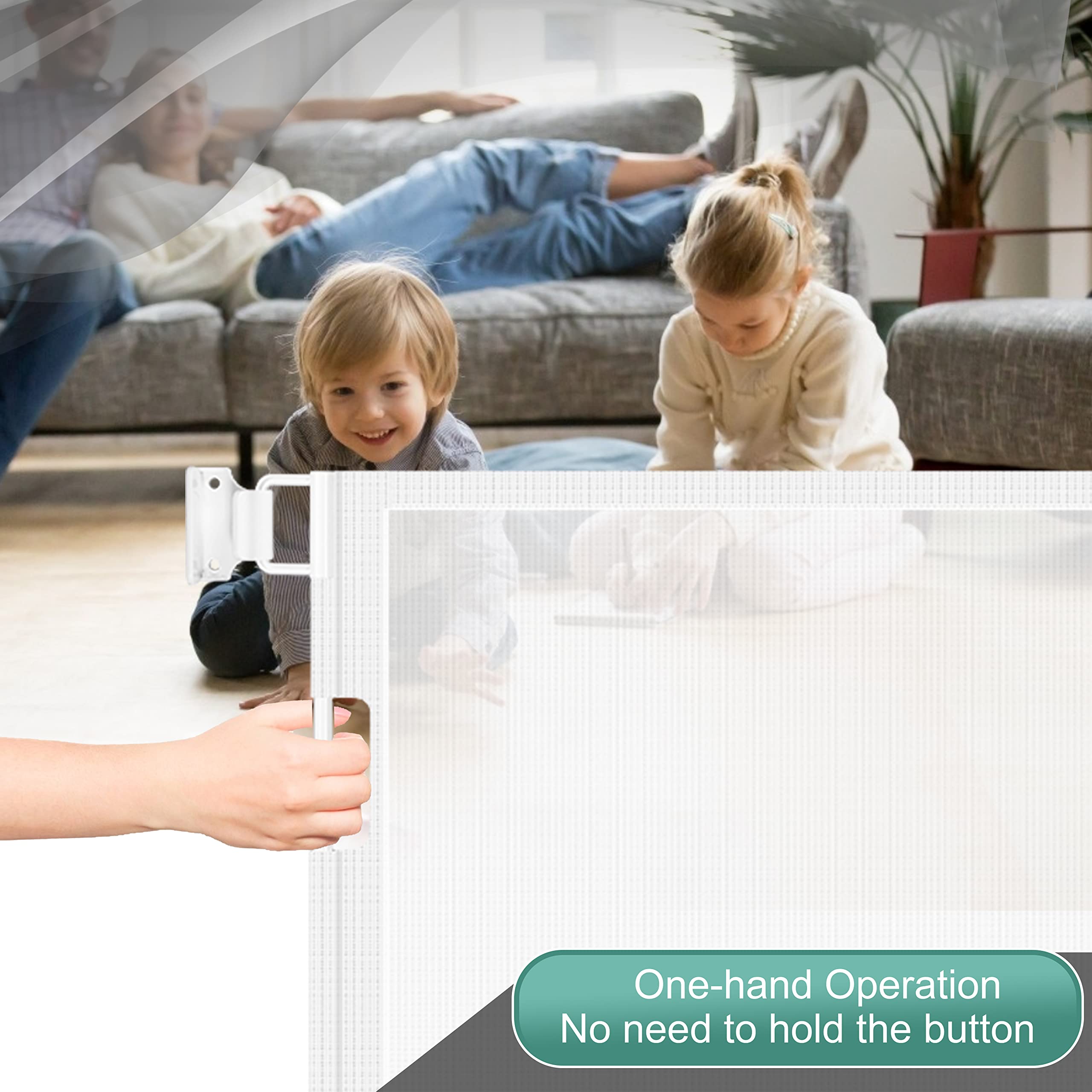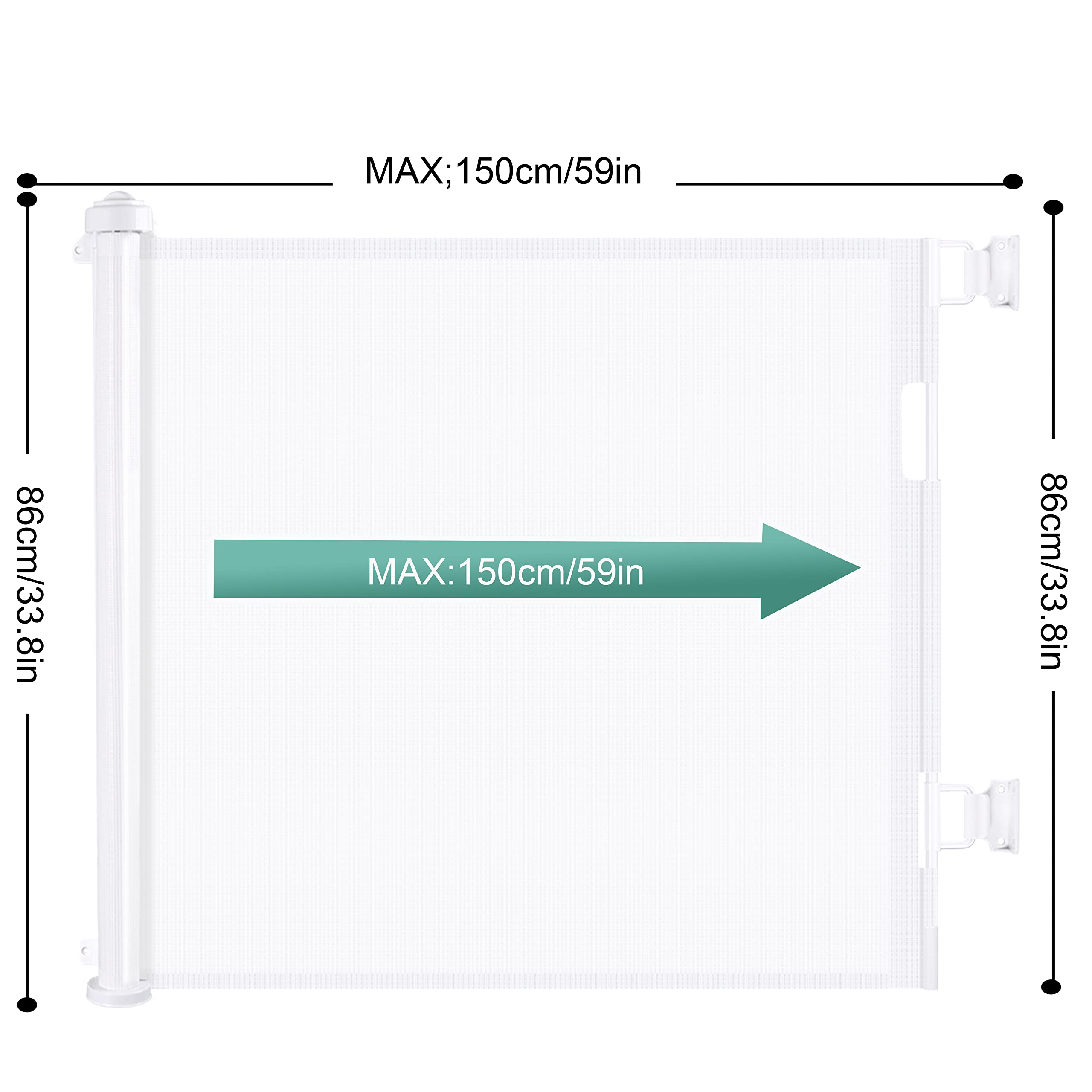 This retractable baby gate offers a flexible solution for securing doorways, hallways, stairs, and outdoor areas. It features a retractable mesh design that can be extended up to 150cm in width and stands 86cm tall, providing a safe barrier that can be easily retracted when not in use.