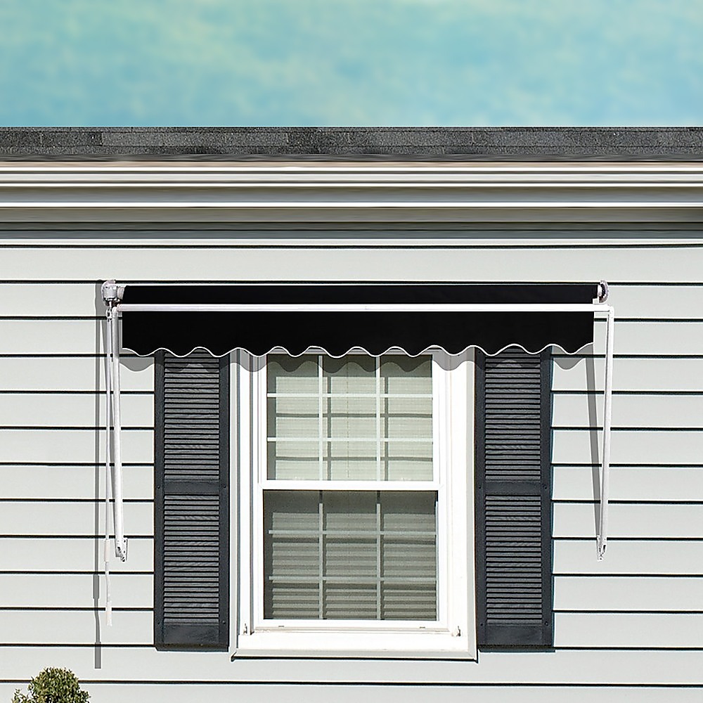 This retractable fixed pivot arm window awning is designed to provide versatile shade and protection for your home, garden, patio, or terrace. It can be easily extended or retracted using a hand crank, allowing you to control the amount of sunlight and shelter as needed. The durable steel frame ensures stability and resilience against various weather conditions, while the breathable polyester valance offers effective shading and airflow.