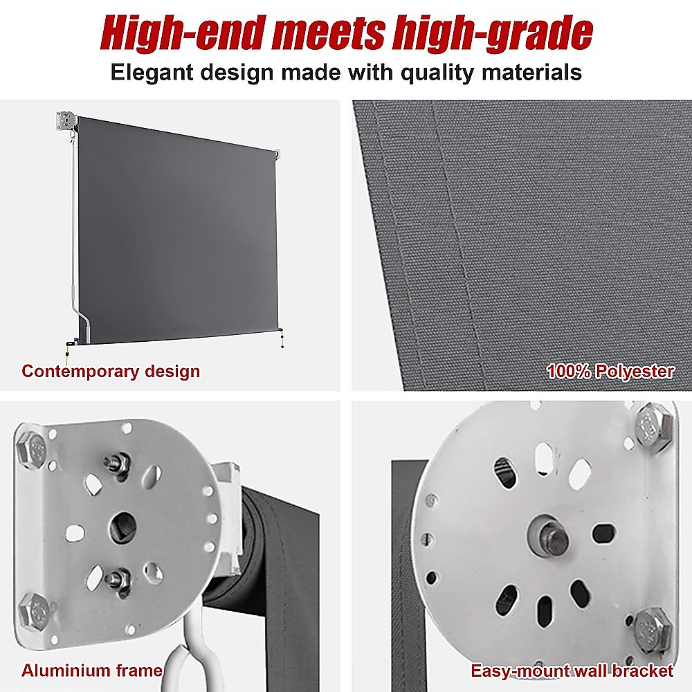 This retractable straight drop awning is designed to provide effective shade and protection for your outdoor and indoor spaces. It helps shield your patio, garden, or large windows from harsh sunlight and wind, creating a comfortable environment and enhancing your home decor. Its neutral grey color allows it to seamlessly blend with various design schemes, making it a versatile addition to your home or garden.