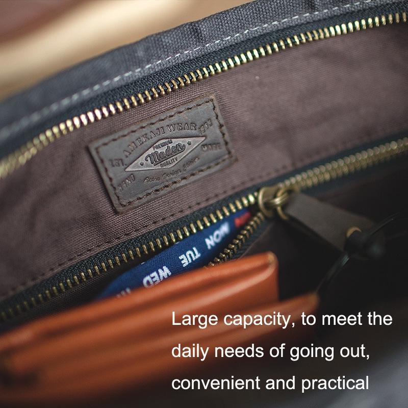 This shoulder bag features a minimalist design crafted from durable oil wax canvas material. It offers a large capacity suitable for daily use, with a secure zipper closure and waterproof fabric for added convenience and protection. The adjustable shoulder strap ensures comfortable wear, making it a practical accessory for everyday activities.