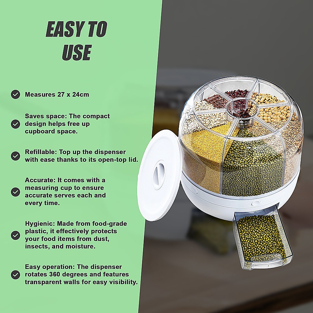 • Capacity: Holds up to 10kg of food across six sections, suitable for grains, nuts, candies, and more