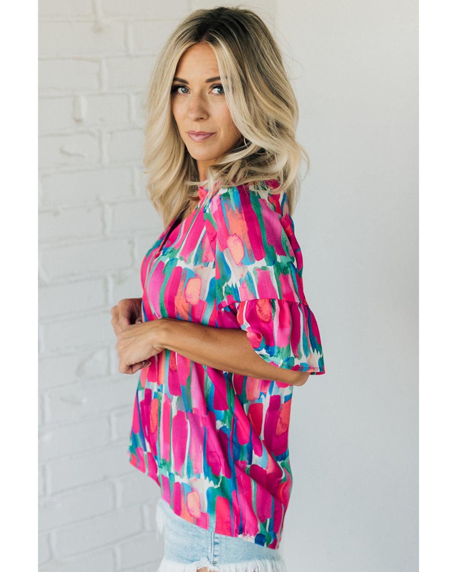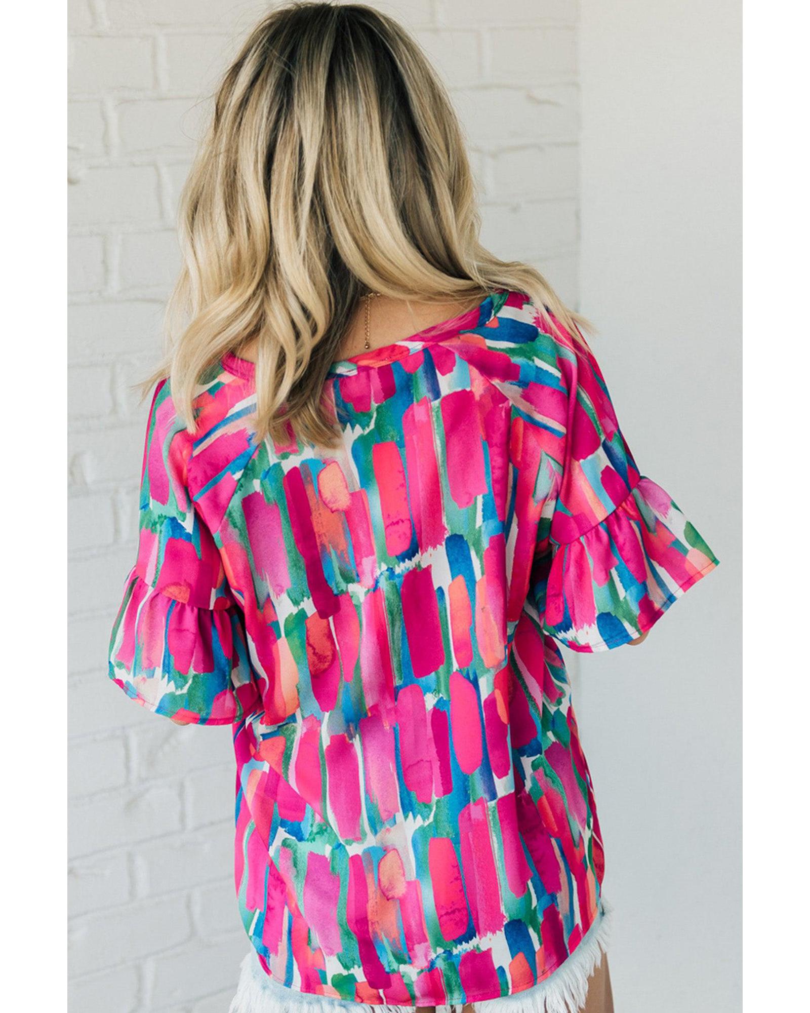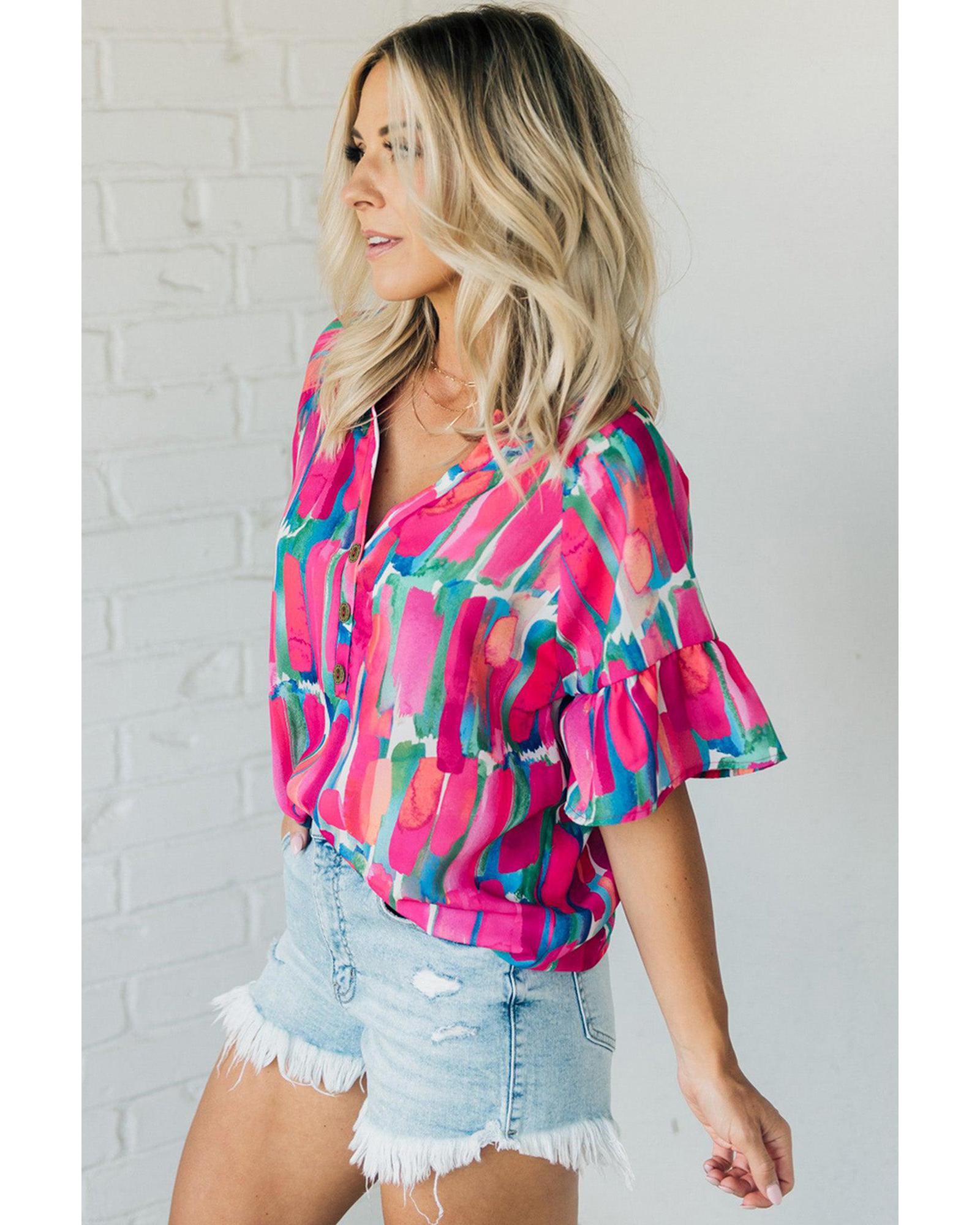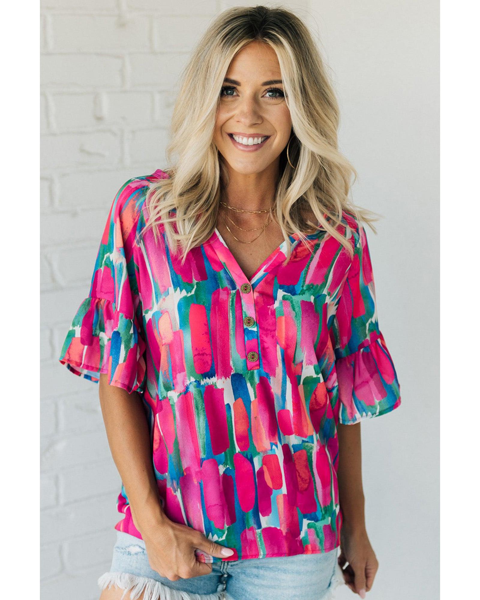 This blouse features a trendy fitted design with a stylish rose abstract brushwork print. It is crafted with lightweight, soft material, ensuring comfort throughout the day. The V neckline, buttoned detail, and ruffled sleeves add elegant touches, making it suitable for various occasions and versatile to pair with pants or skirts.