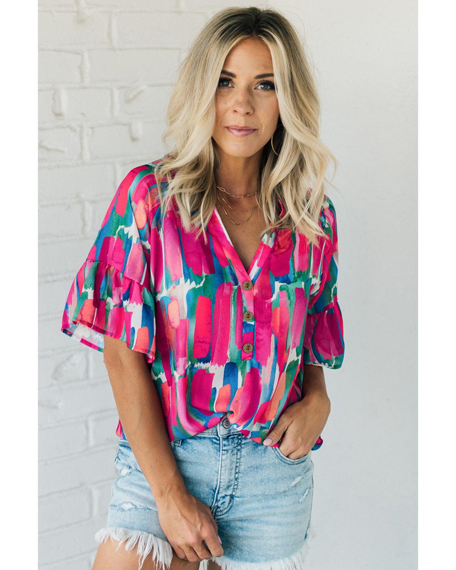 This blouse features a trendy fitted design with a stylish rose abstract brushwork print. It combines a V neckline with buttoned details and ruffled sleeves, creating a chic and elegant look suitable for various occasions. Made from lightweight and soft material, it offers comfort for all-day wear and pairs well with both pants and skirts.