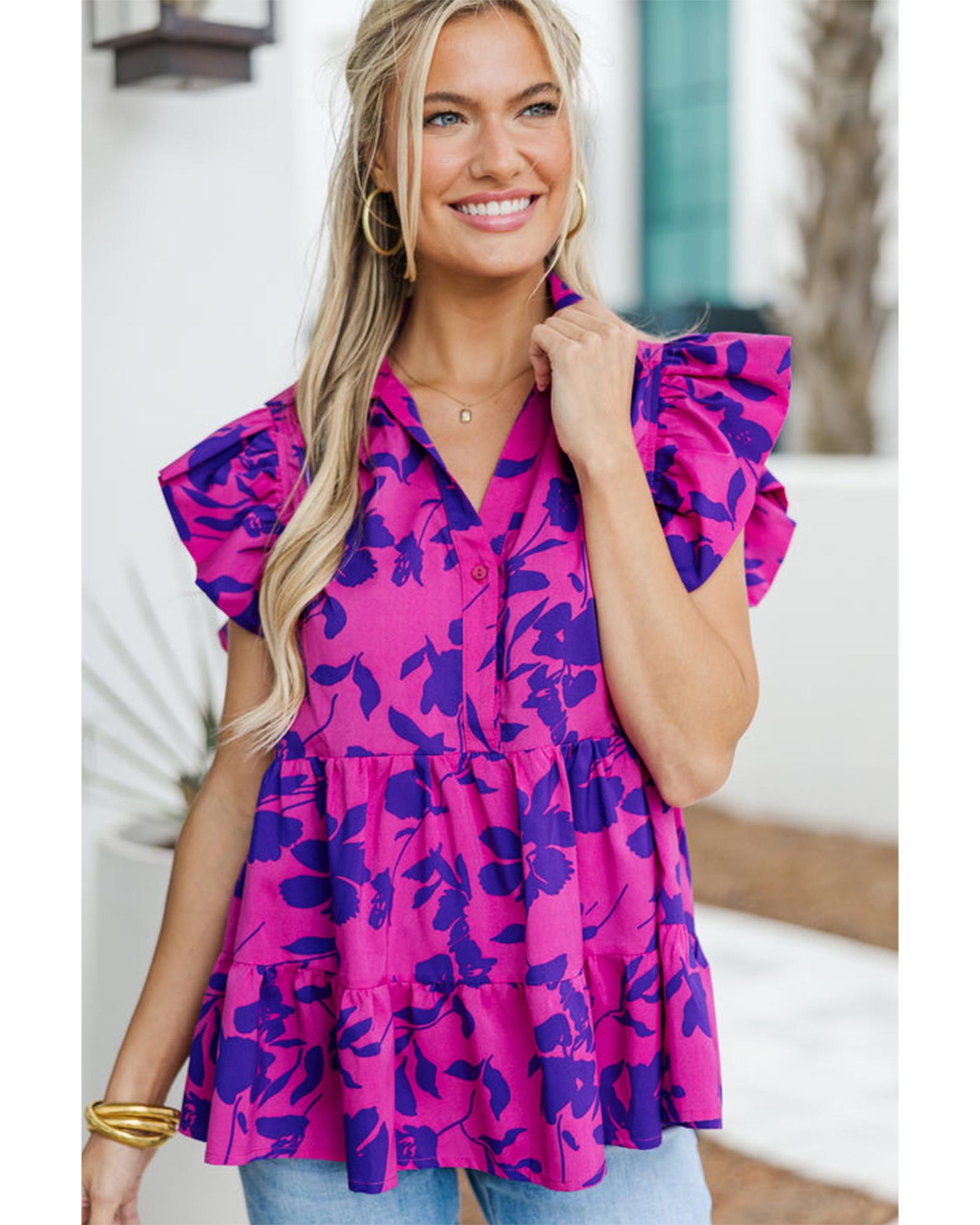 This blouse features a romantic floral print with a classic collared neckline and flutter sleeves, adding a whimsical touch to your outfit. The adjustable buttoned neckline allows for a customizable fit, making it suitable for various occasions.