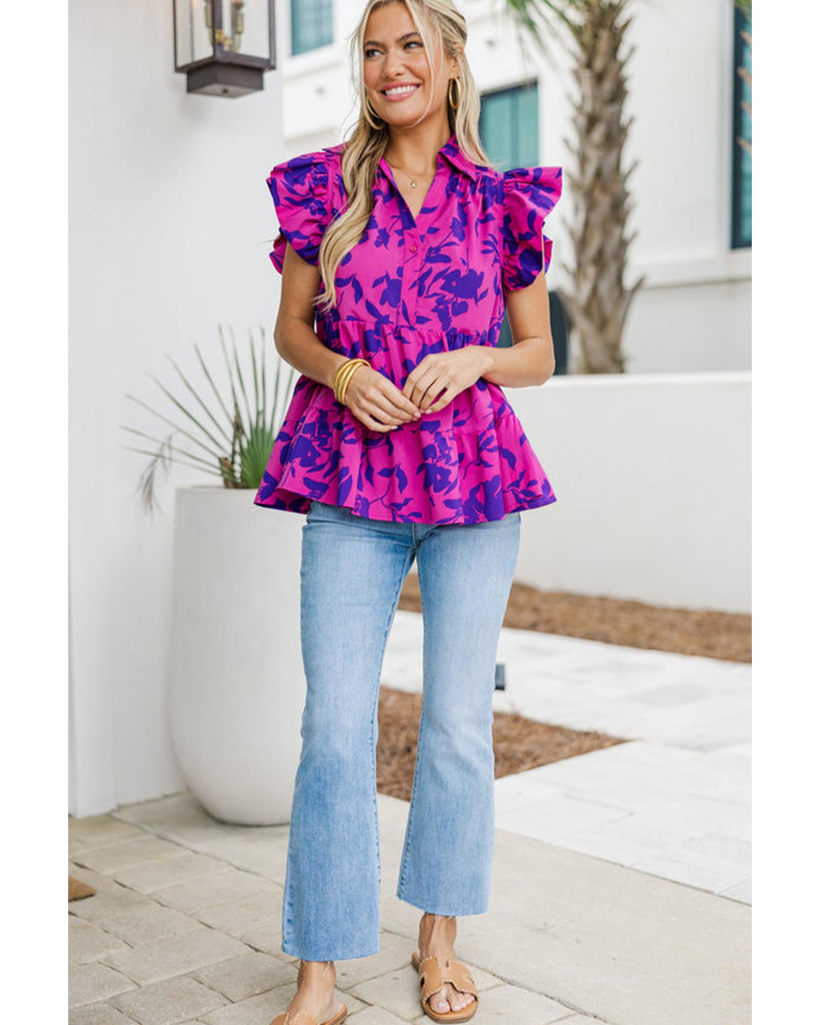 This blouse features a romantic floral print with a classic collared neckline and flutter sleeves, adding a whimsical touch to your outfit. The adjustable buttoned neckline allows for a customizable fit, making it suitable for various occasions.