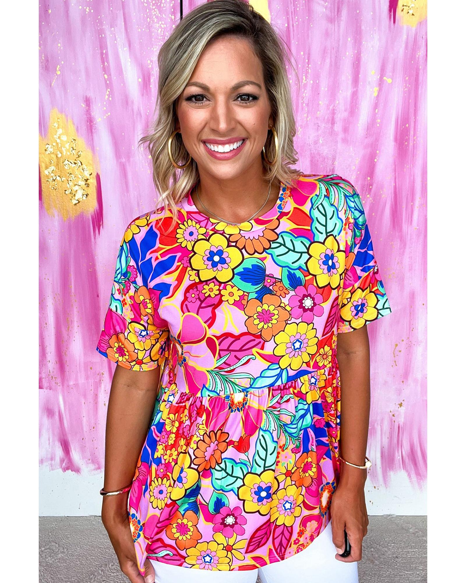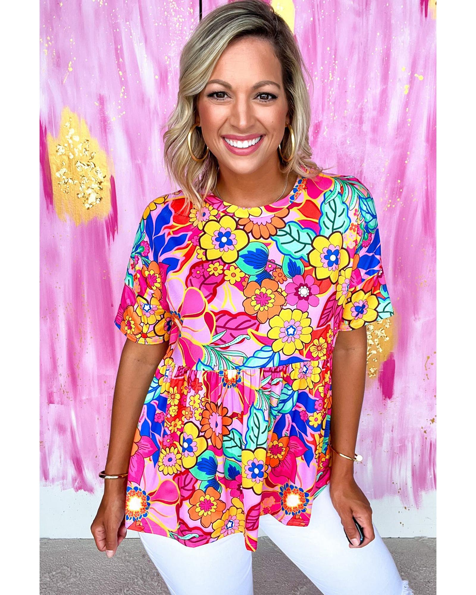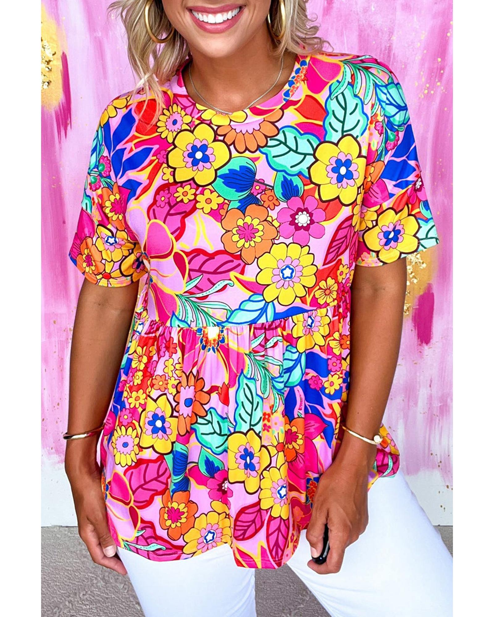 This floral print short sleeve pleated babydoll top features a trendy fitted design with a flattering silhouette. It is suitable for various body types and offers a comfortable fit with high elasticity. The top is crafted from a soft, stretchy fabric blend, making it a versatile addition to your wardrobe.