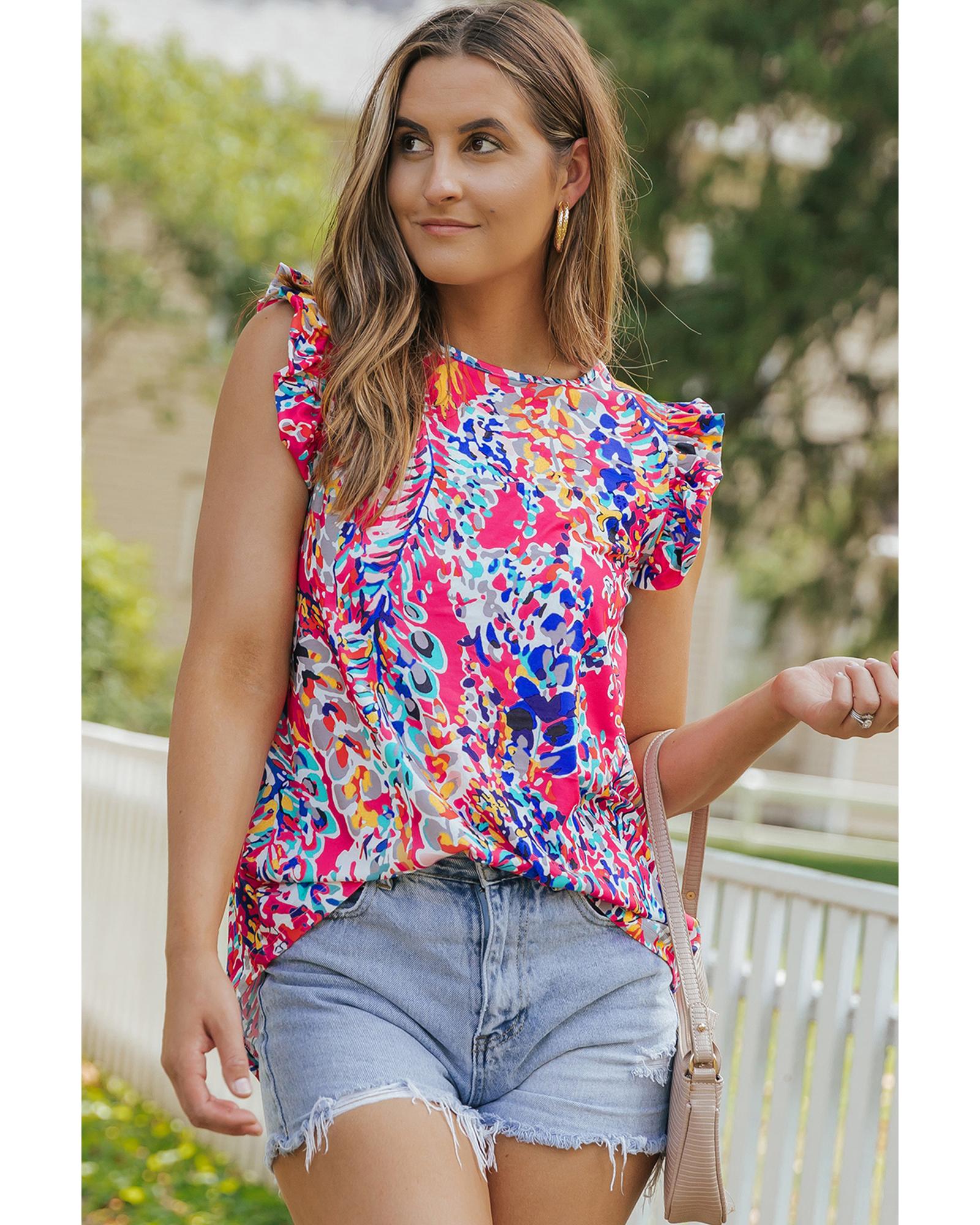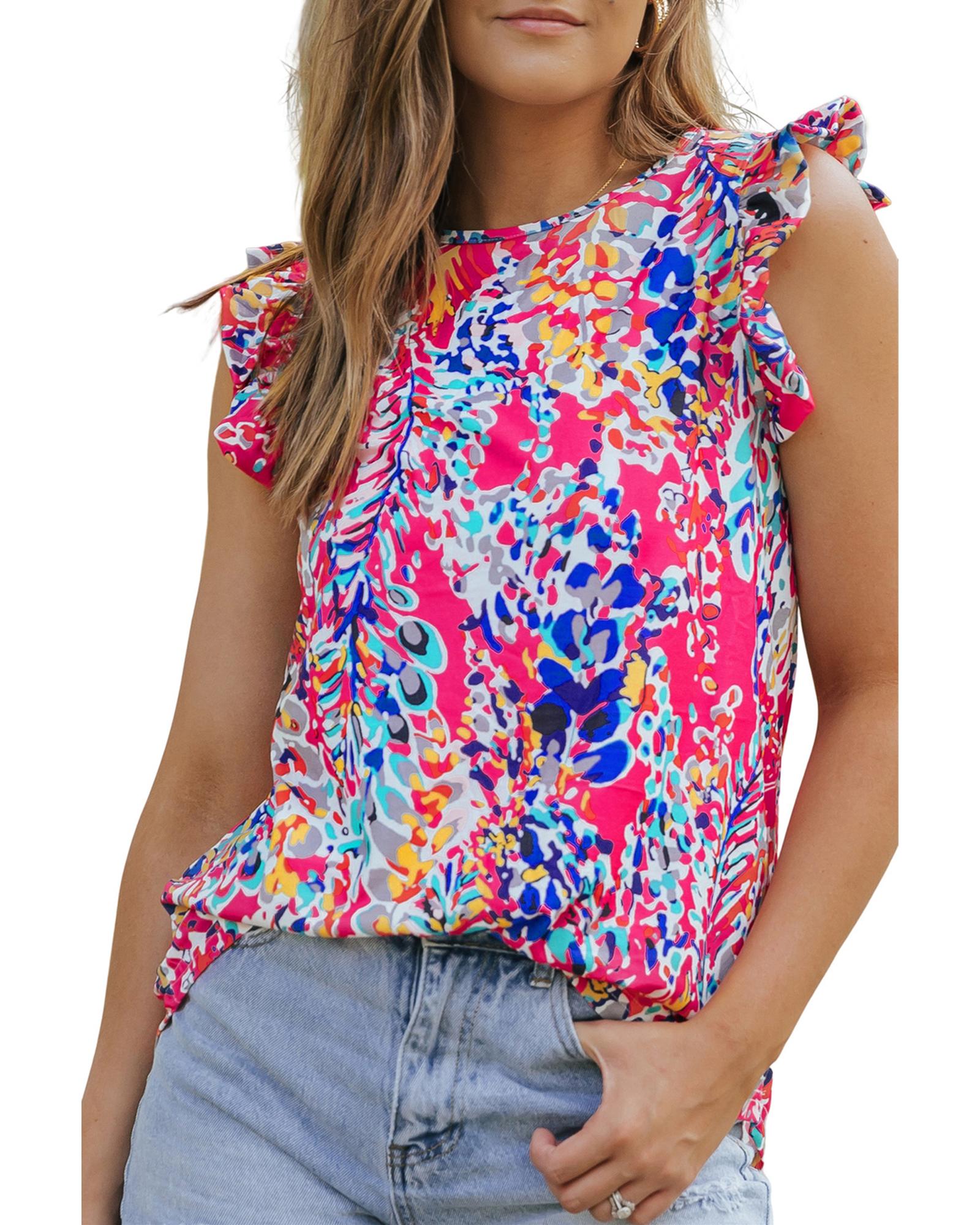 This floral print tank top features a stylish design with ruffle sleeves, making it a versatile addition to your casual wardrobe. Crafted from comfortable material, it offers a relaxed fit suitable for everyday wear. The sleeveless style pairs effortlessly with various casual outfits, especially white skinny jeans or casual pants.