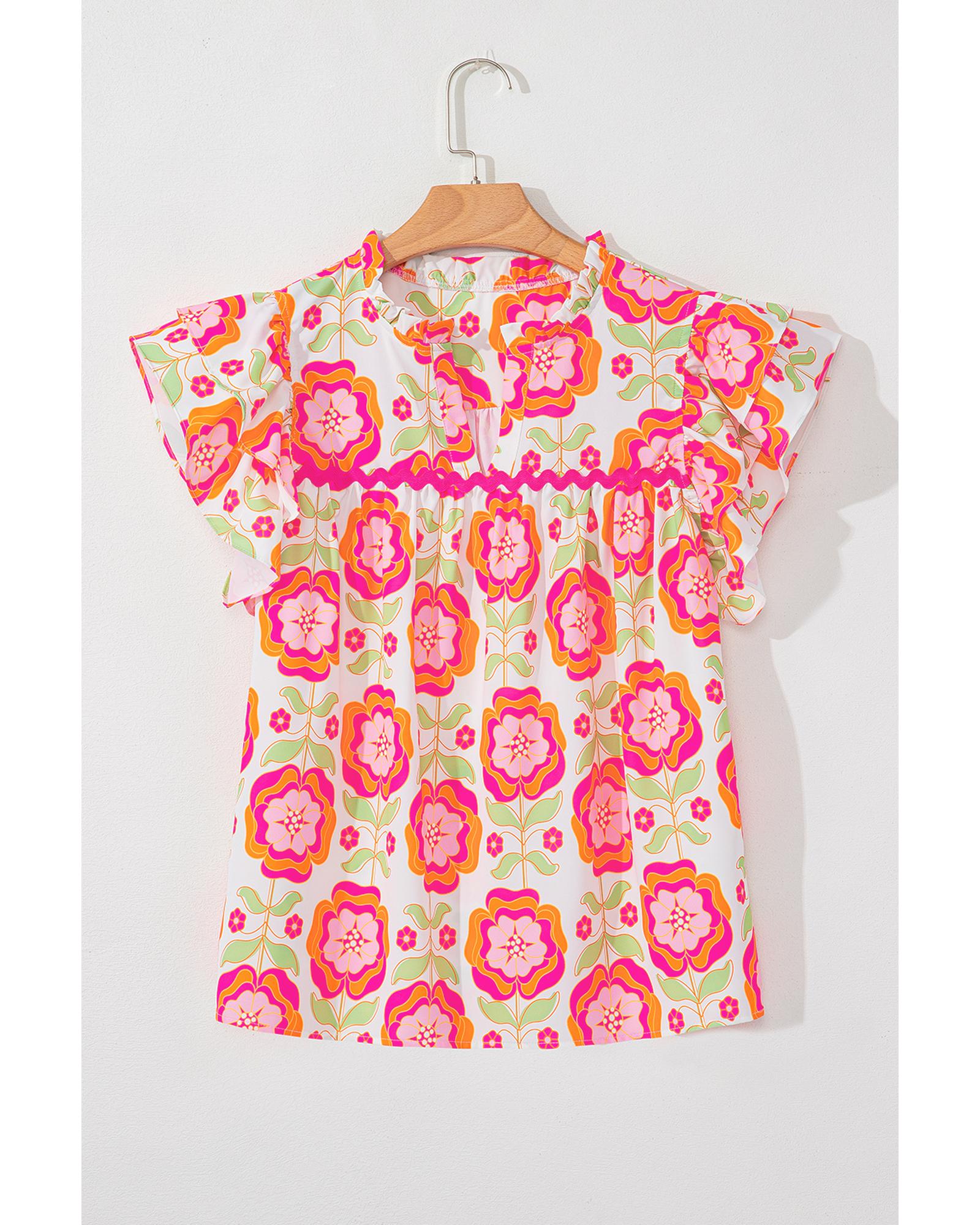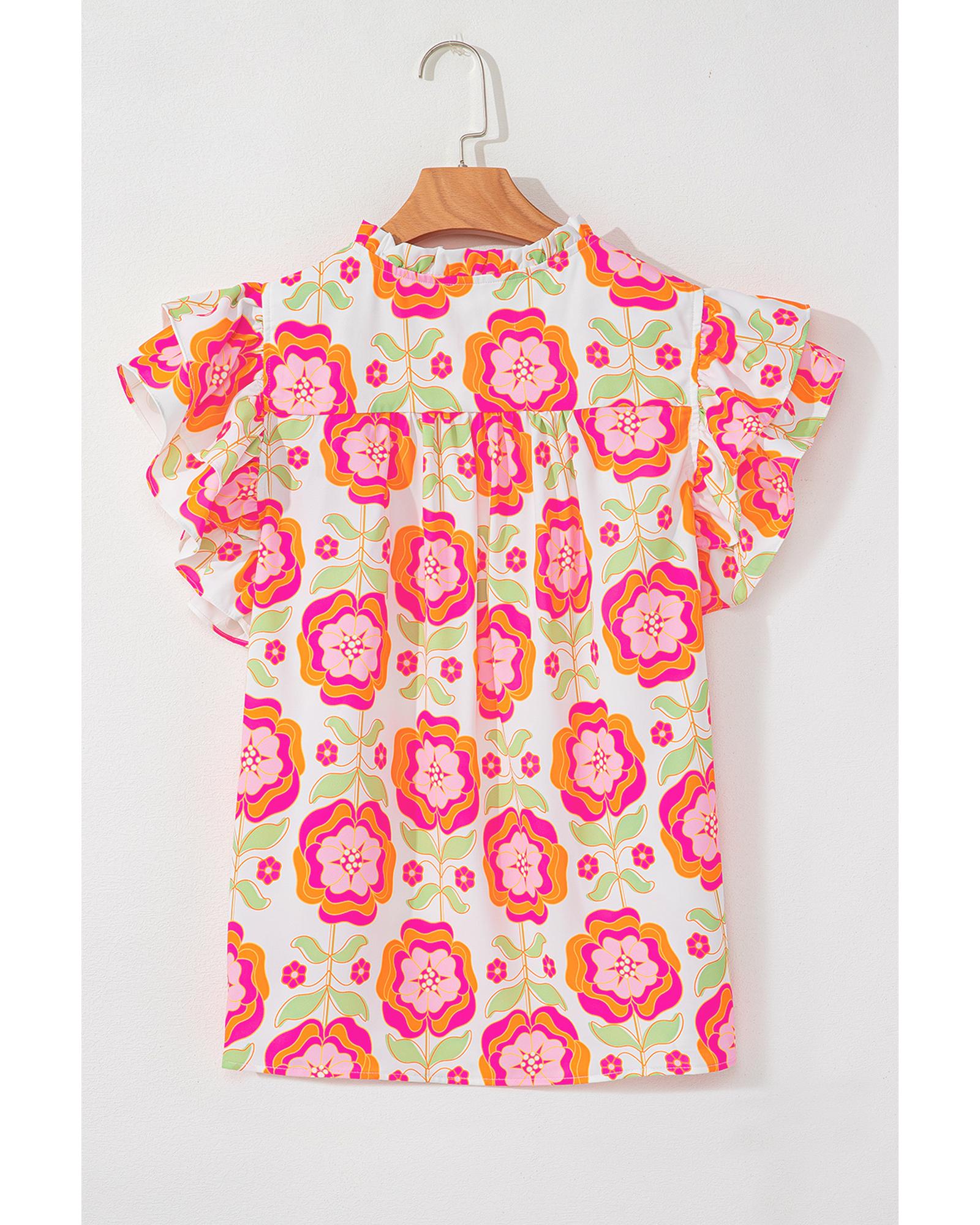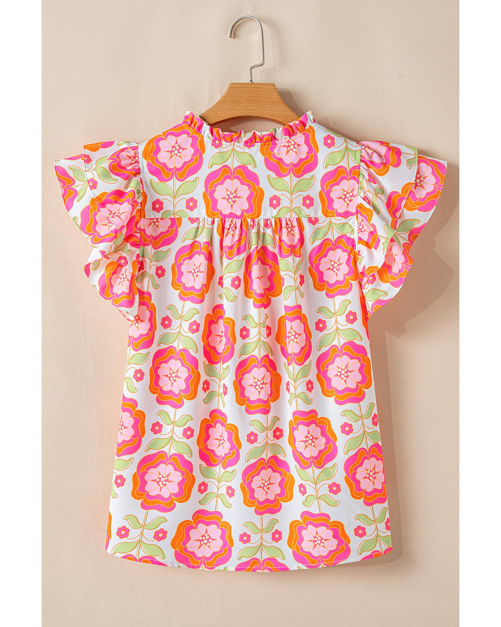 This floral blouse features a delicate rose print and feminine ruffled sleeves, offering a stylish and versatile look. The split neck design adds a chic touch, making it suitable for various occasions.