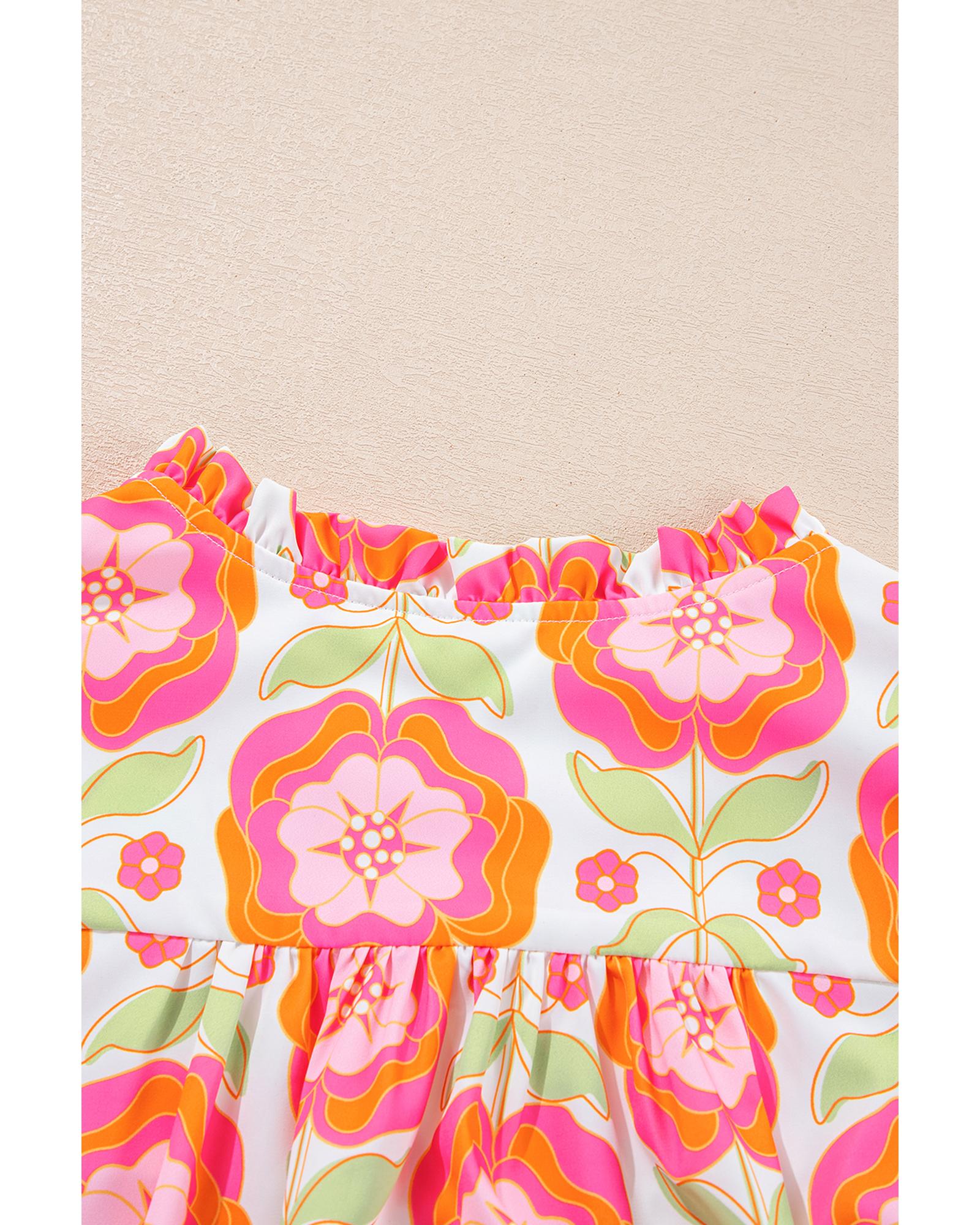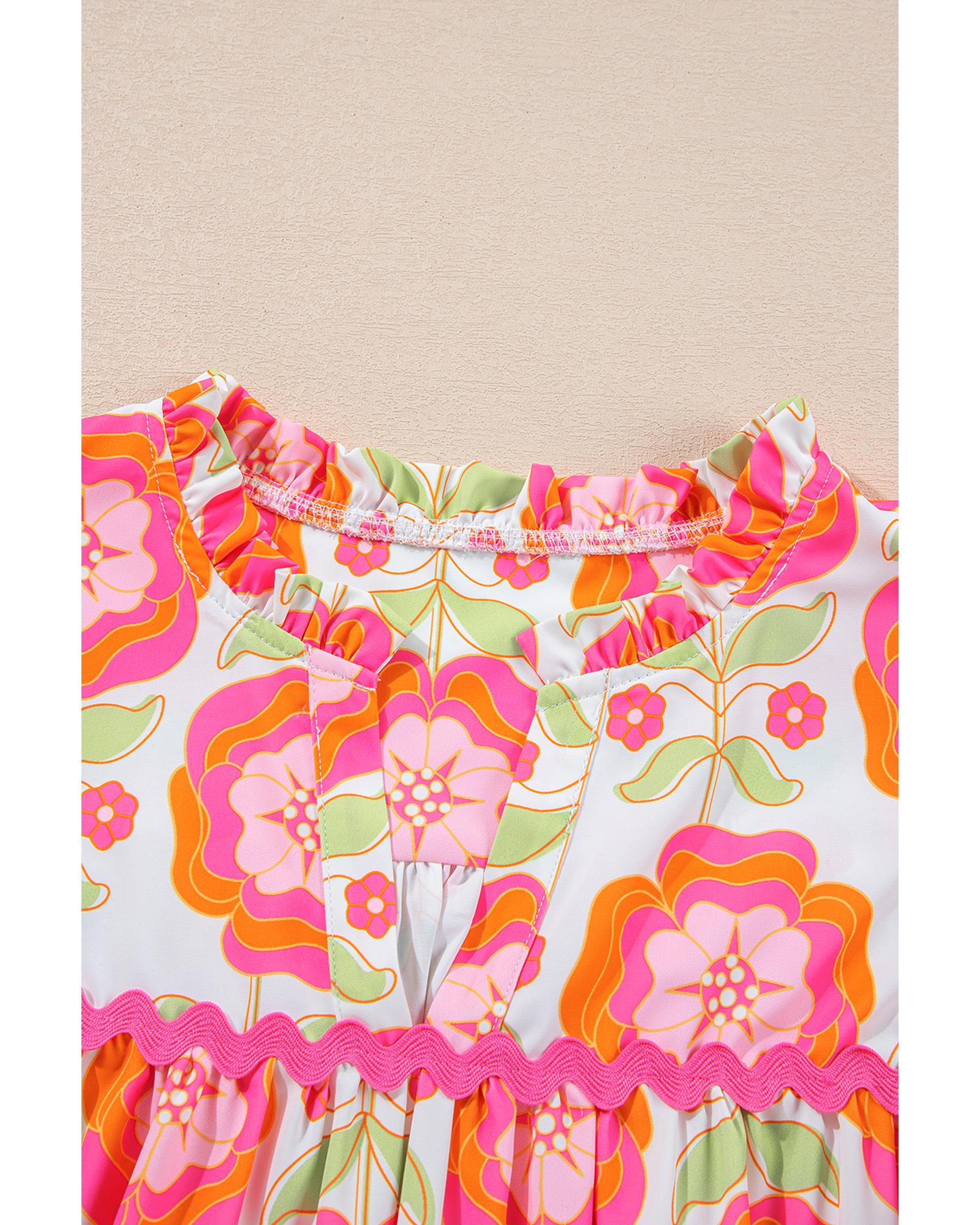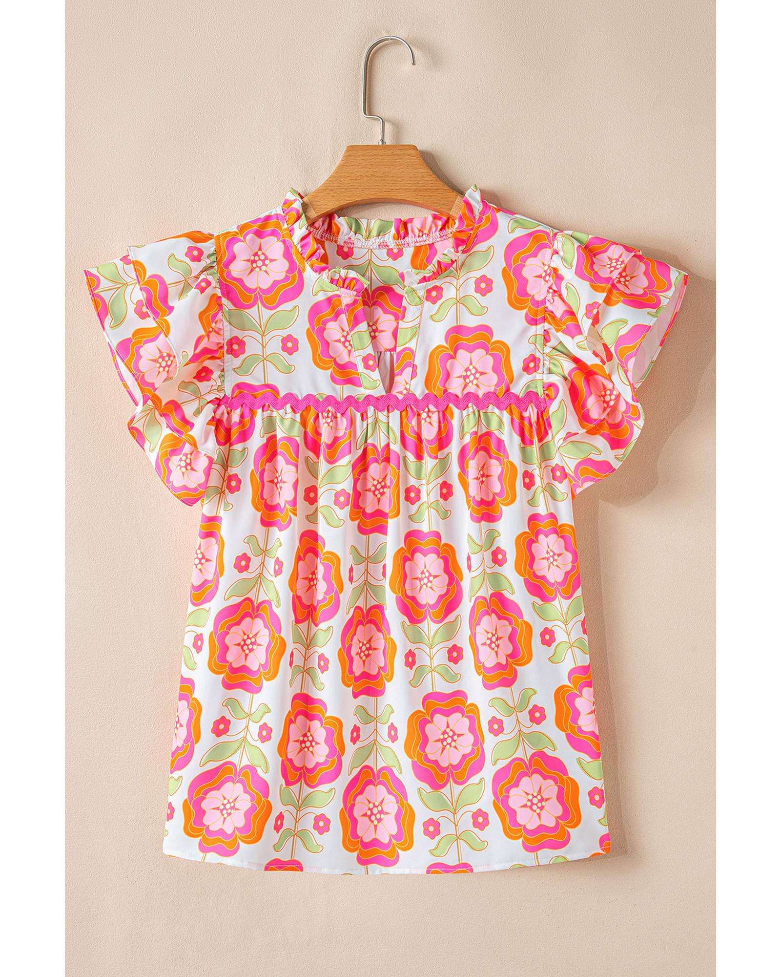 This floral blouse features a graceful floral print and a relaxed, loose fit for comfortable wear. The design includes feminine ruffled sleeves and a split neck for a versatile and stylish look. The unique ric-rac trim detail adds a charming touch to the overall design.