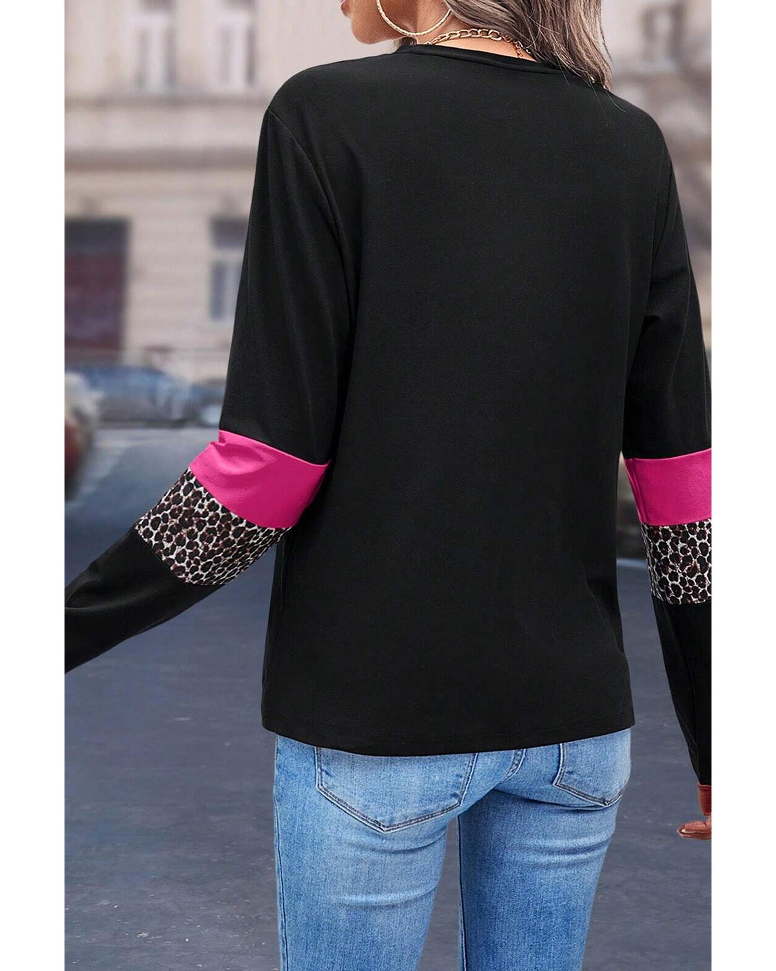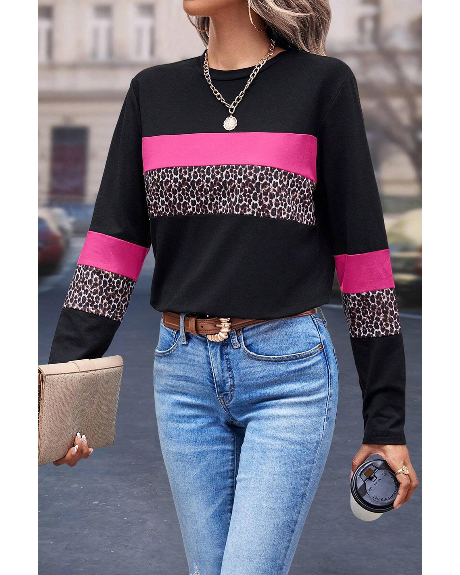 Rose Leopard Colorblock Patchwork Crew Neck Long Sleeve Tee – M