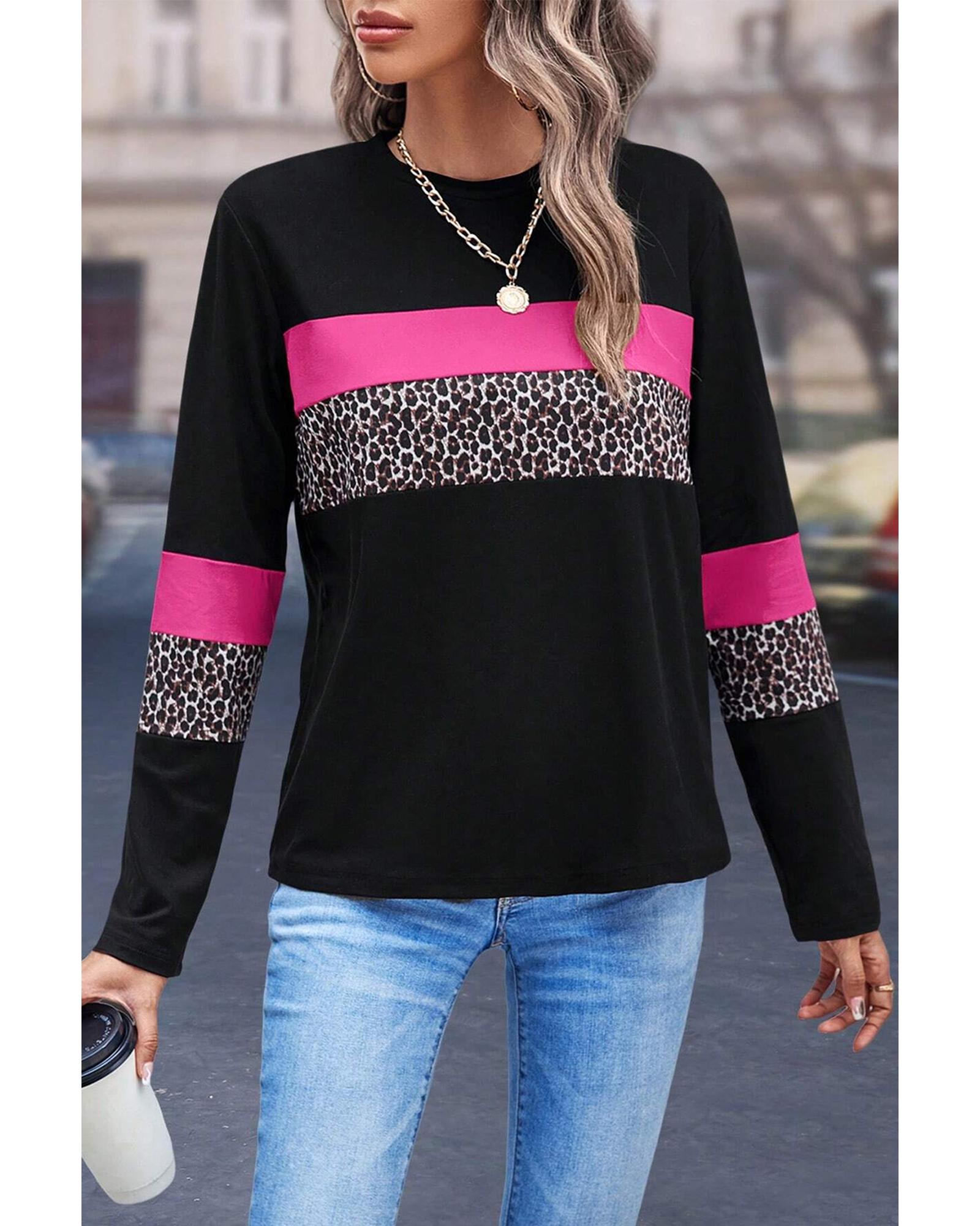 Rose Leopard Colorblock Patchwork Crew Neck Long Sleeve Tee – S