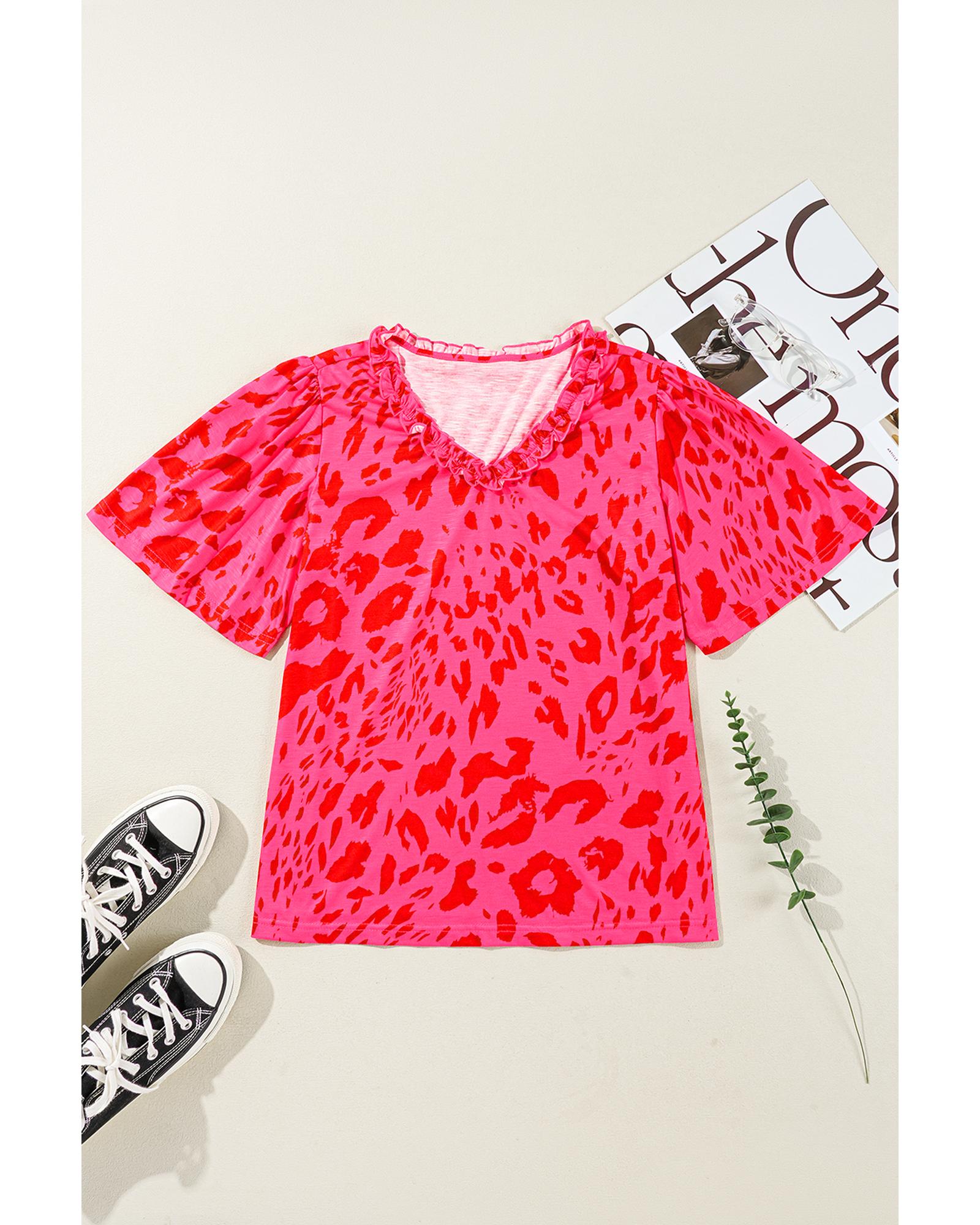 This blouse features a stylish leopard print design with a relaxed silhouette, making it a versatile choice for casual wear. The short sleeves and frilly V-neck add feminine details to the overall look, suitable for various casual occasions.