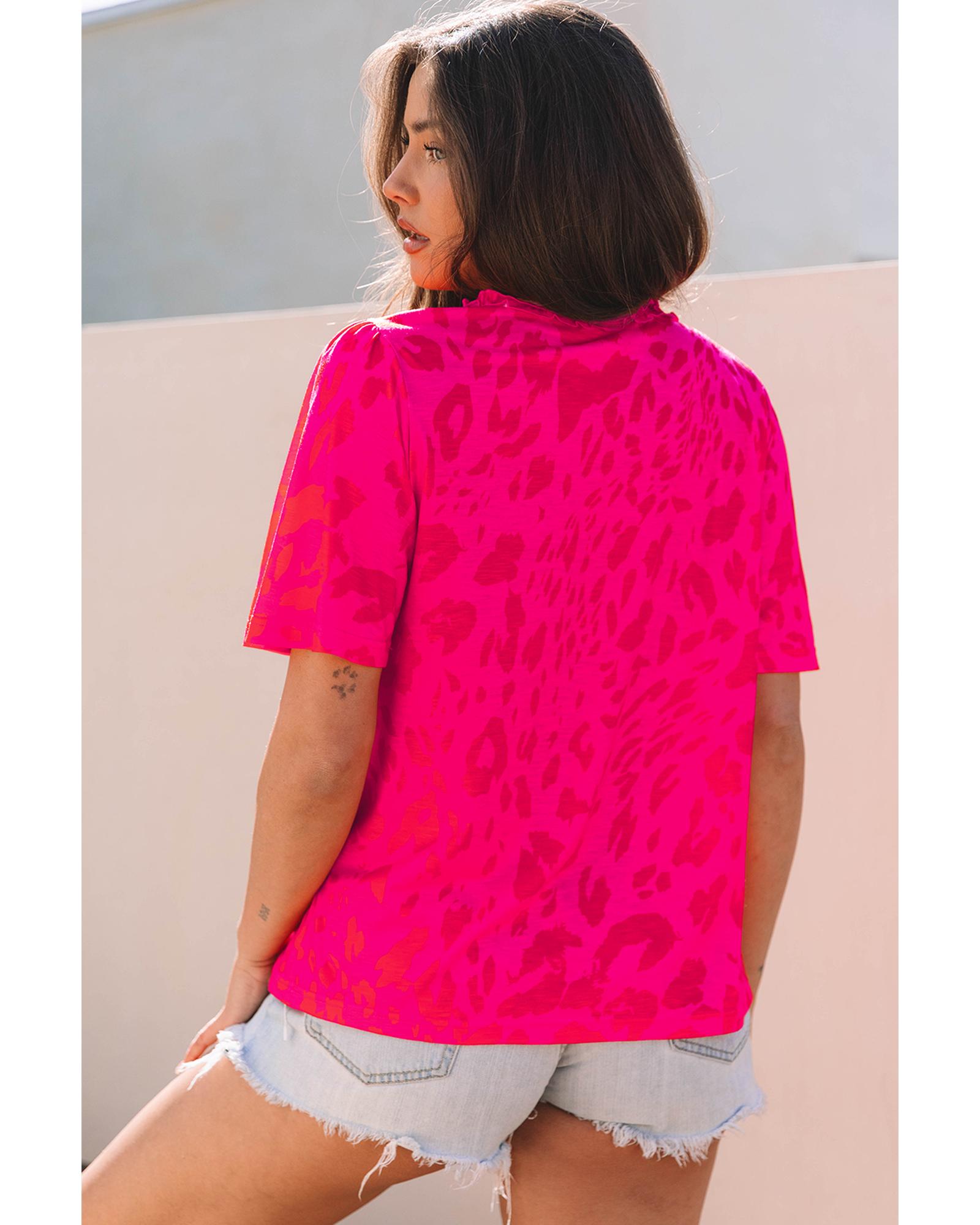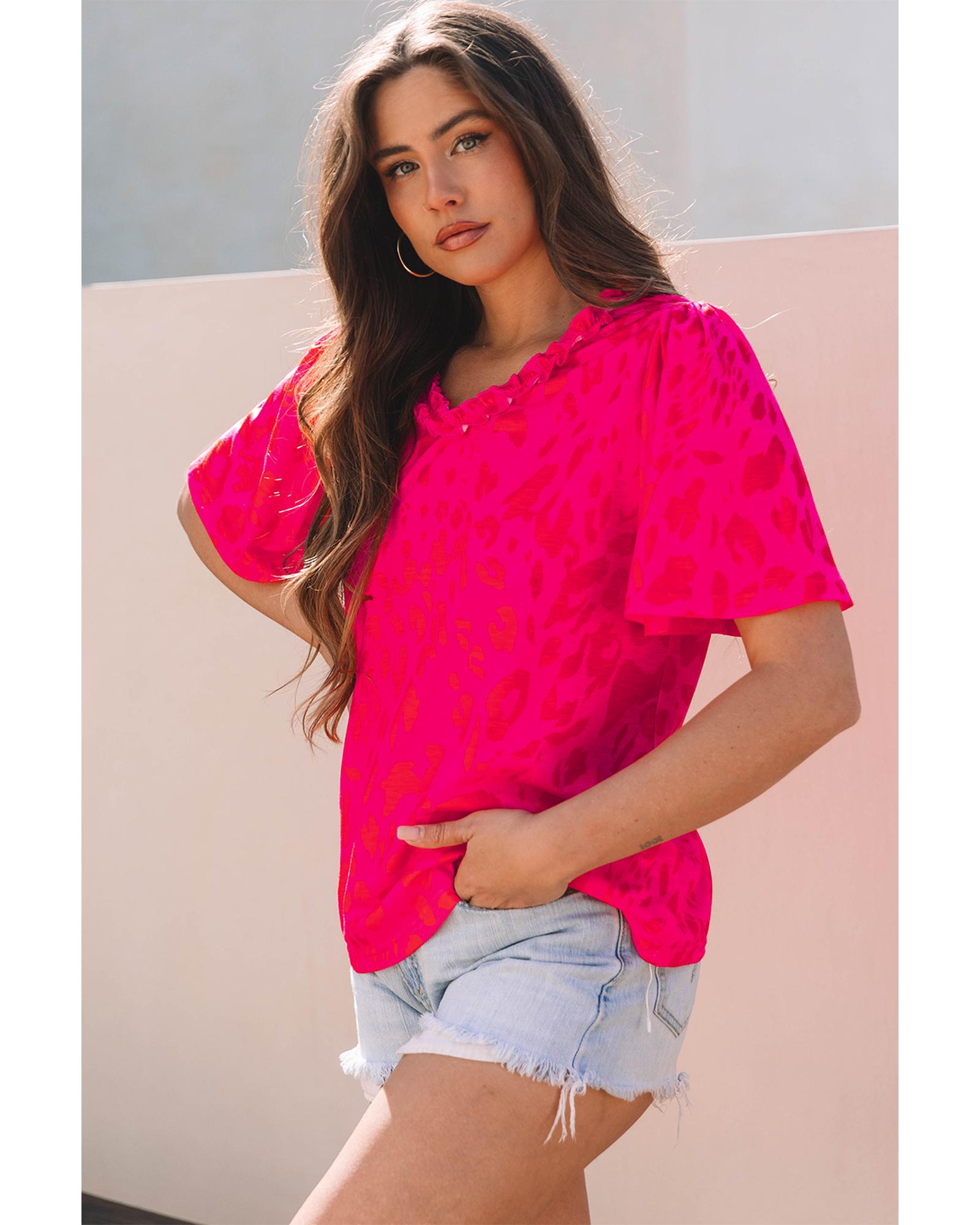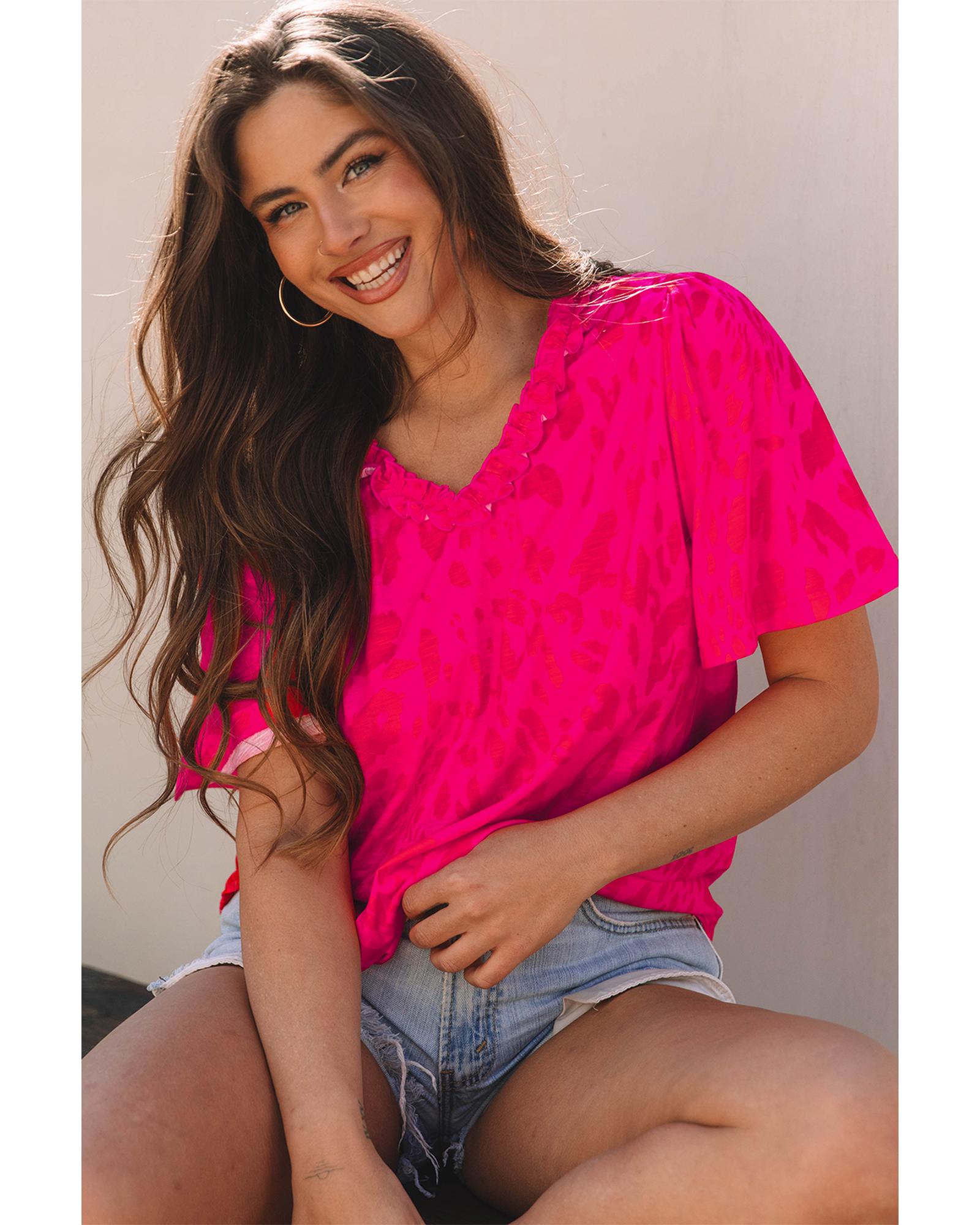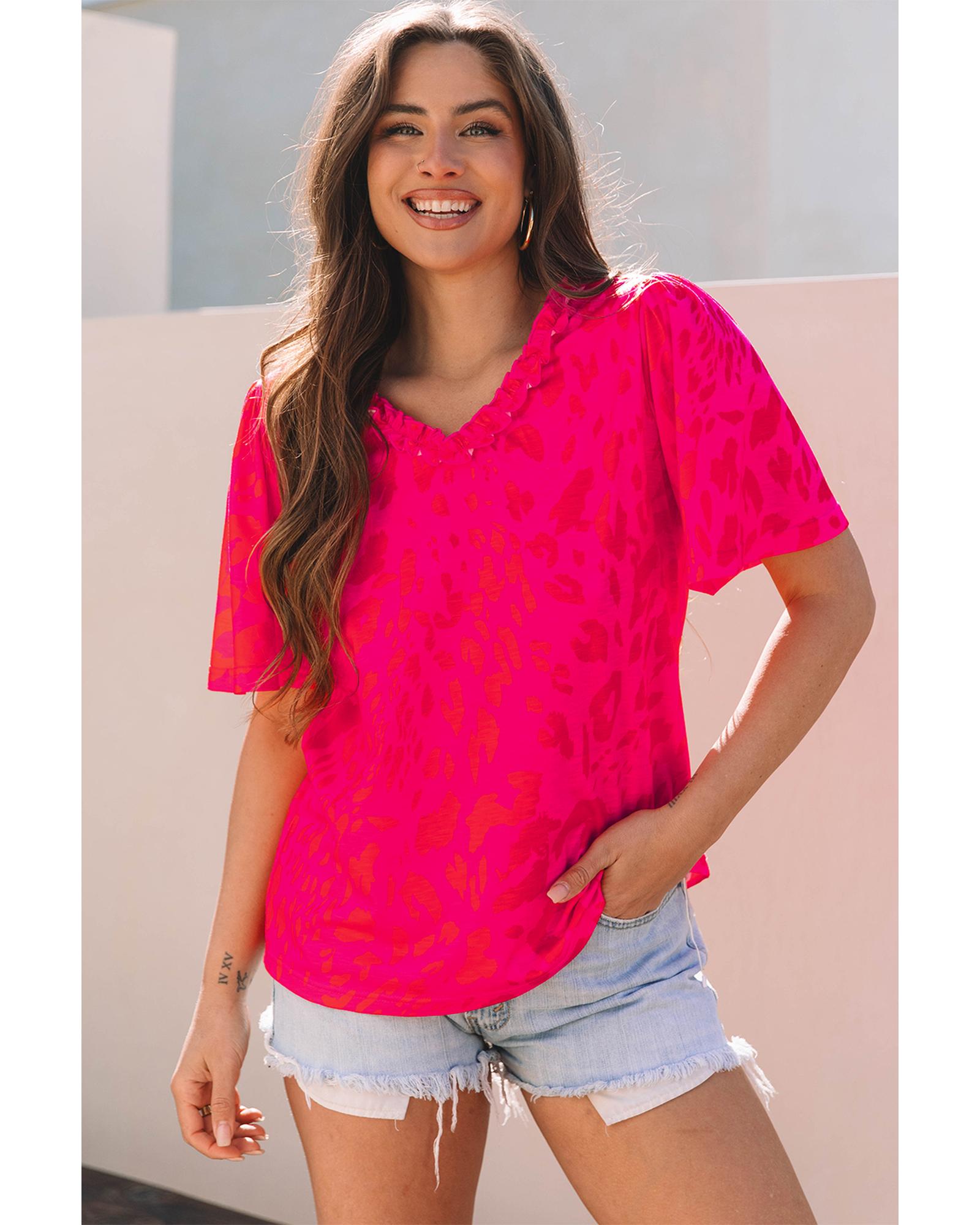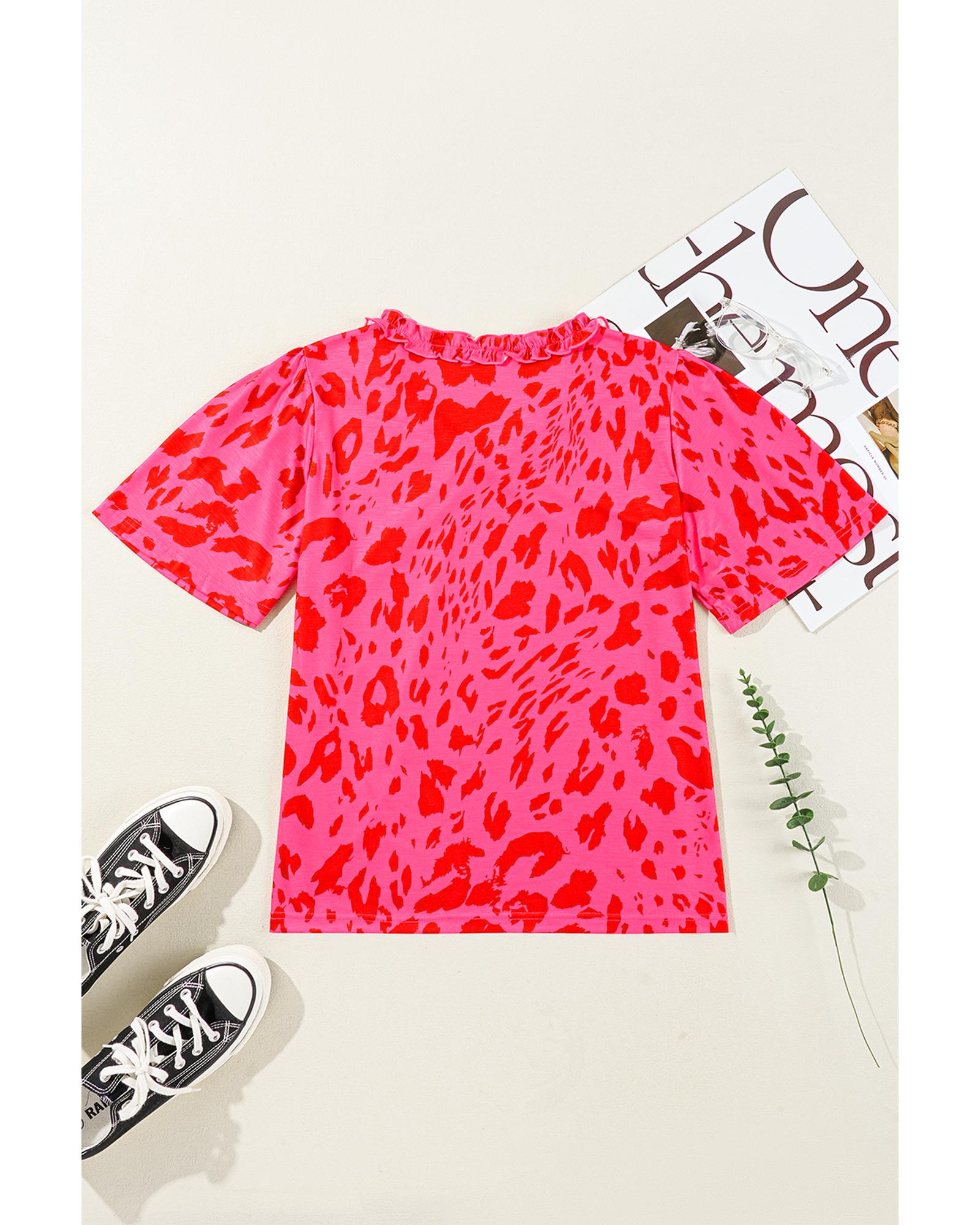 This blouse features a stylish leopard print design with a frilly V-neck and short sleeves. Its relaxed silhouette makes it a versatile piece suitable for casual styling, offering both comfort and fashion.