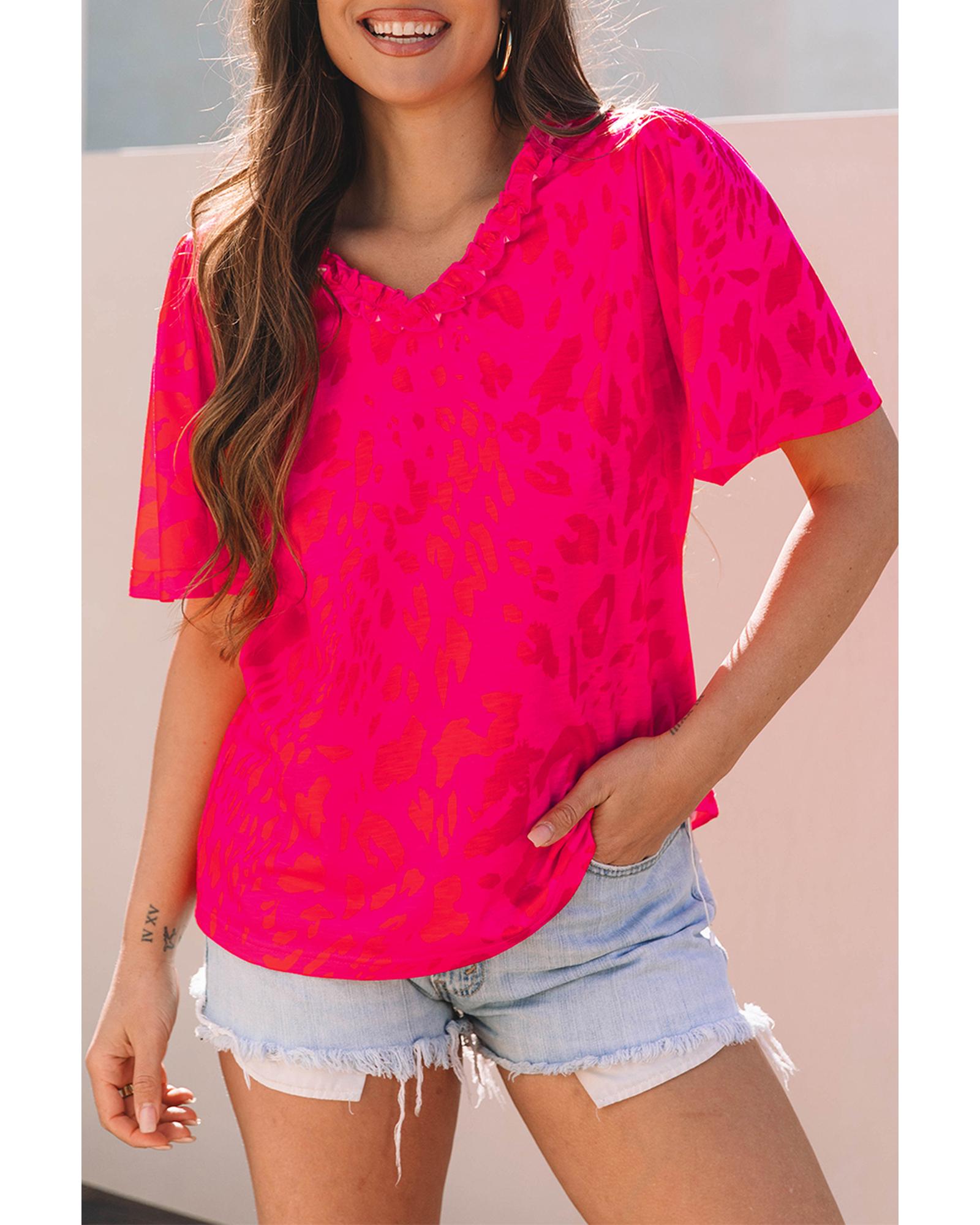 Rose Leopard Frilly V Neck Short Sleeve Blouse – XL