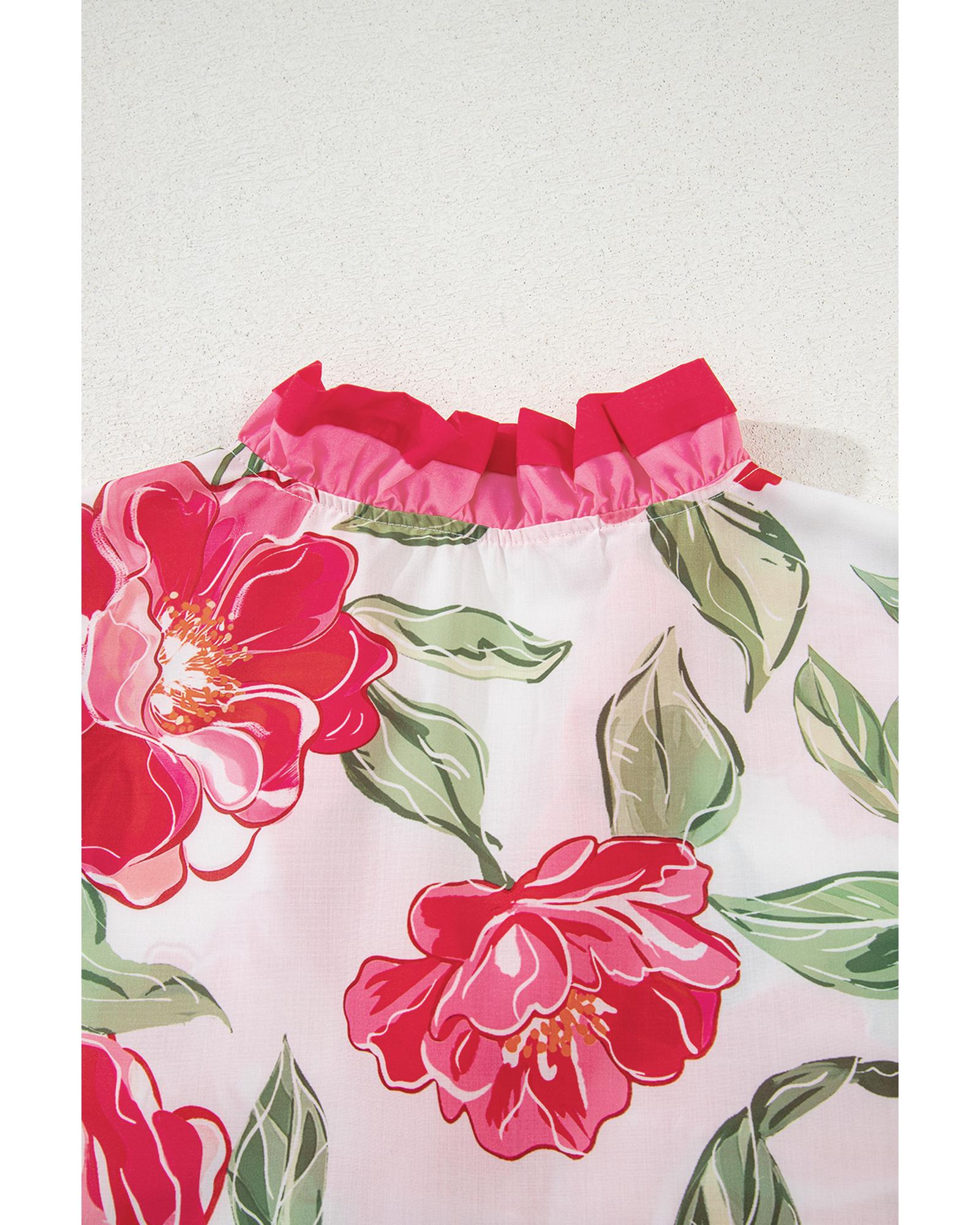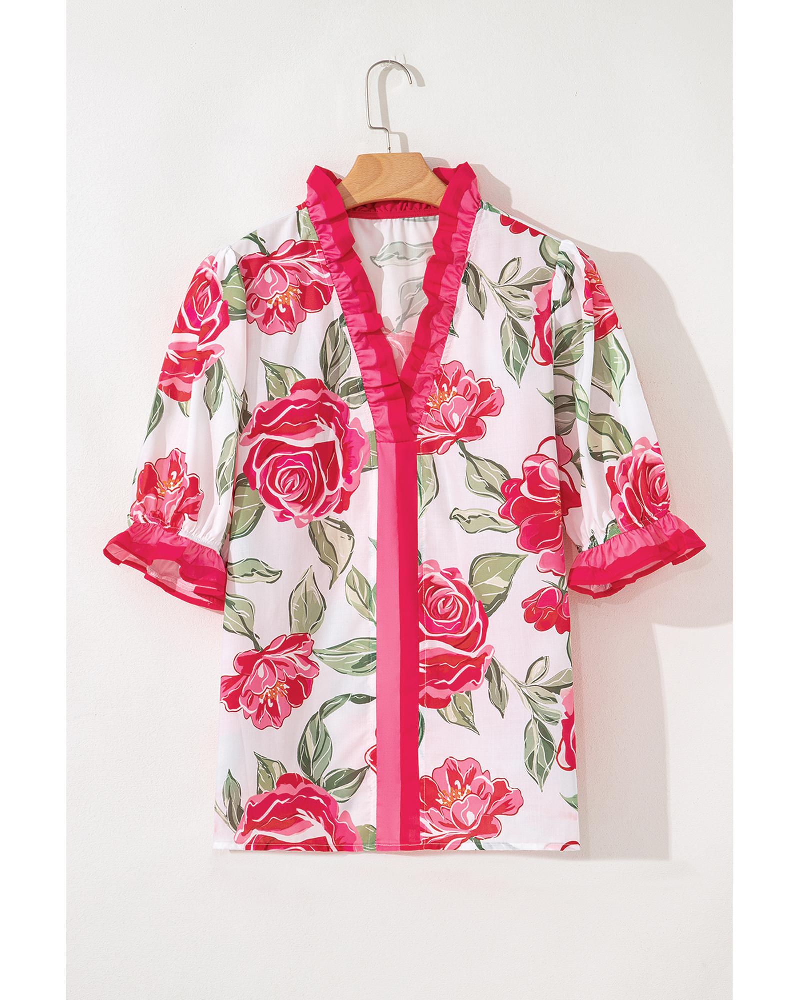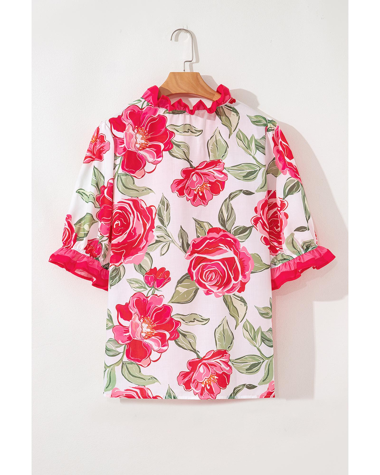 This plus size floral print blouse features a stylish frilled neckline and ruffled puff short sleeves, offering a fashionable and comfortable option for various occasions. Made from lightweight fabric, it provides a comfortable fit and easy wear. The blouse pairs well with jeans, solid pants, and skirts for versatile styling.
