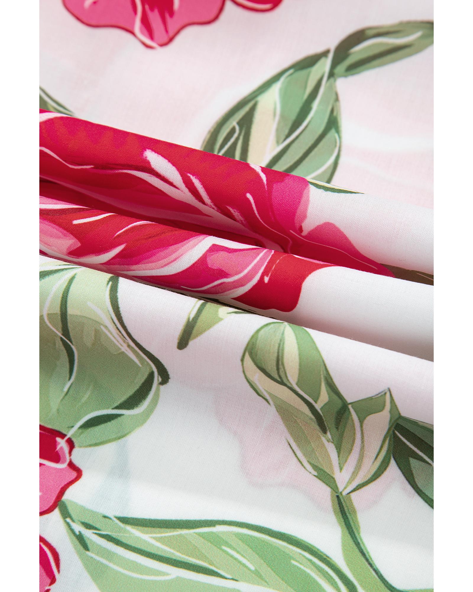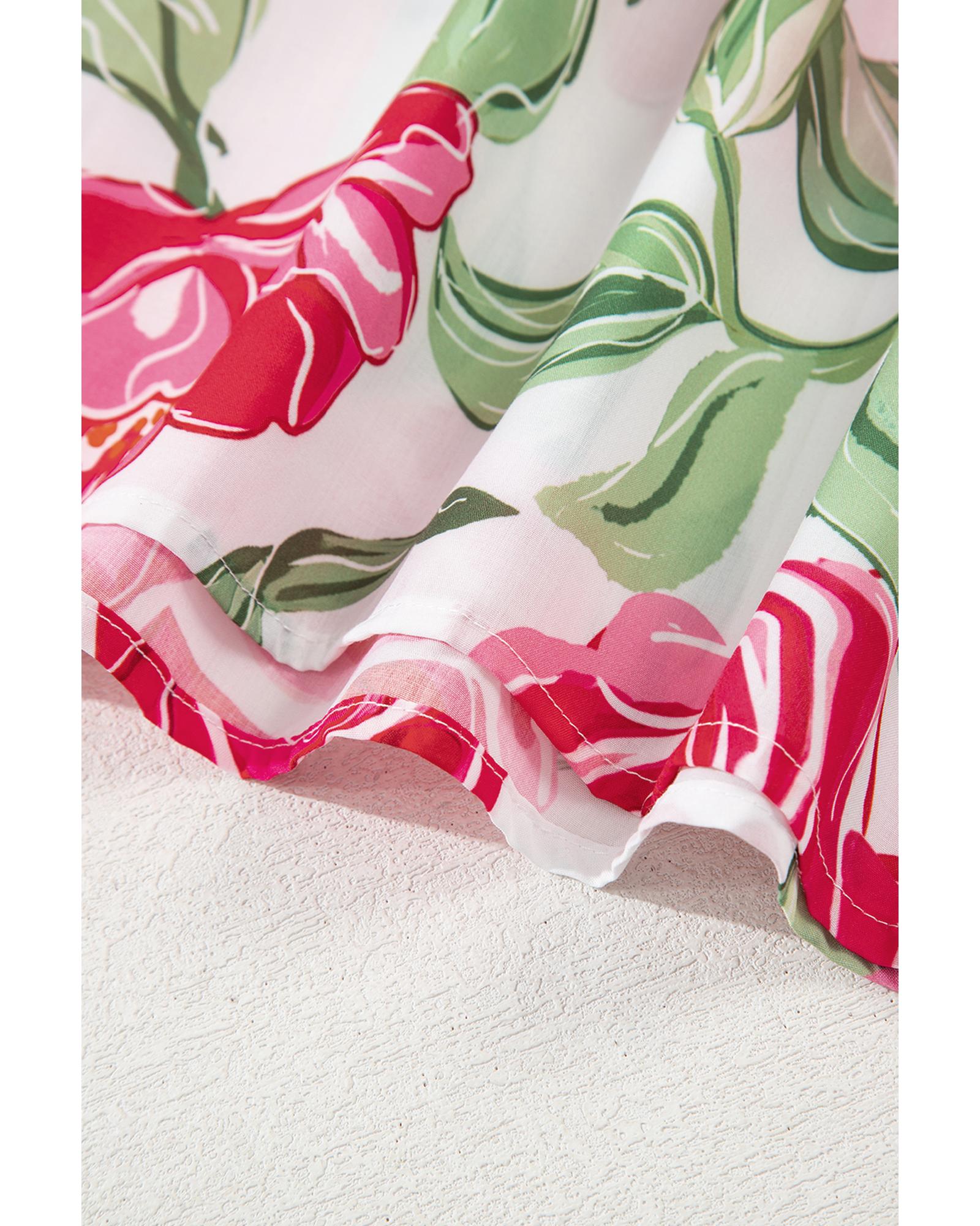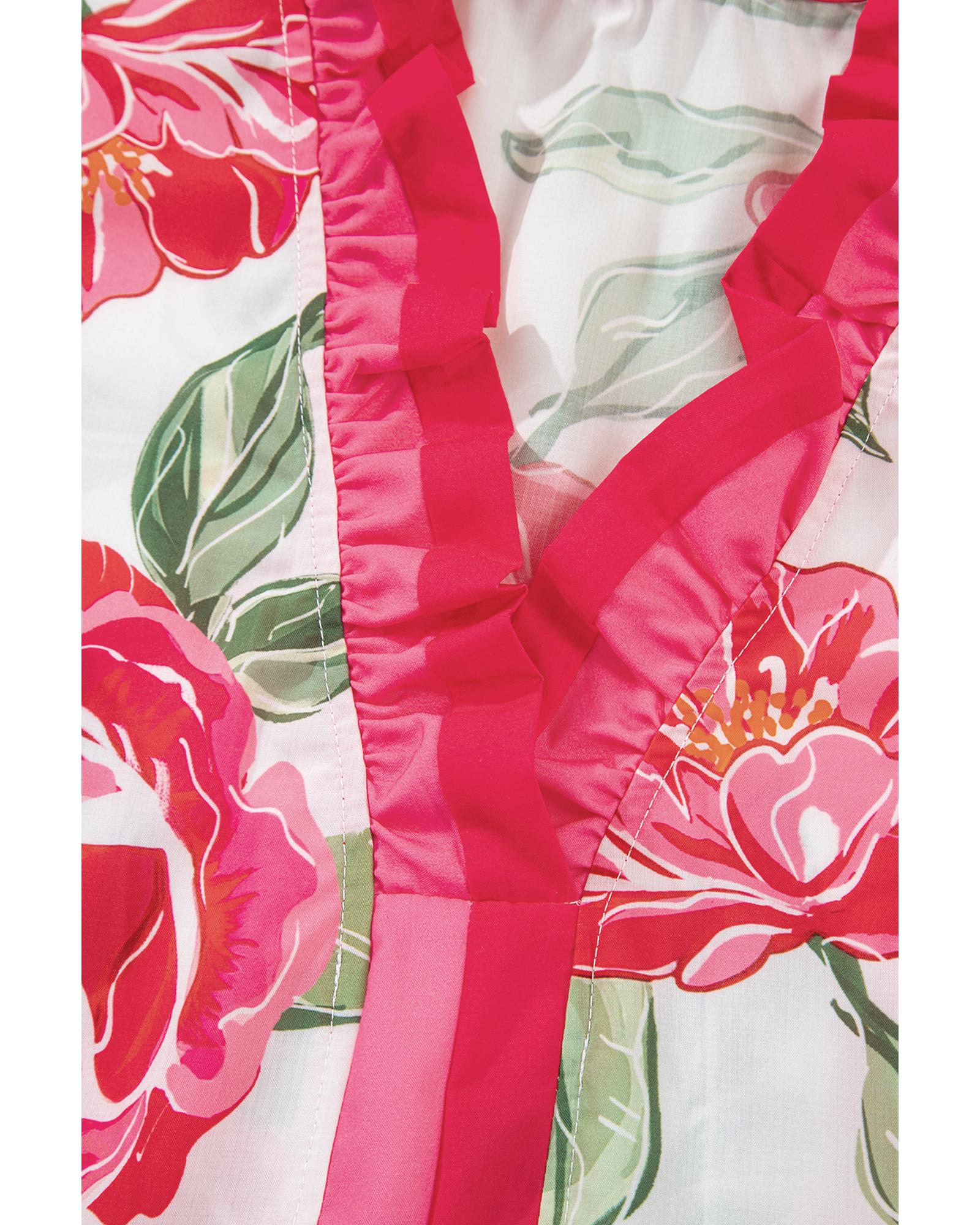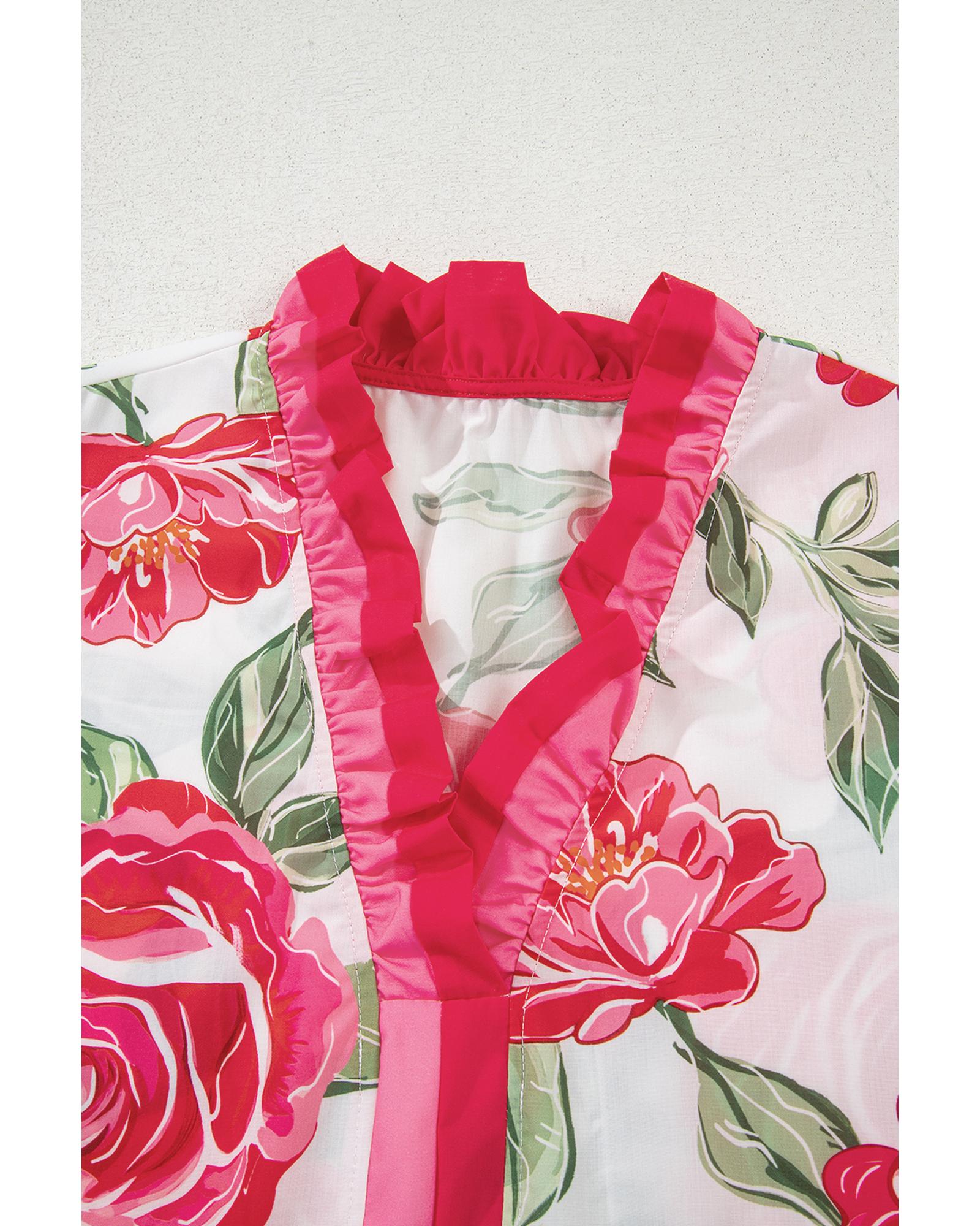 This plus size floral print blouse features a stylish frilled neckline and ruffled puff short sleeves, offering a fashionable and comfortable option for various occasions. Made from lightweight fabric, it provides a comfortable fit and easy wear. The blouse pairs well with jeans, solid pants, and skirts for versatile styling.