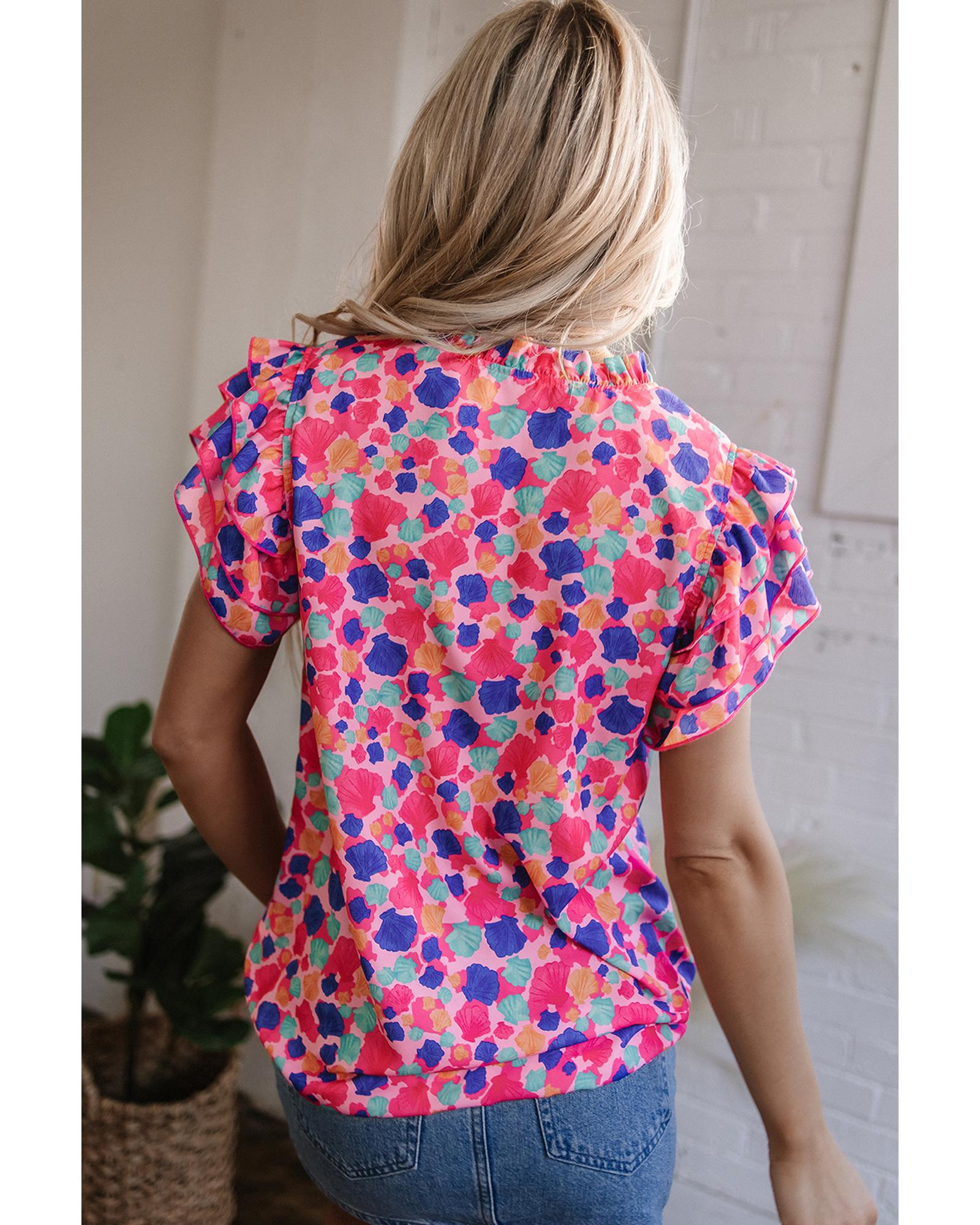 This blouse features an eye-catching abstract print in a vibrant rose red color, combined with a stylish V neckline and playful ruffled sleeves. Its loose silhouette offers a comfortable fit, making it suitable for various occasions.