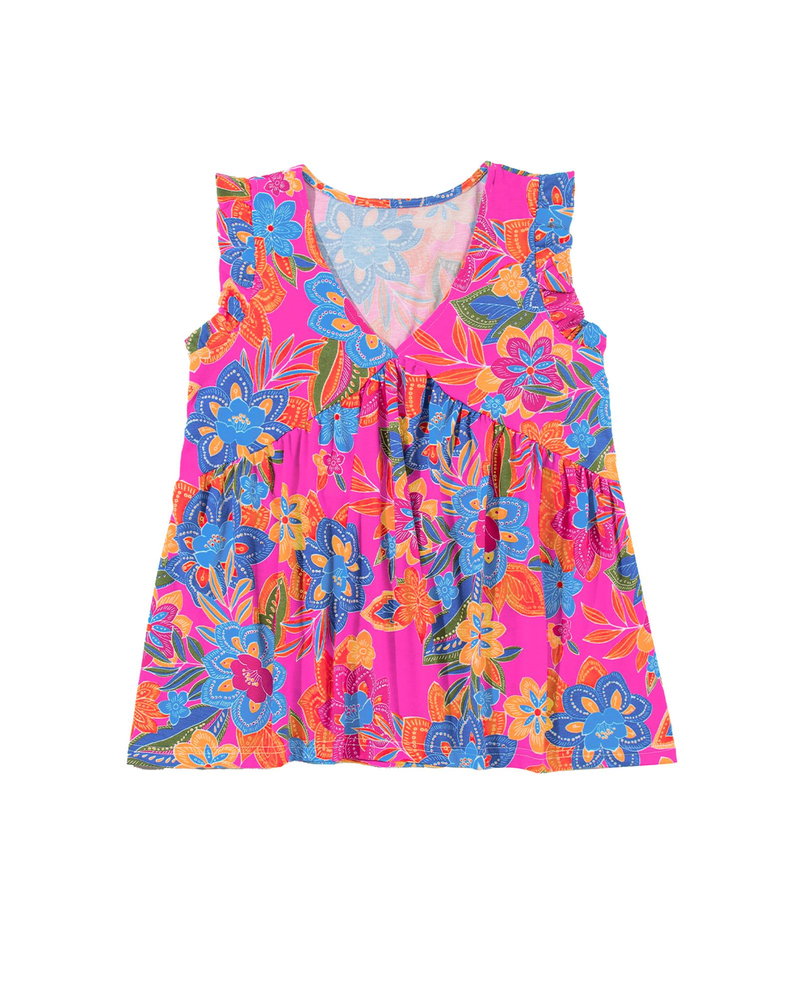 This tank top features a vibrant boho floral pattern and a stylish flounce design, creating a fashionable and fresh look. The V neck cut enhances the feminine charm, making it suitable for various casual occasions. Its trendy fitted silhouette pairs well with jeans, sandals, and accessories, making it a versatile addition to your wardrobe.