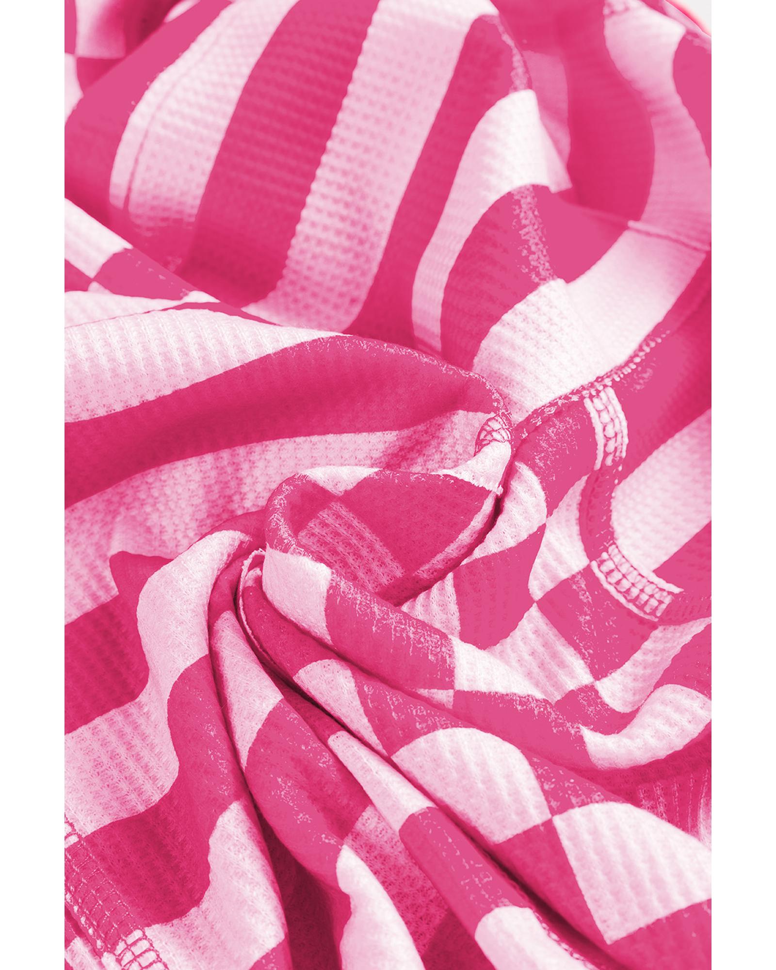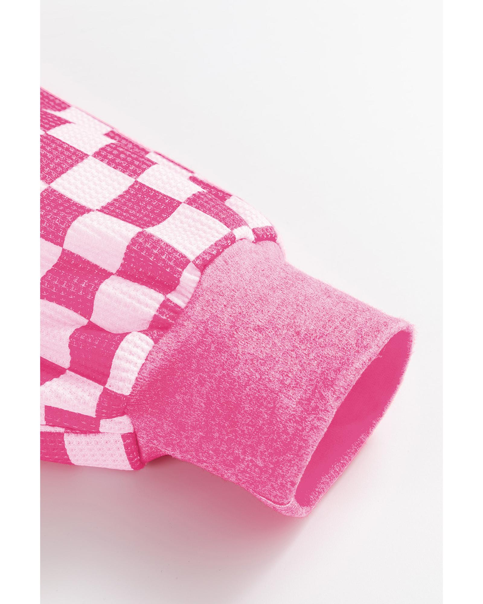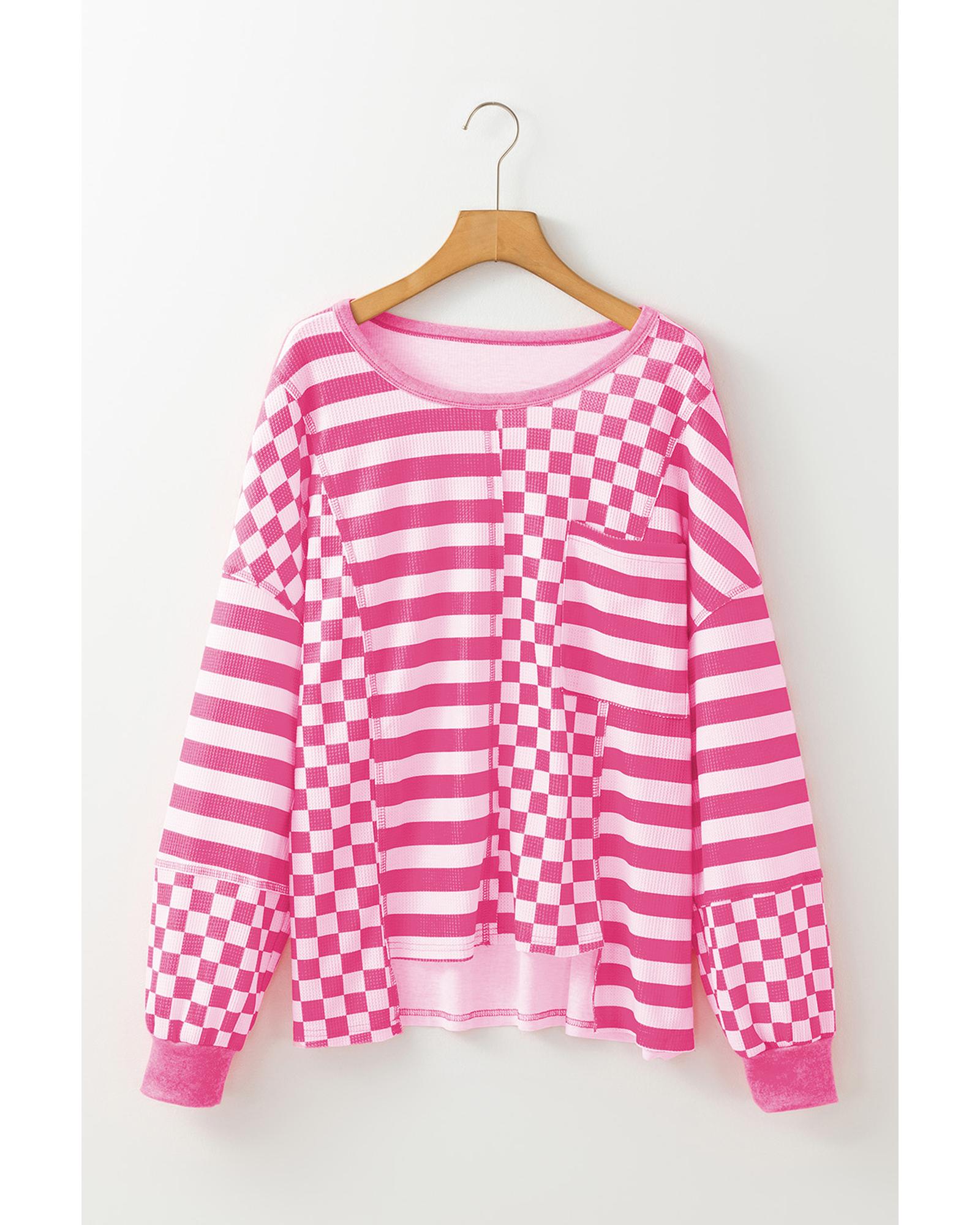 Rose Red Checkerboard Striped Patchwork Lantern Sleeve Pocketed Blouse – M